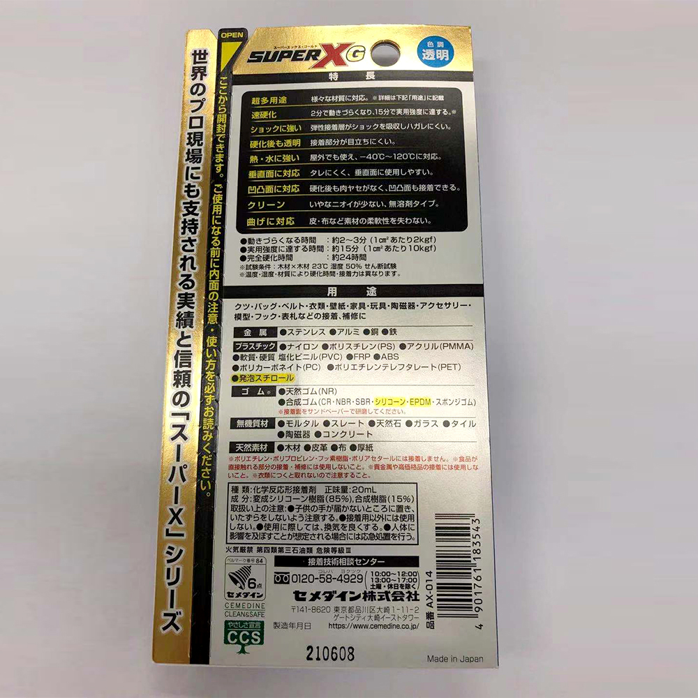 熱・水・ショックに強い、屋外にも使えるスーパーXの性能はそのままに、高透明・ハイスピードを実現しました。シンナーを含まれない環境対応型で、幅広く使える速硬化型の高性能多用途接着剤です。
