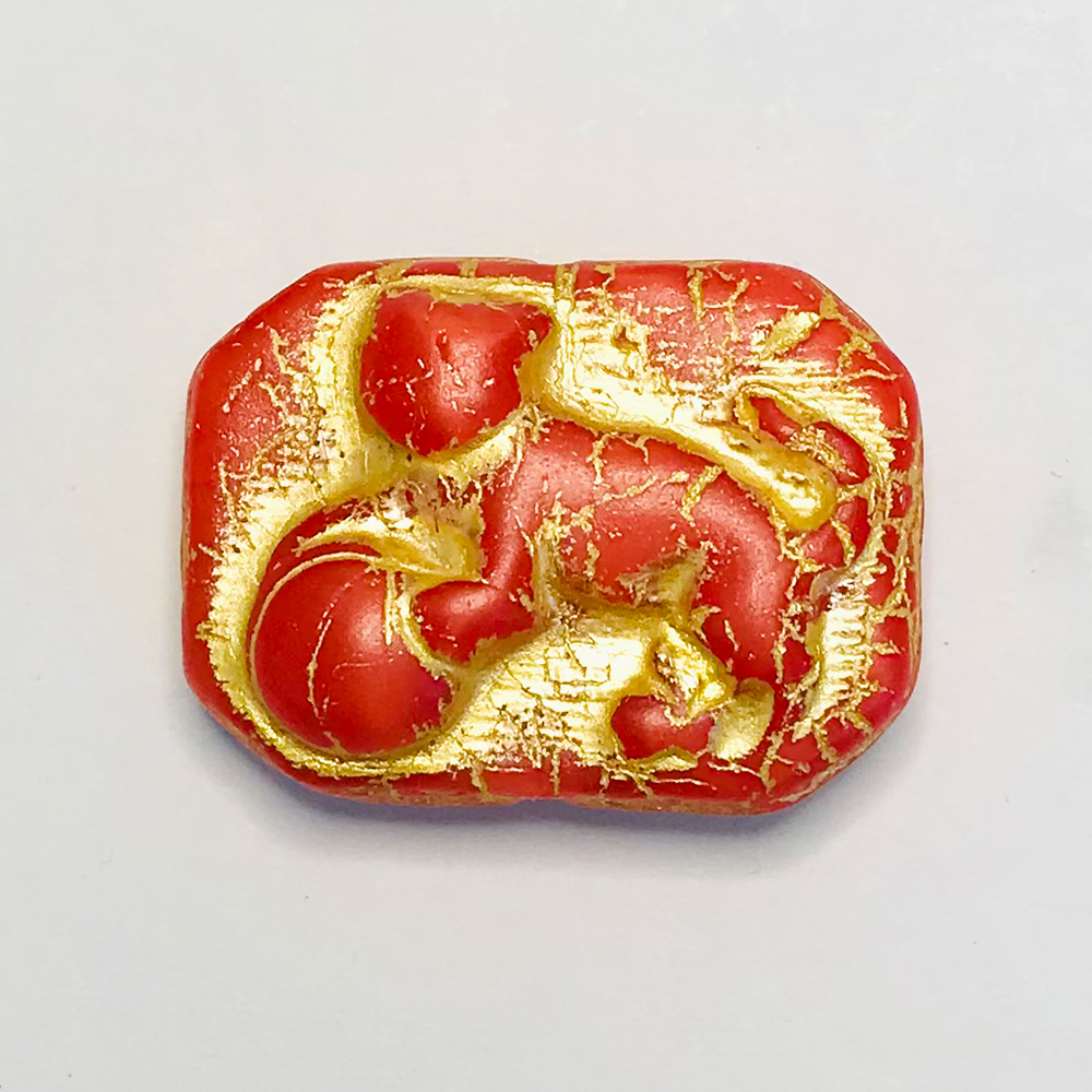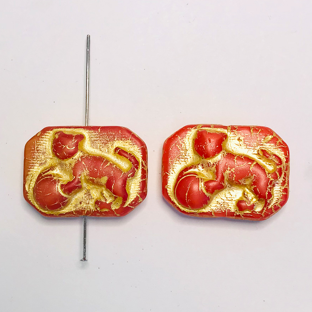 ボールを持ったチェコビーズ 猫 マットレッド/ゴールド 22x16mm (4ヶ)
