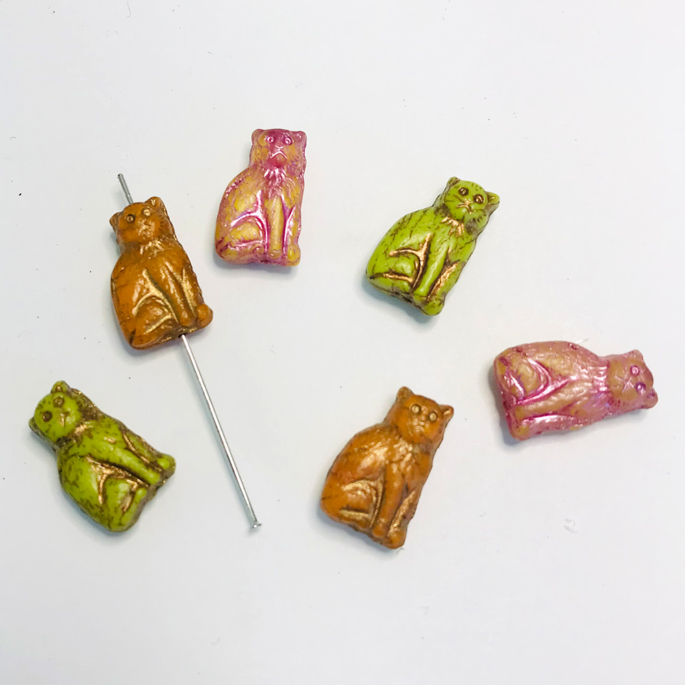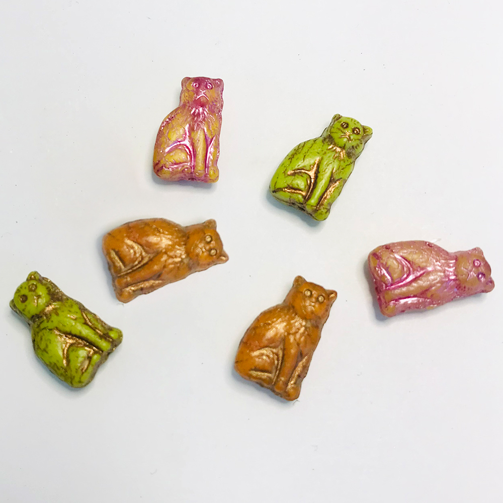 チェコビーズ 猫 マットグリーン/レッド ミックスカラー 15x9mm(4ヶ)