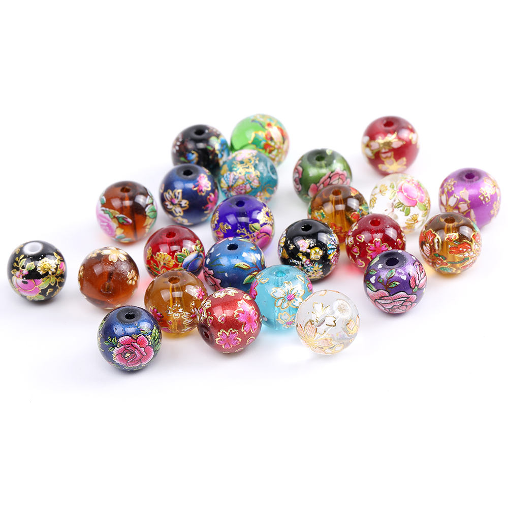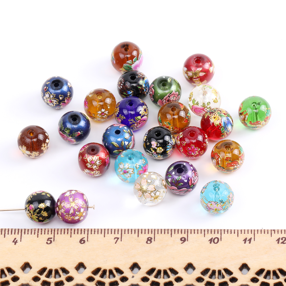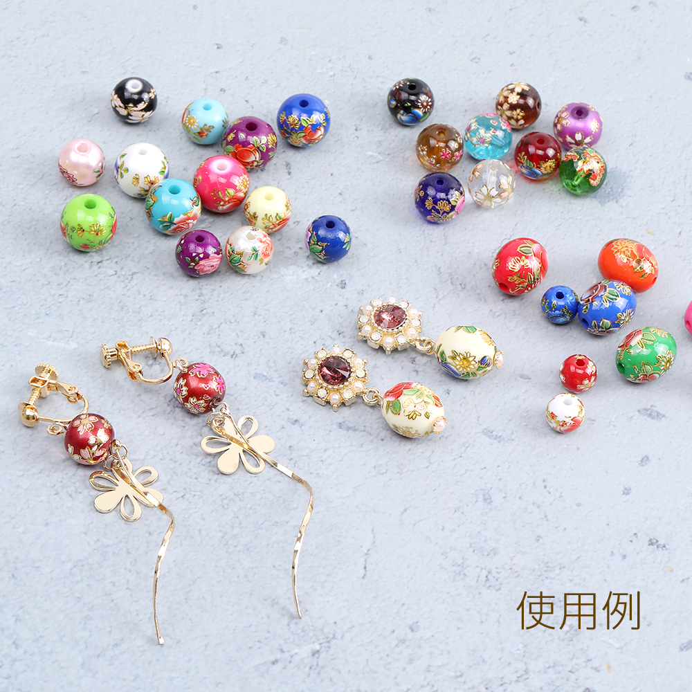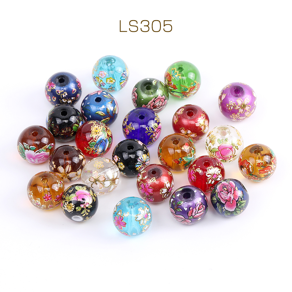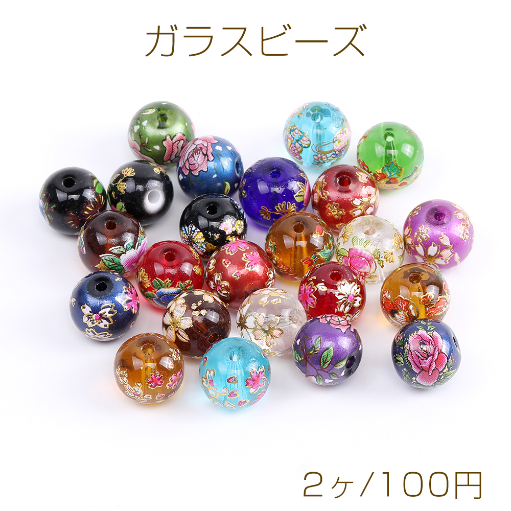 ガラスビーズ フラワー柄 丸玉 10mm クリアカラー ミックスカラー(2ヶ)