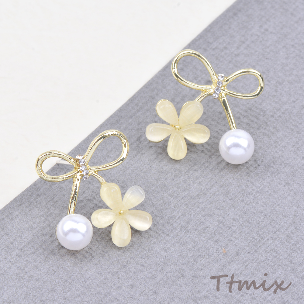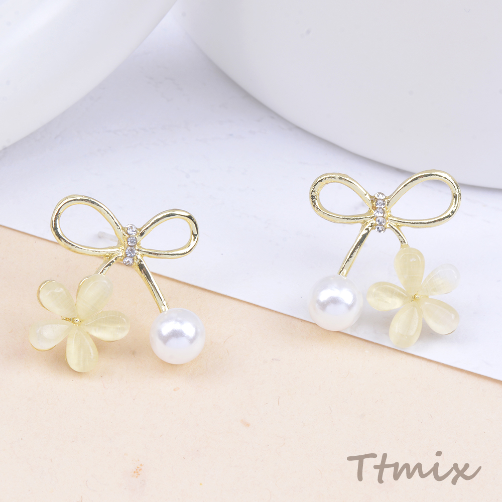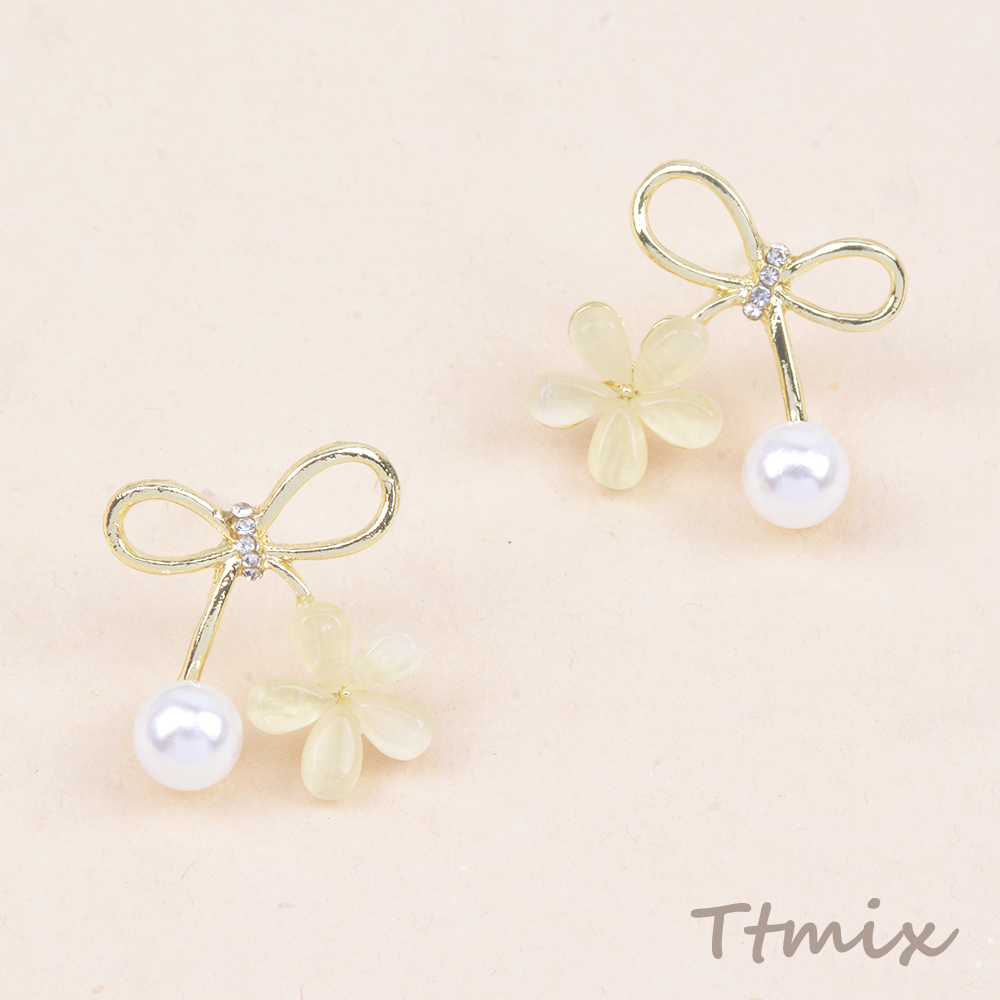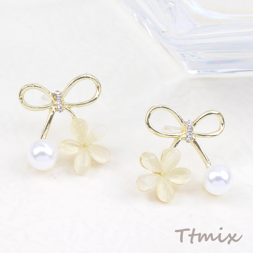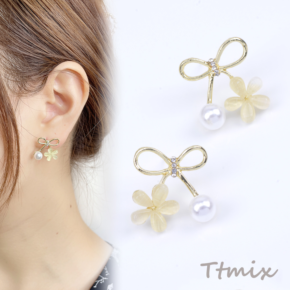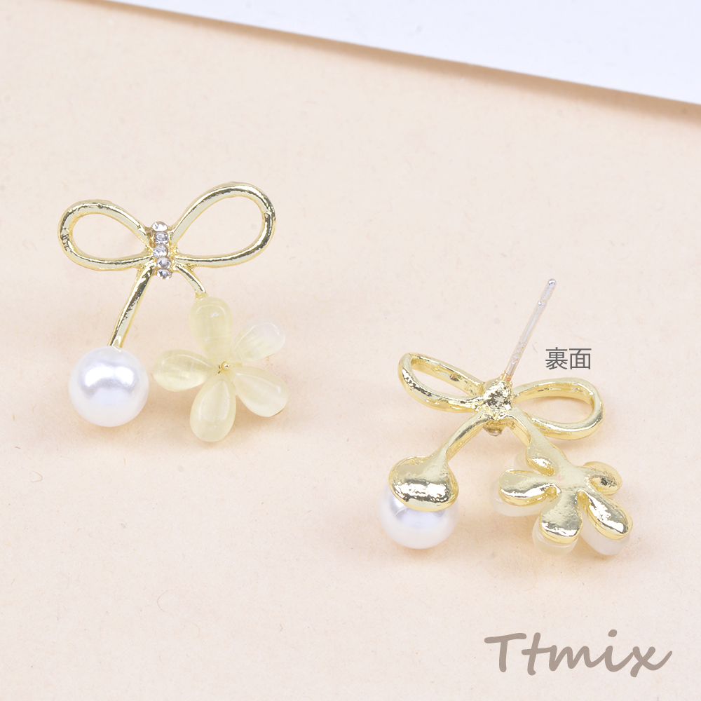 デザインピアス フラワー&パール付きリボンピアス 18×18mm ゴールド(1ペア)