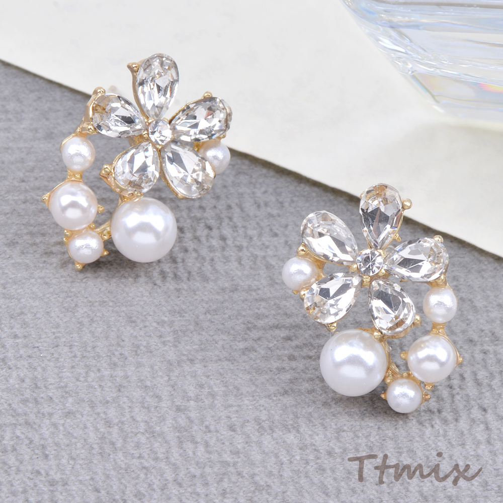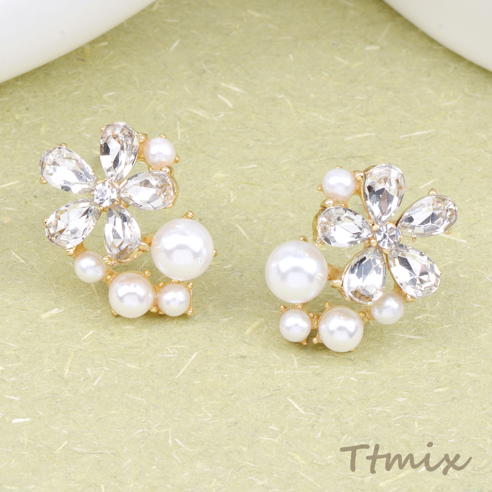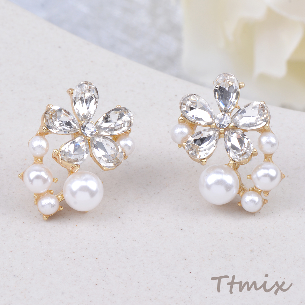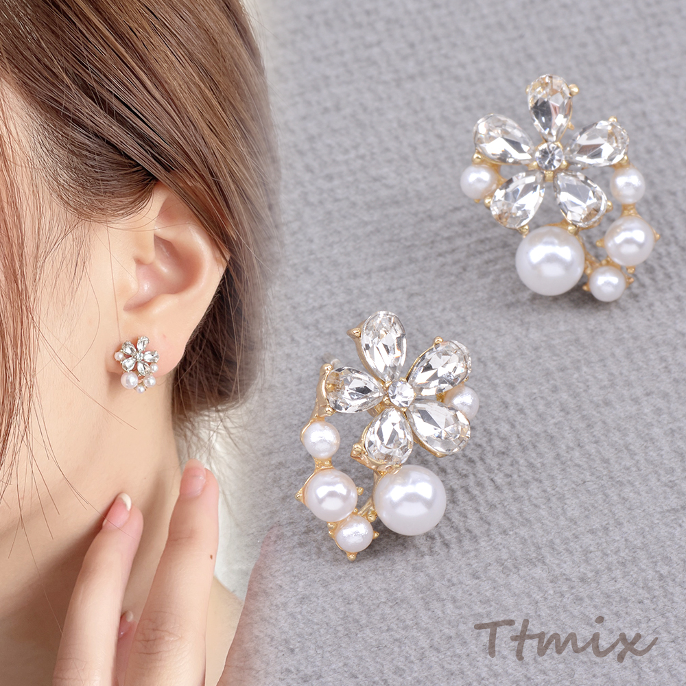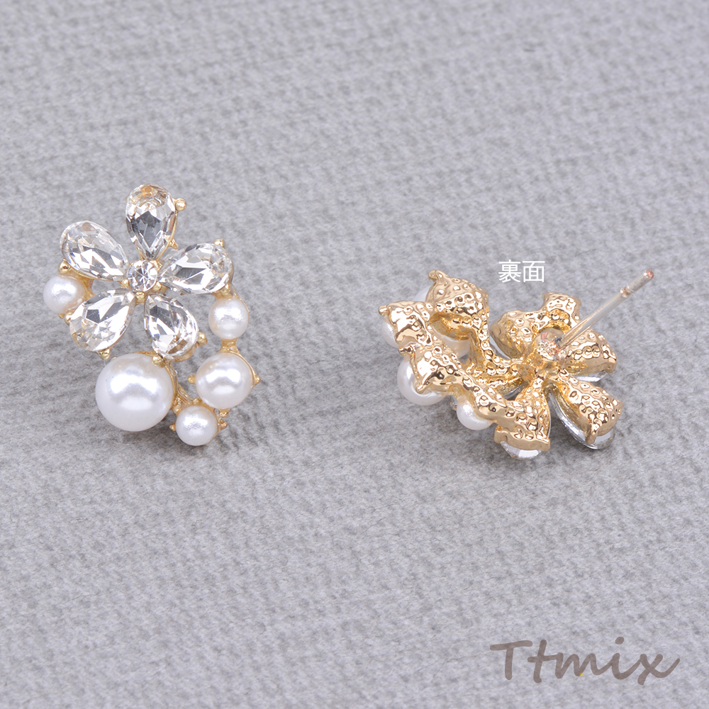 デザインピアス ラインストーン&パール付きフラワーピアス 11×17mm ゴールド(1ペア)