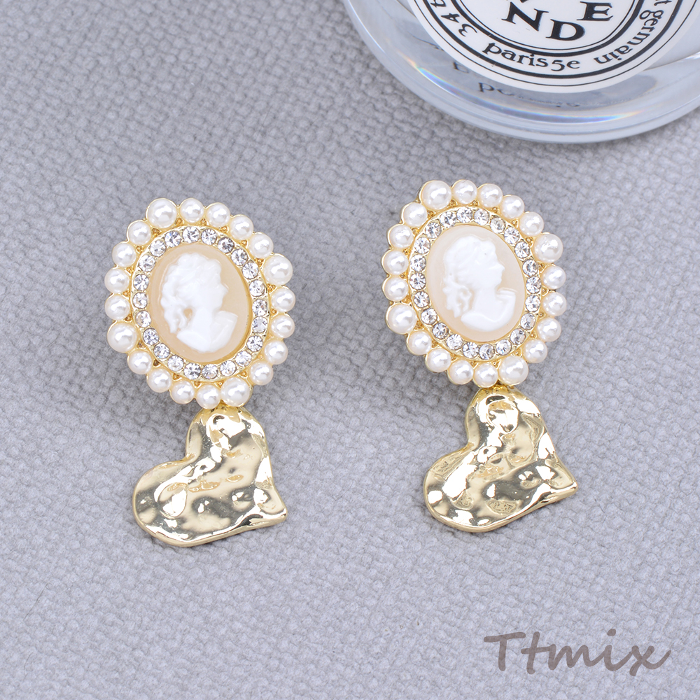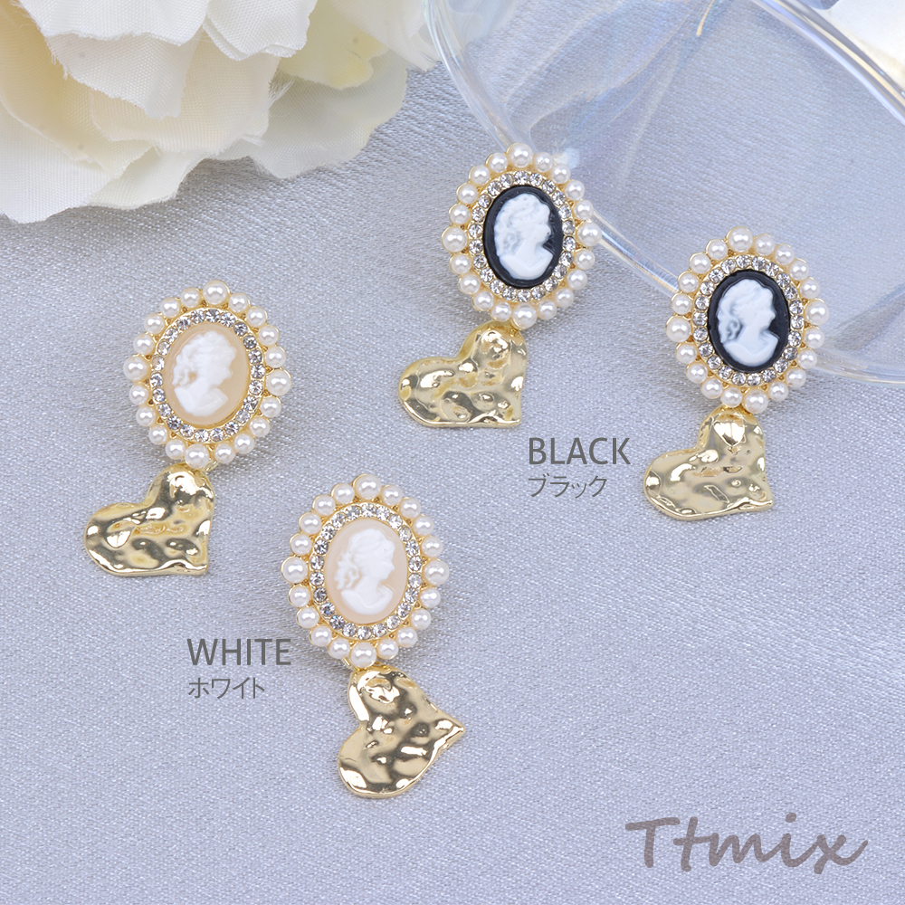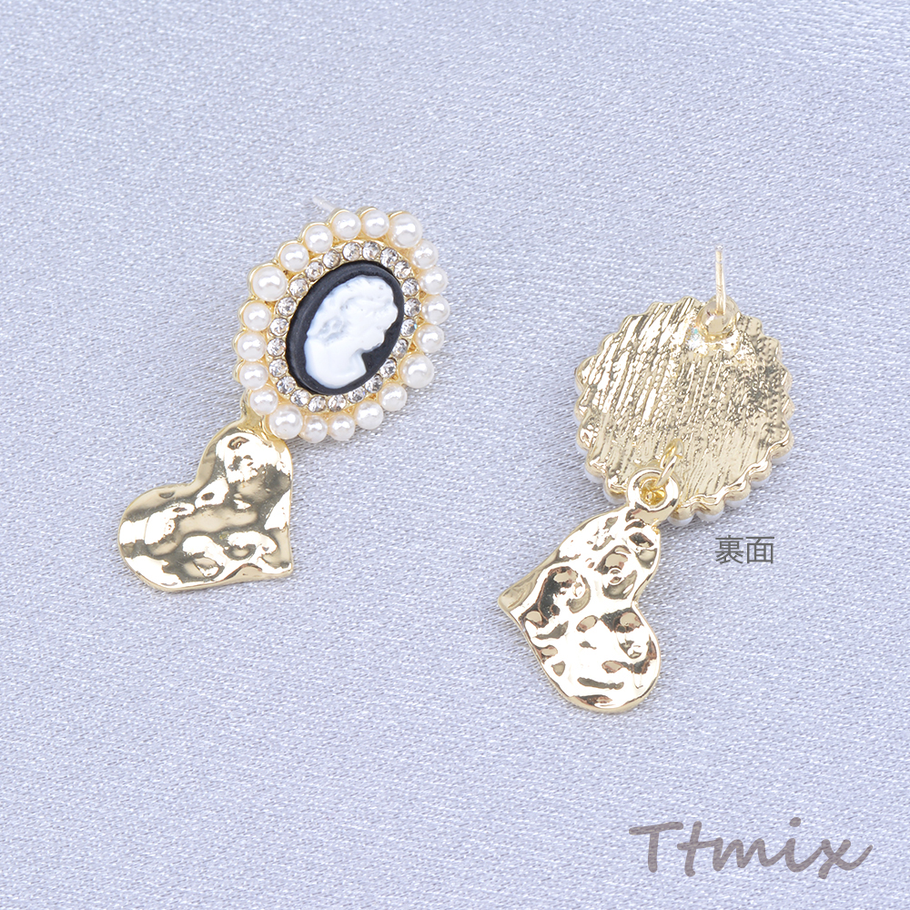 デザインピアス ラインストーン&パール付きカメオピアス ハート型 16×33mm ゴールド(1ペア)