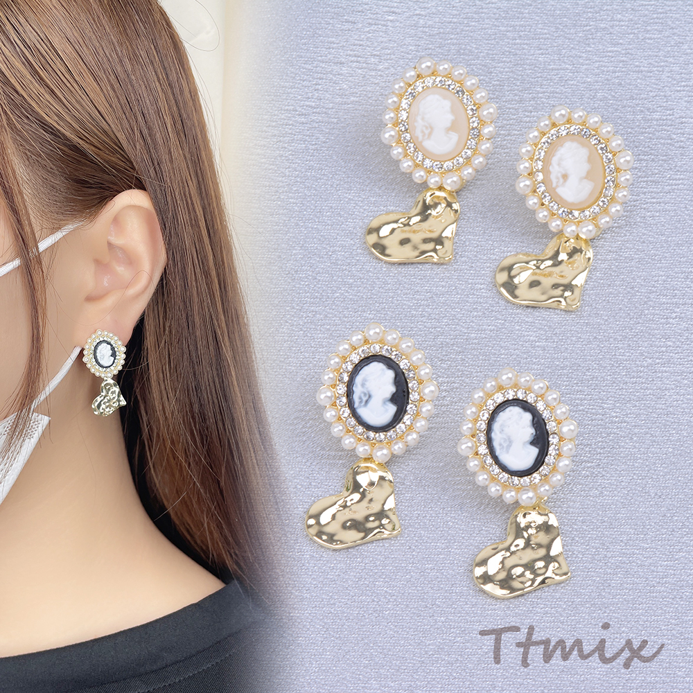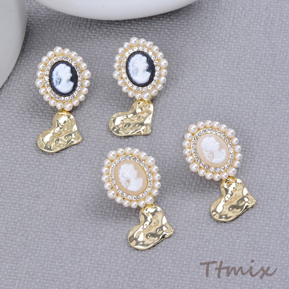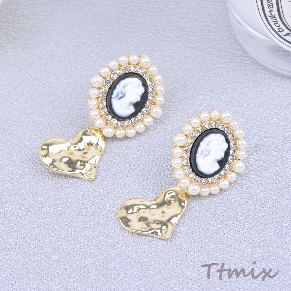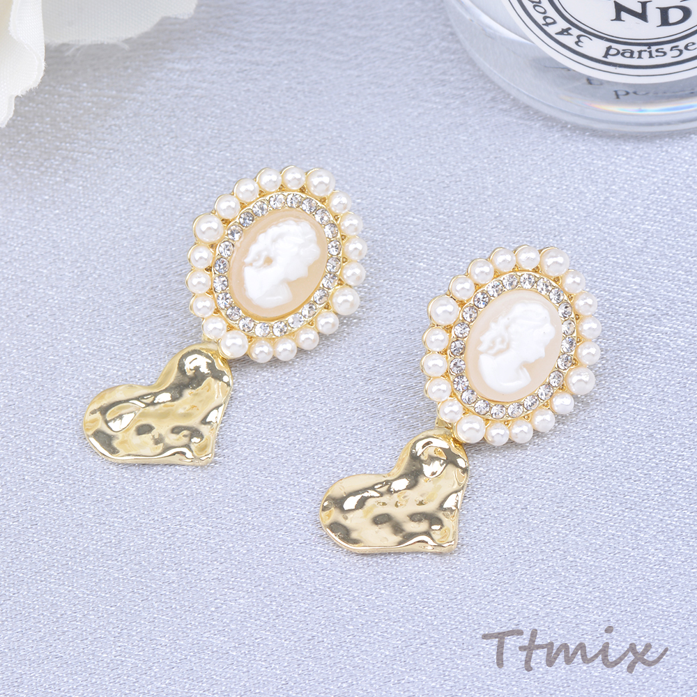 デザインピアス ラインストーン&パール付きカメオピアス ハート型 16×33mm ゴールド(1ペア)