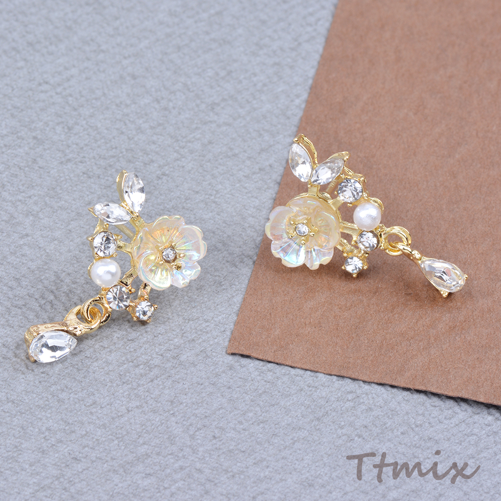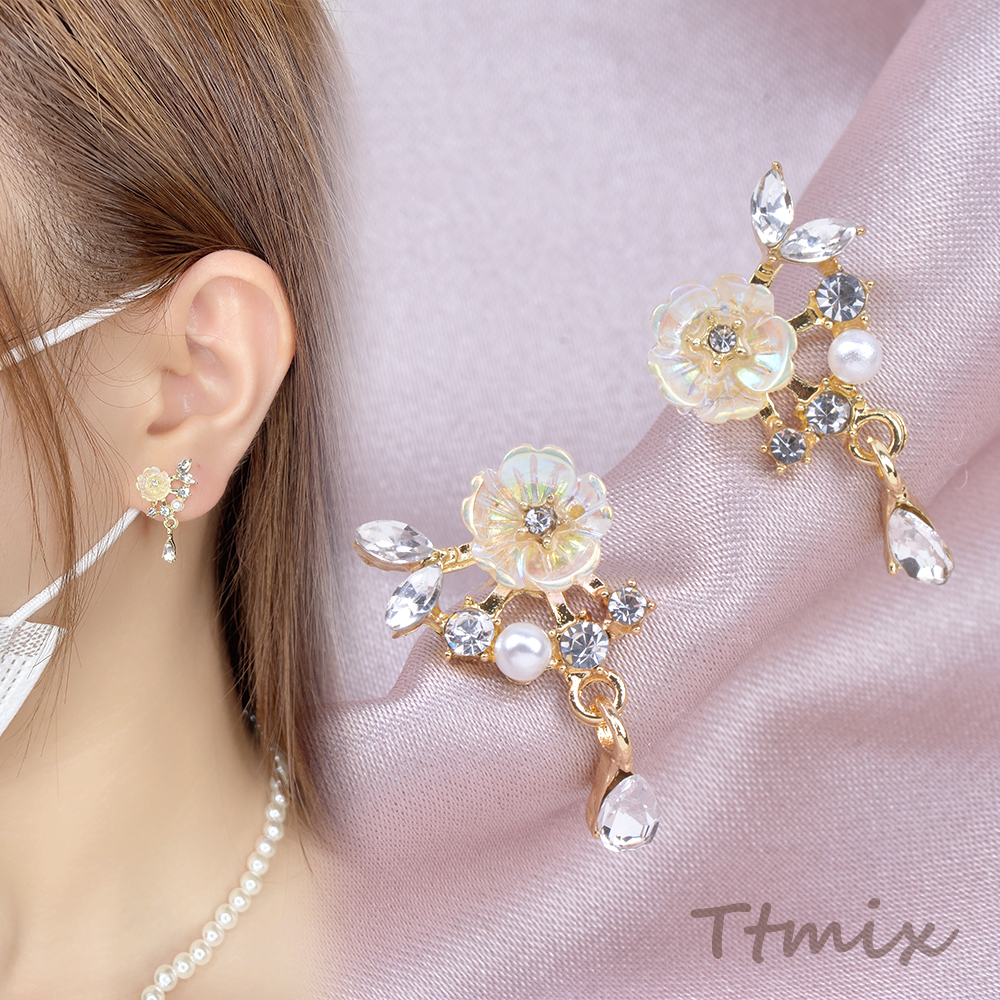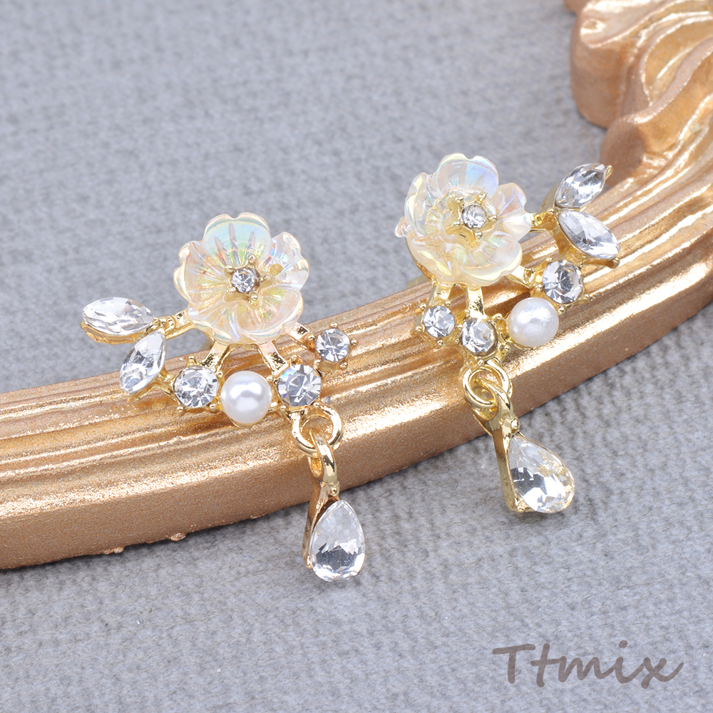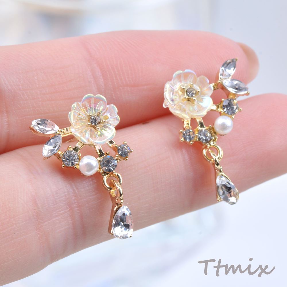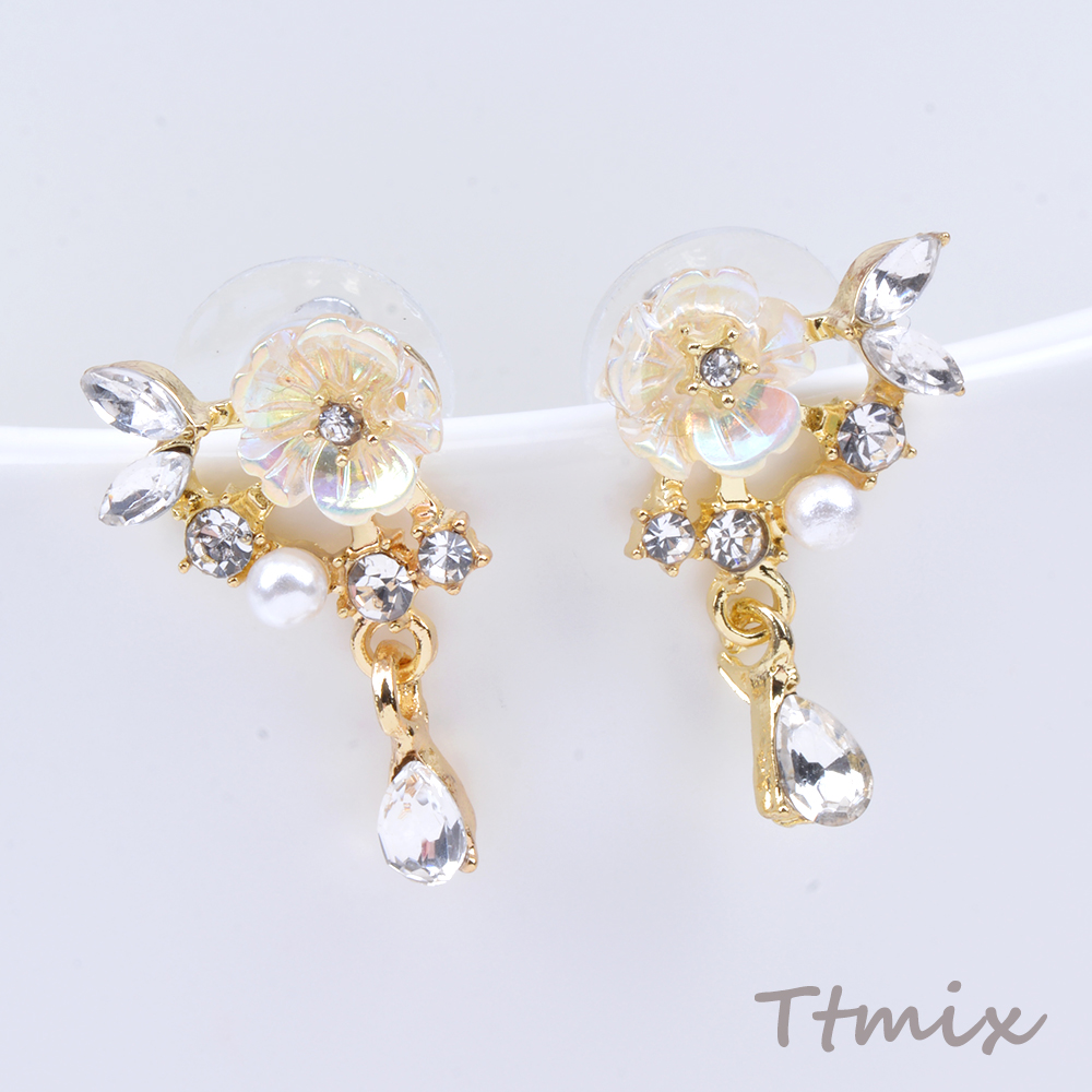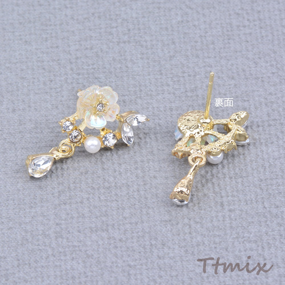 デザインピアス フラワー パール&ラインストーン付き 13×22mm ゴールド(1ペア)