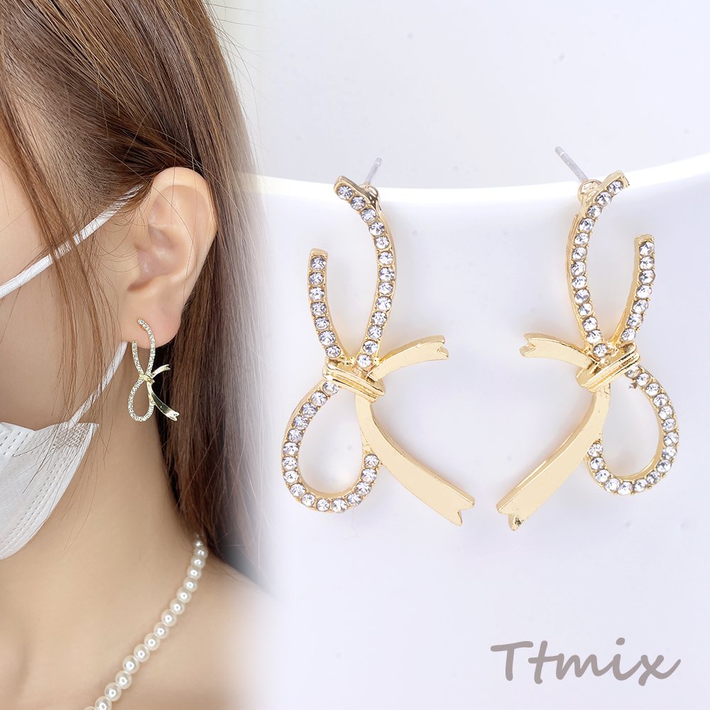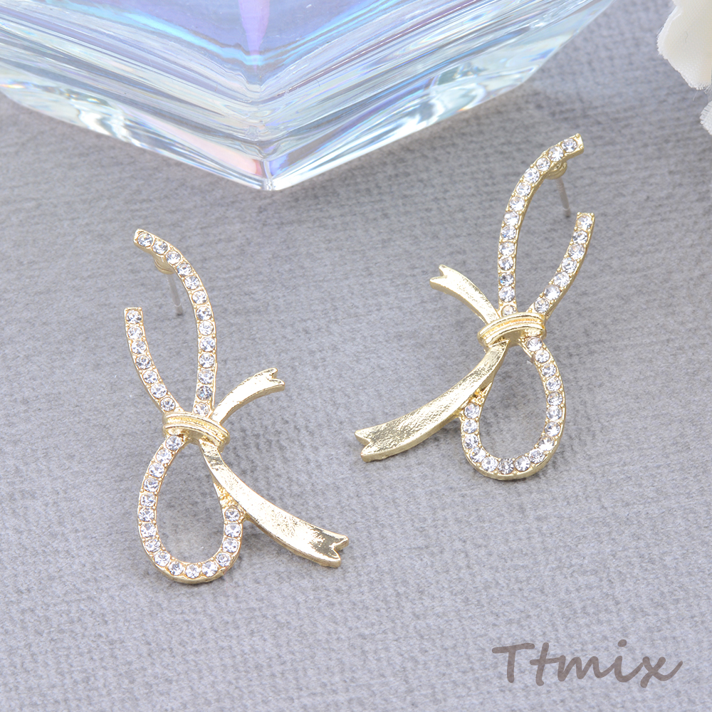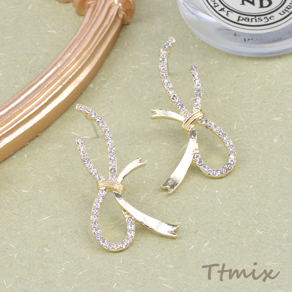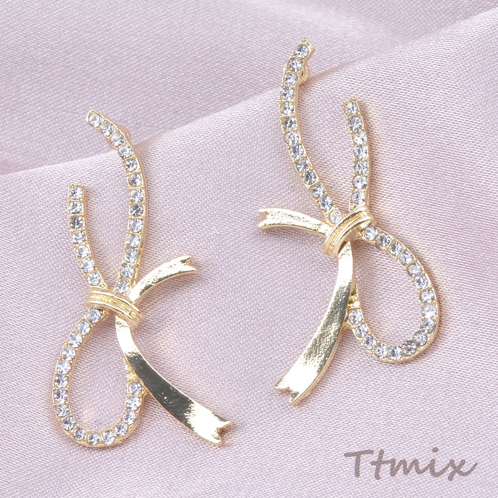 デザインピアス リボン ラインストーン付き 18×36mm ゴールド(1ペア)