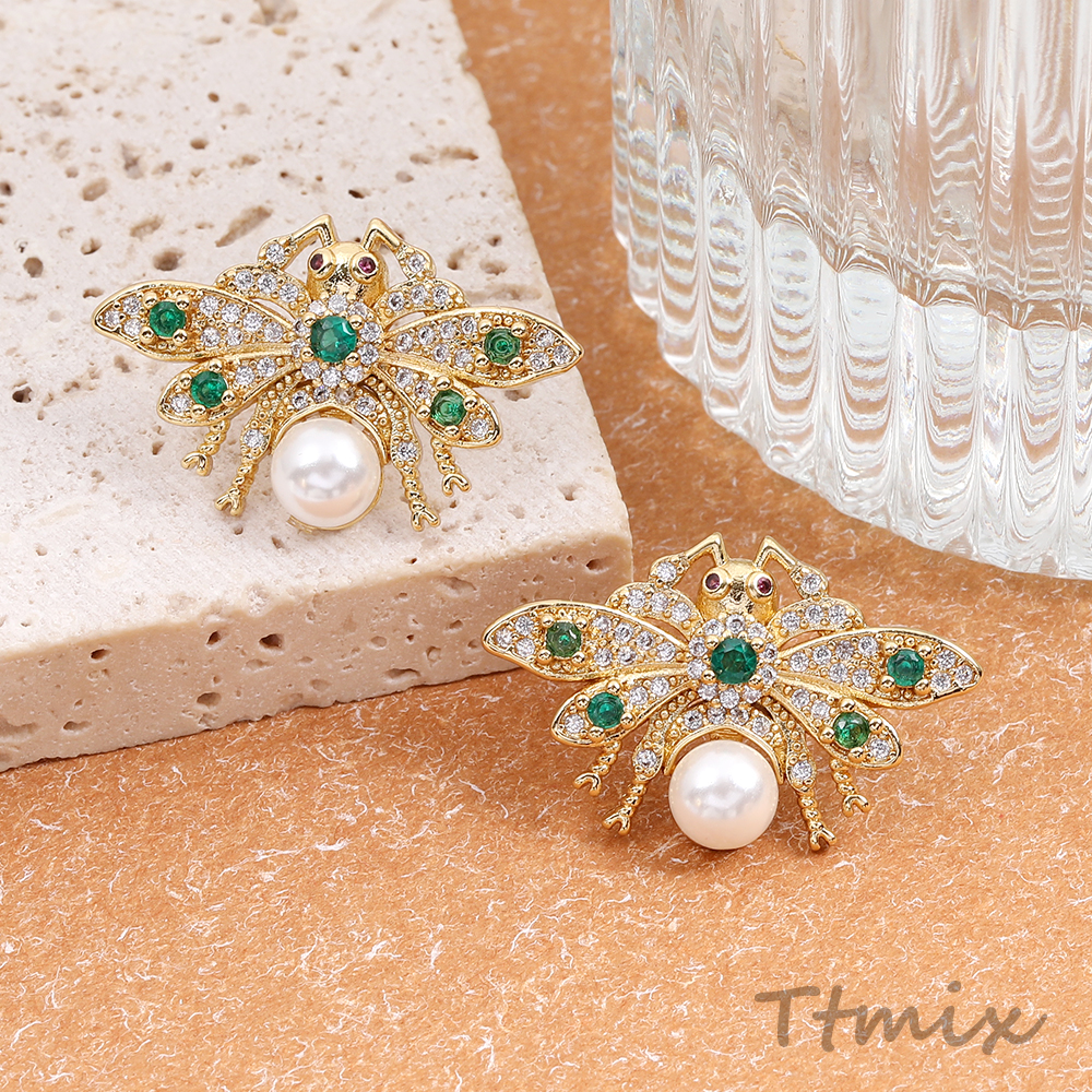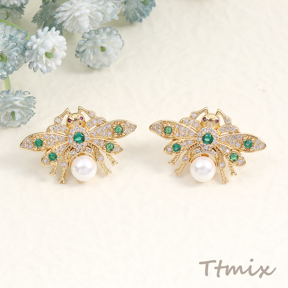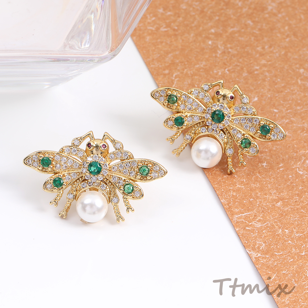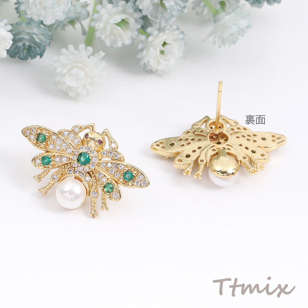 高品質ジルコニアピアス デザインピアス パール付きミツバチ 17×27mm ゴールド(1ペア)