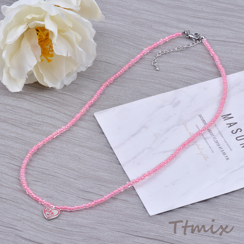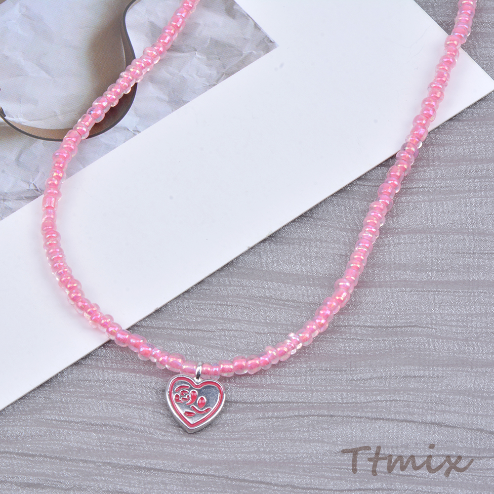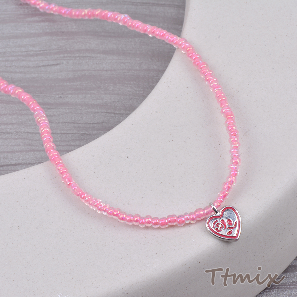ガラスビーズネックレス ハート型付き ピンク(1連)