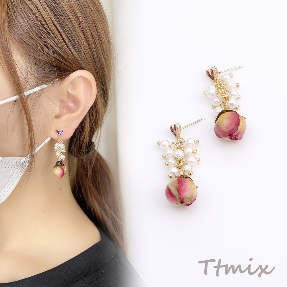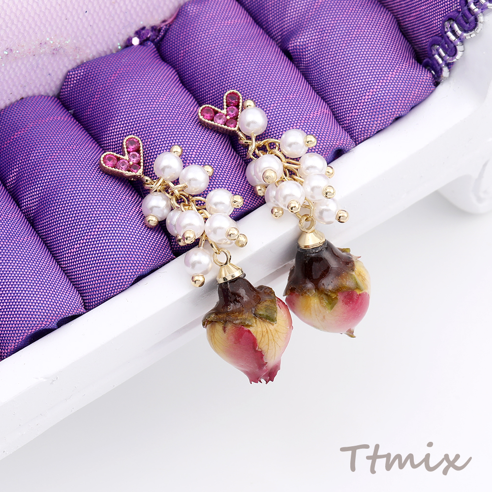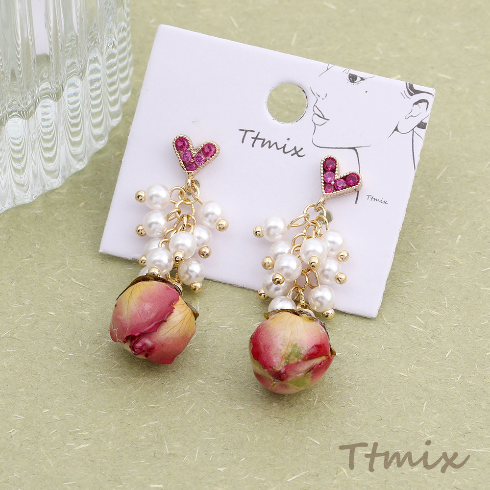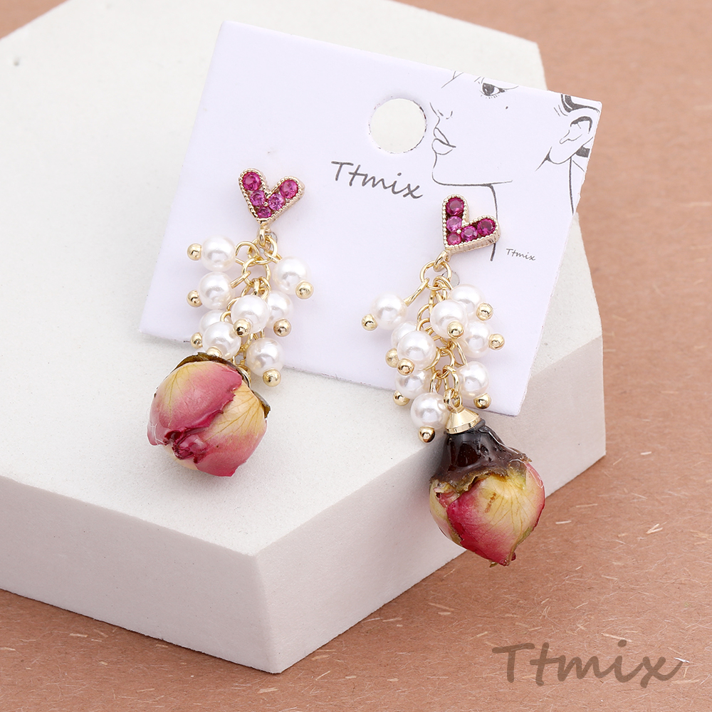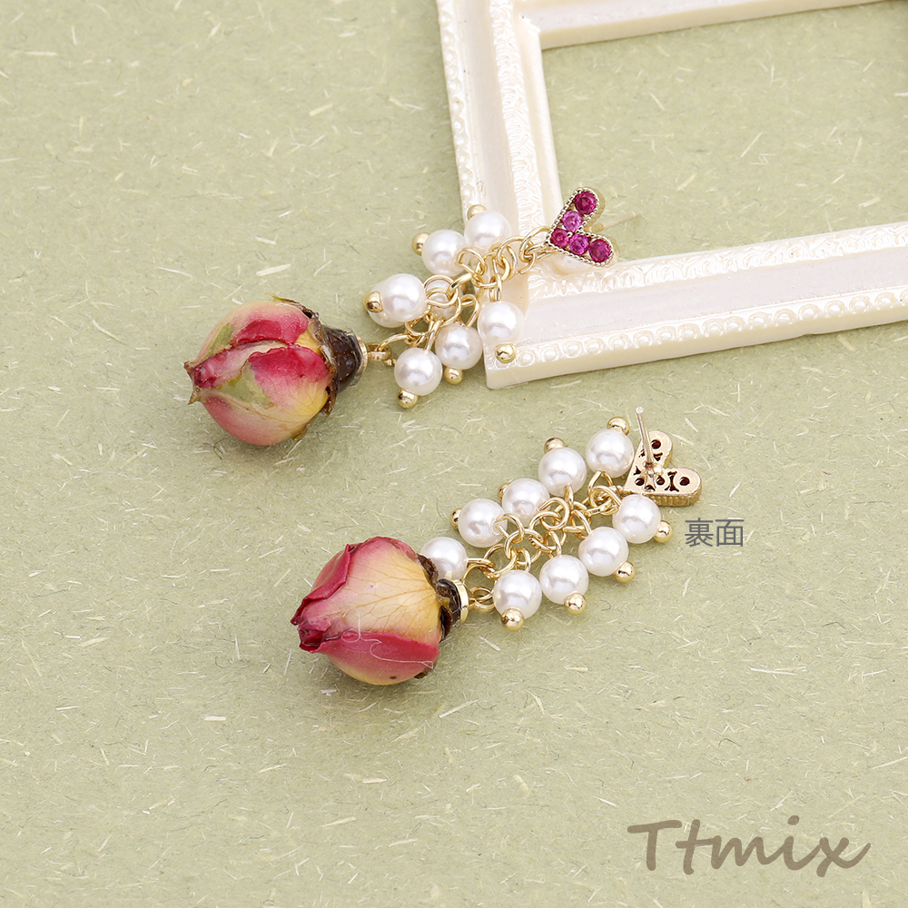 デザインピアス ハート型 パールタッセル フラワー バラ 12×40mm(1ペア)