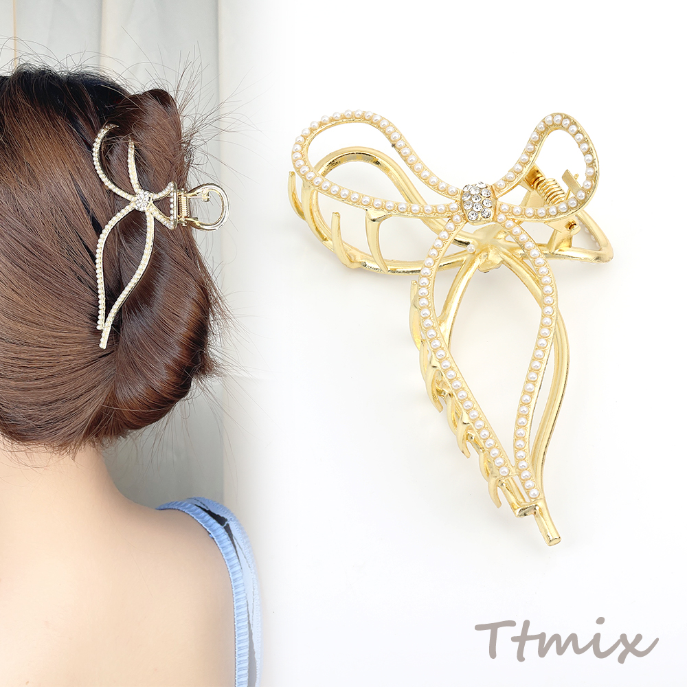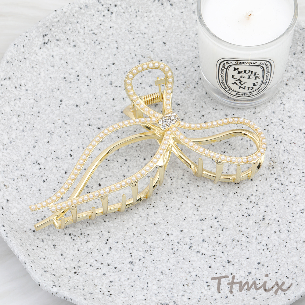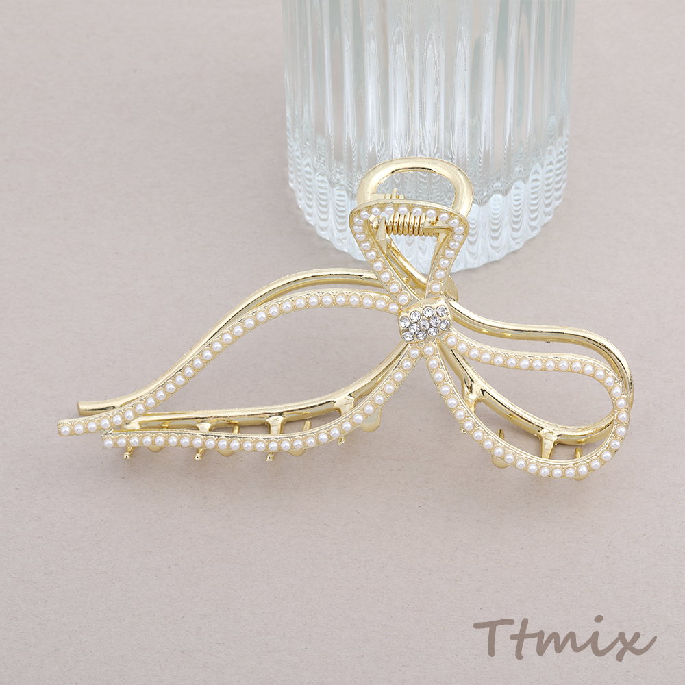 パール付きバンスクリップ メタルヘアクリップ ヘアアクセサリー リボン 6×11.5cm ゴールド(1ヶ)