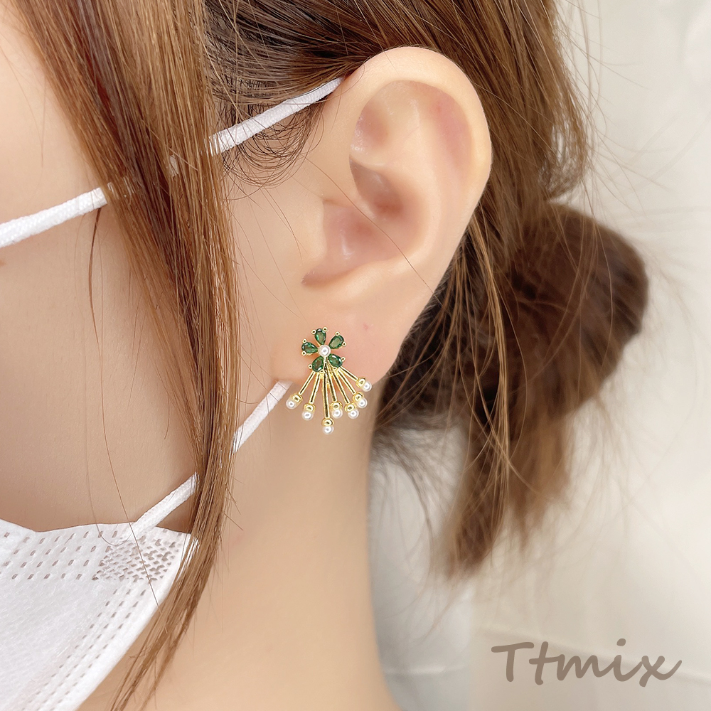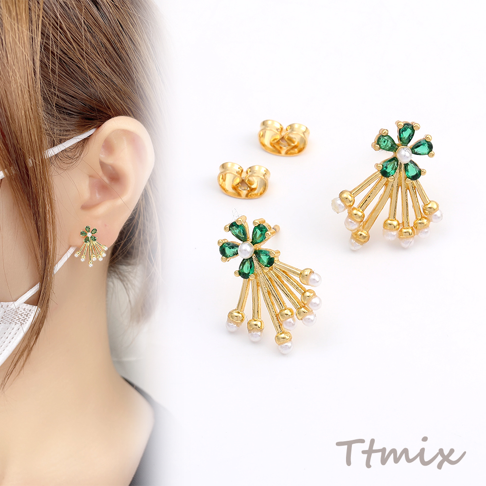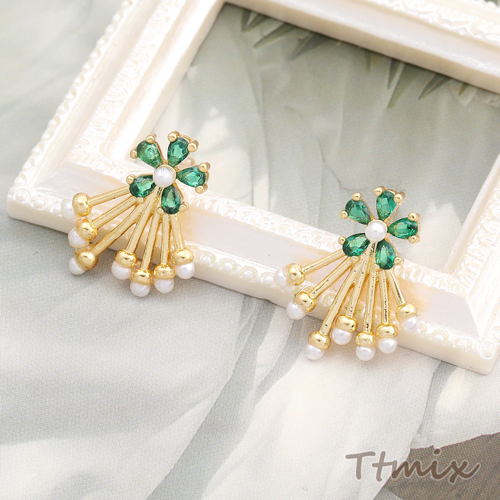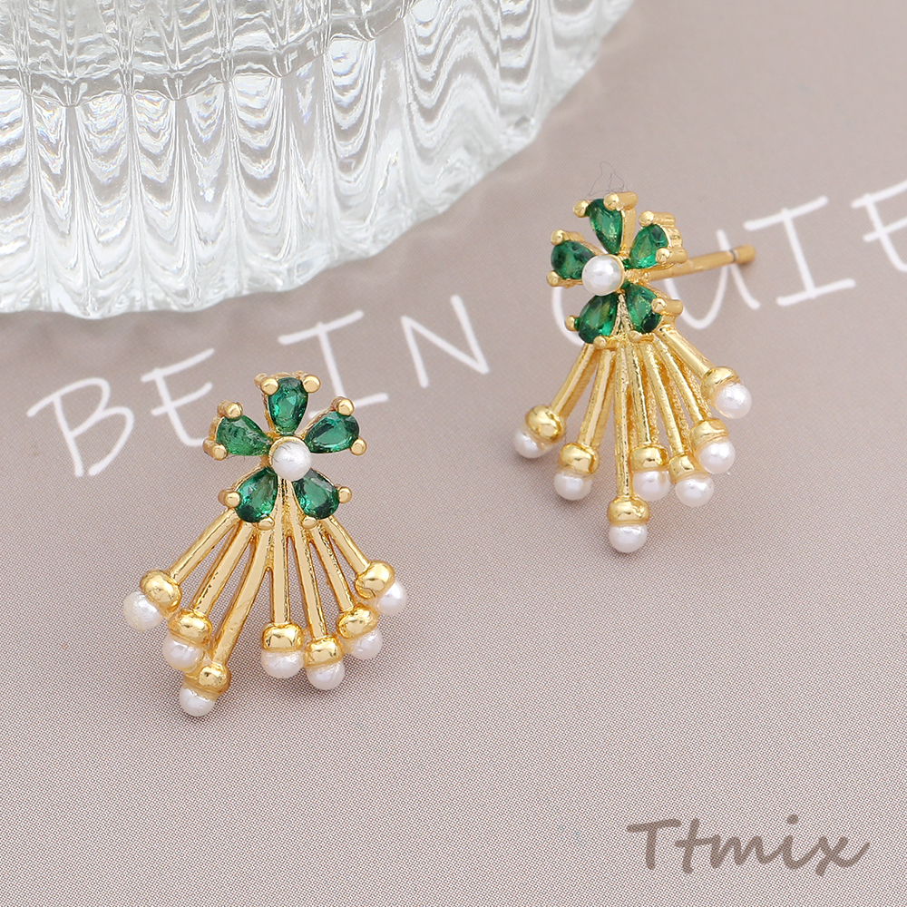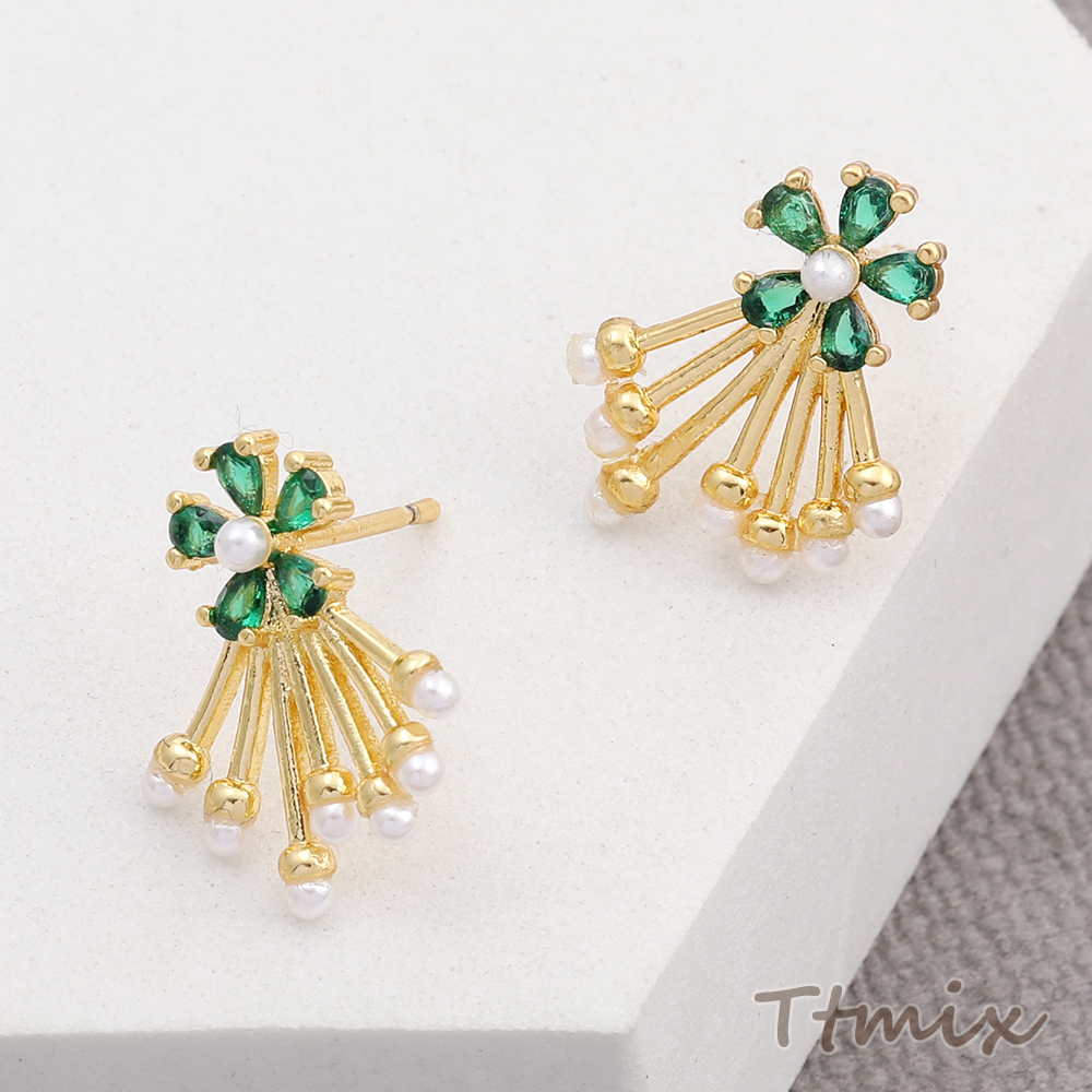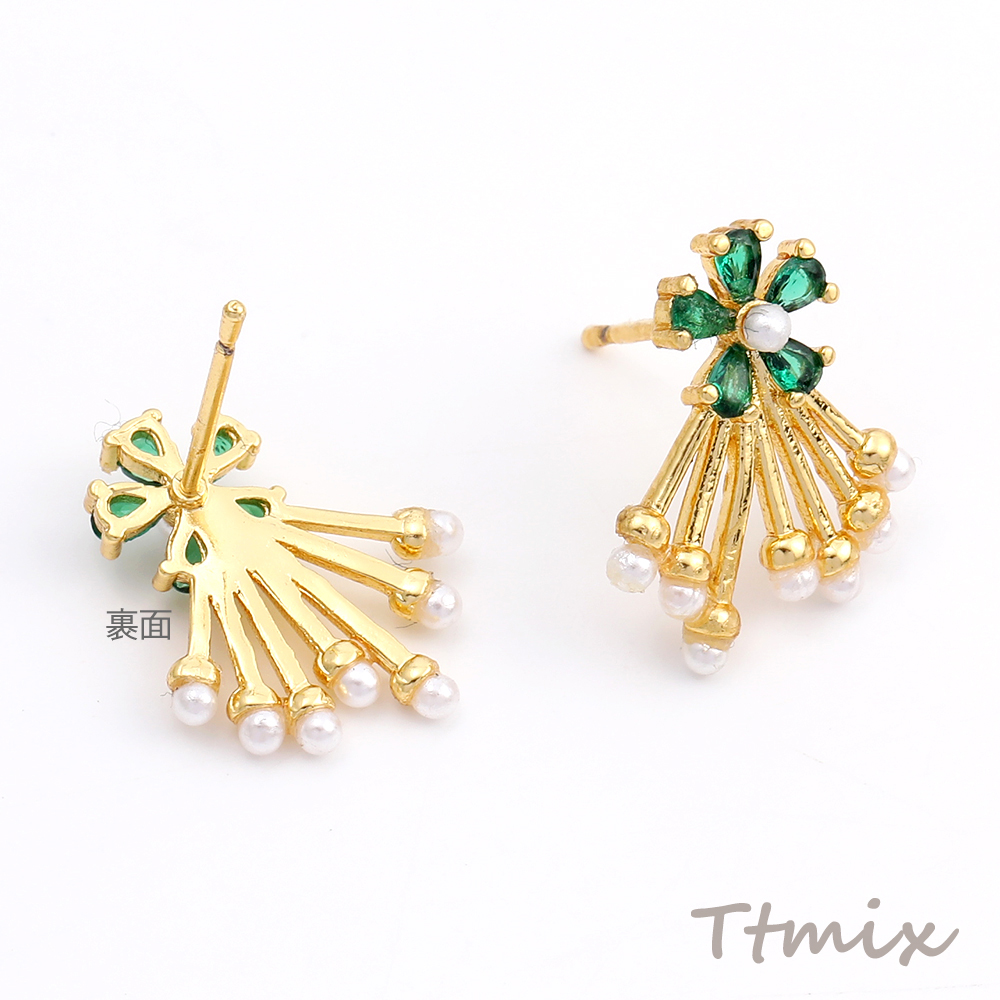 高品質ジルコニアピアス デザインピアス フラワー パールタッセル 14×18mm ゴールド(1ペア)