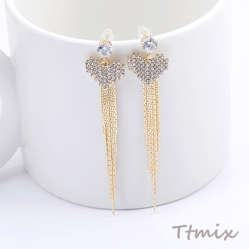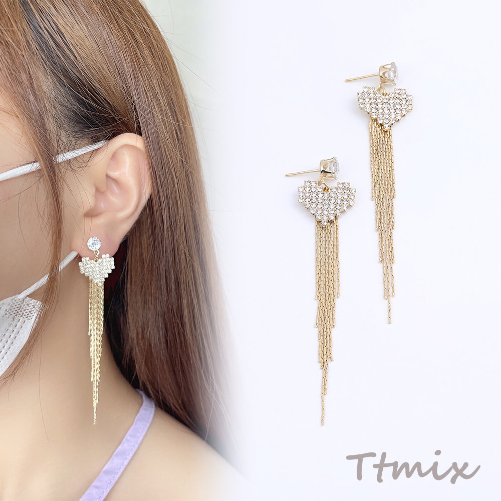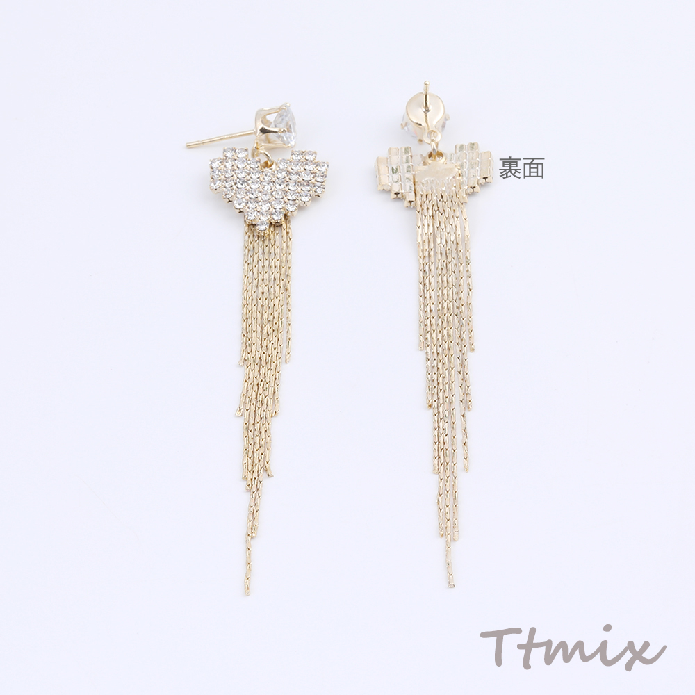 デザインピアス ラインストーン付き ハート型 チェーンタッセル 16×83mm ゴールド(1ペア)