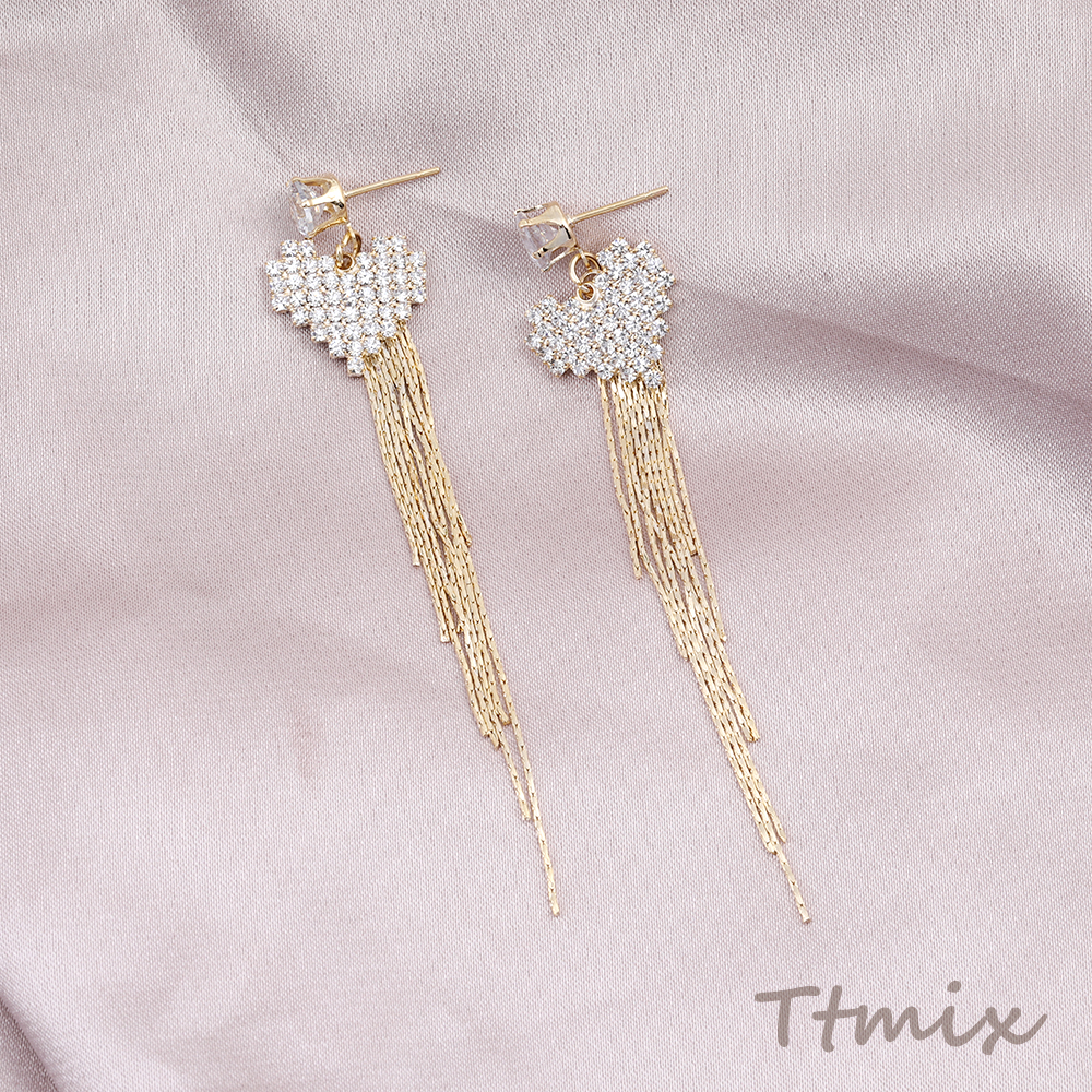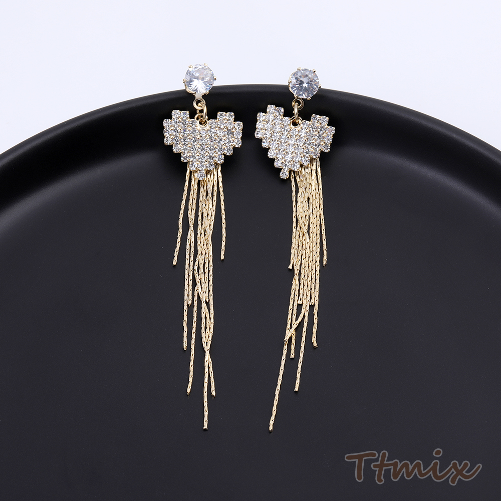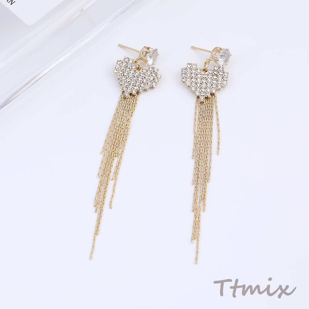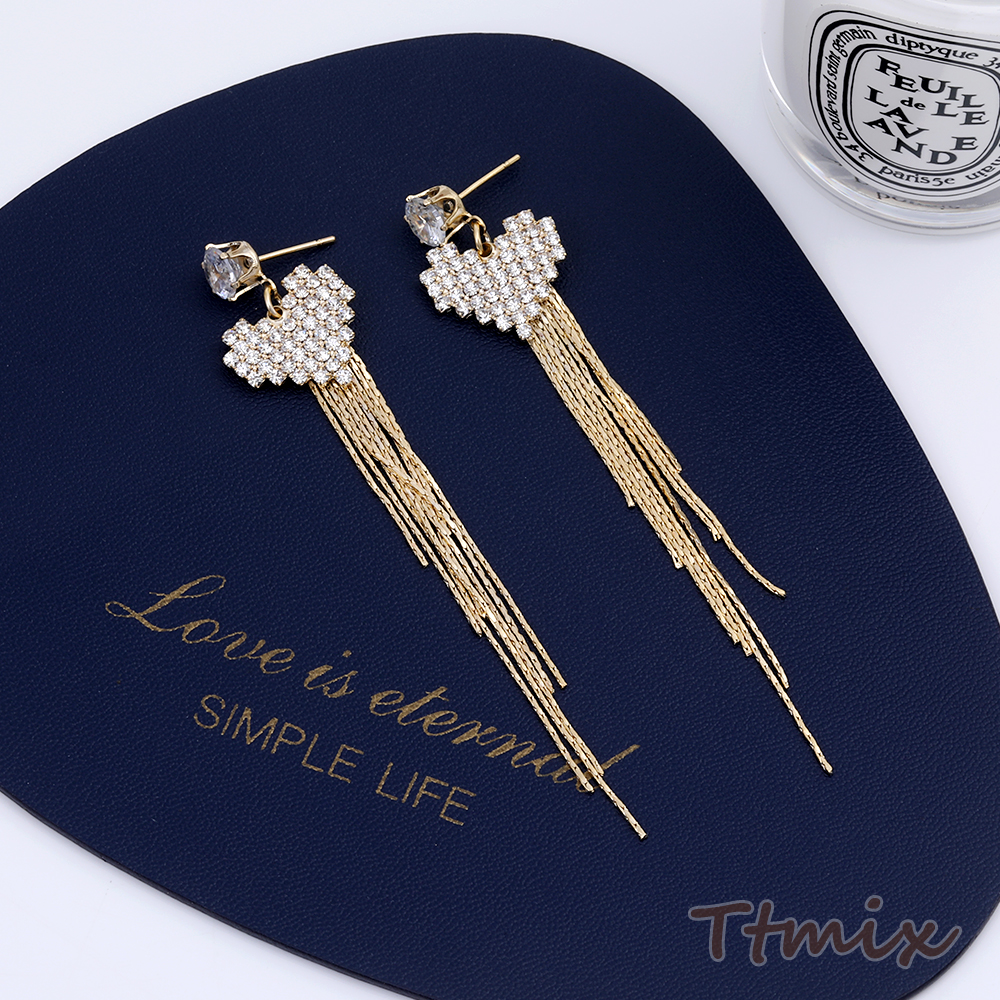 デザインピアス ラインストーン付き ハート型 チェーンタッセル 16×83mm ゴールド(1ペア)