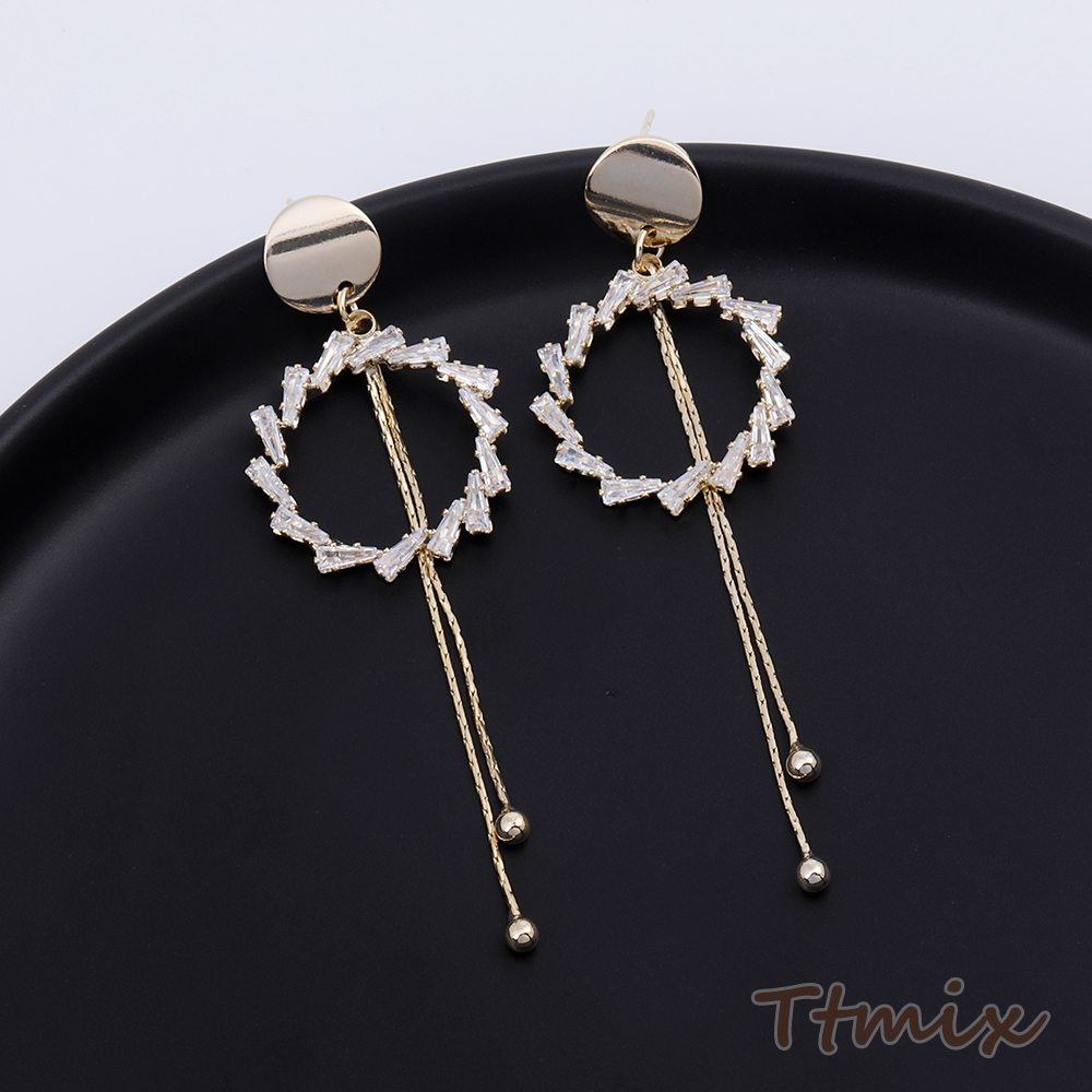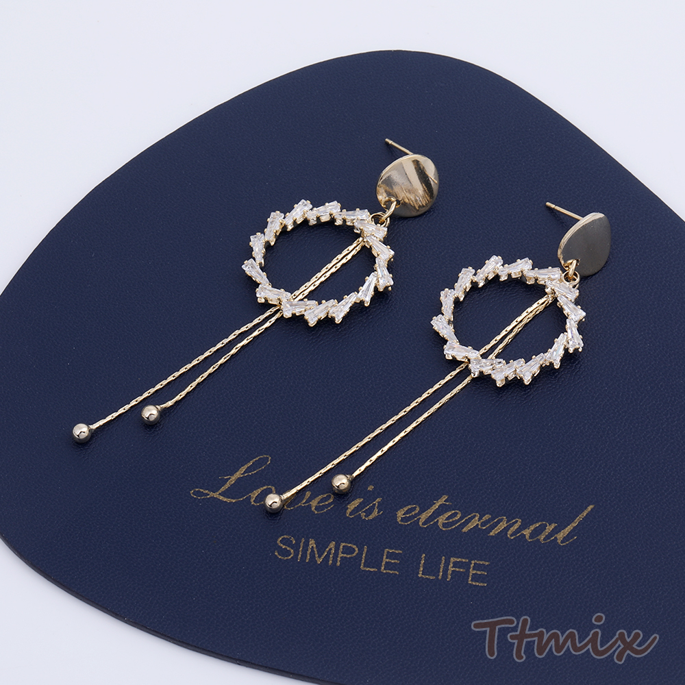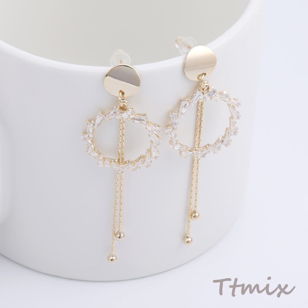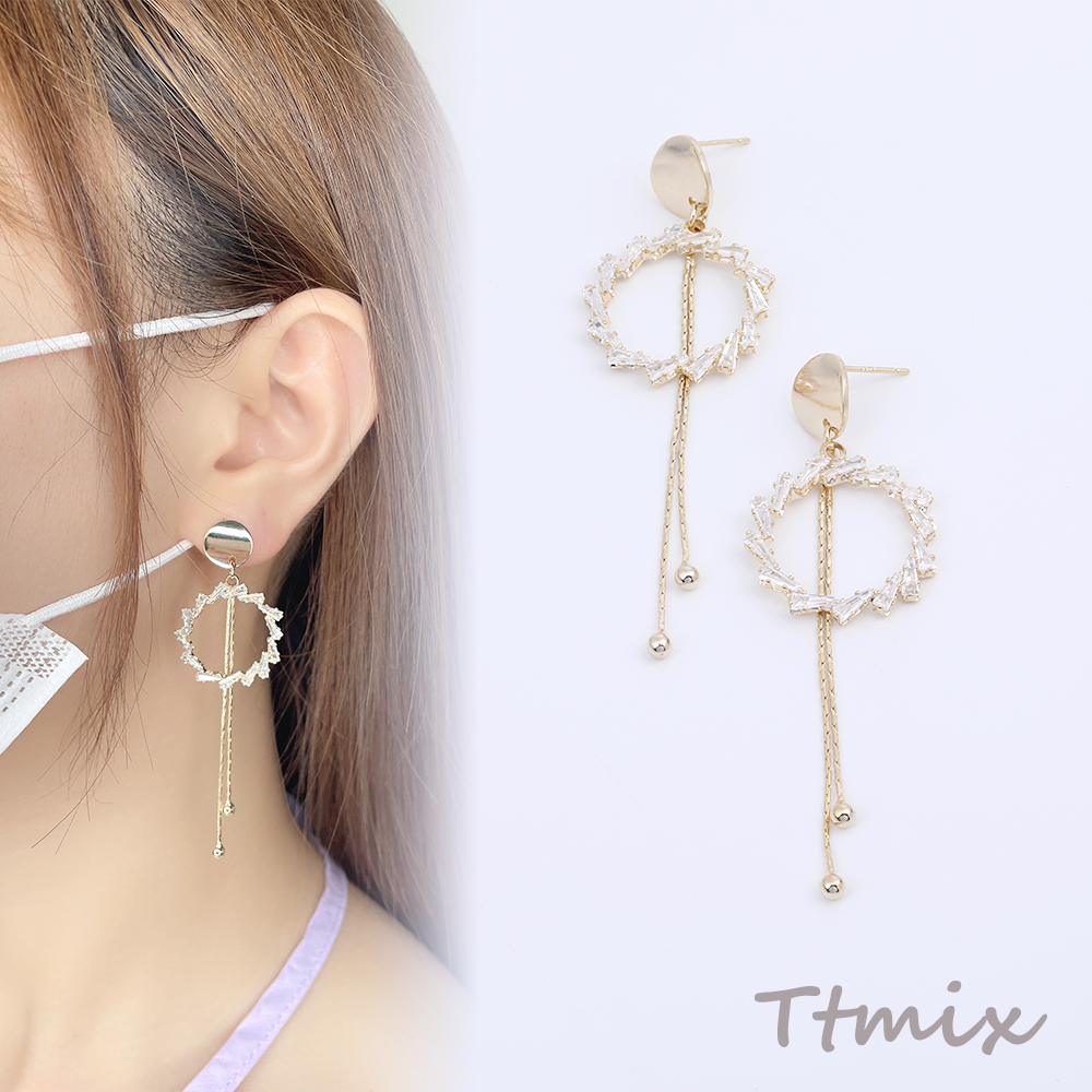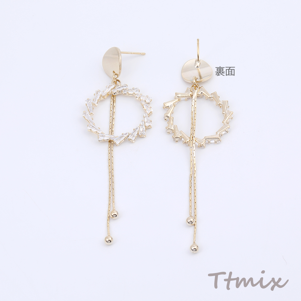デザインピアス ジルコニア付き サークル チェーンタッセル 22×70mm ゴールド(1ペア)