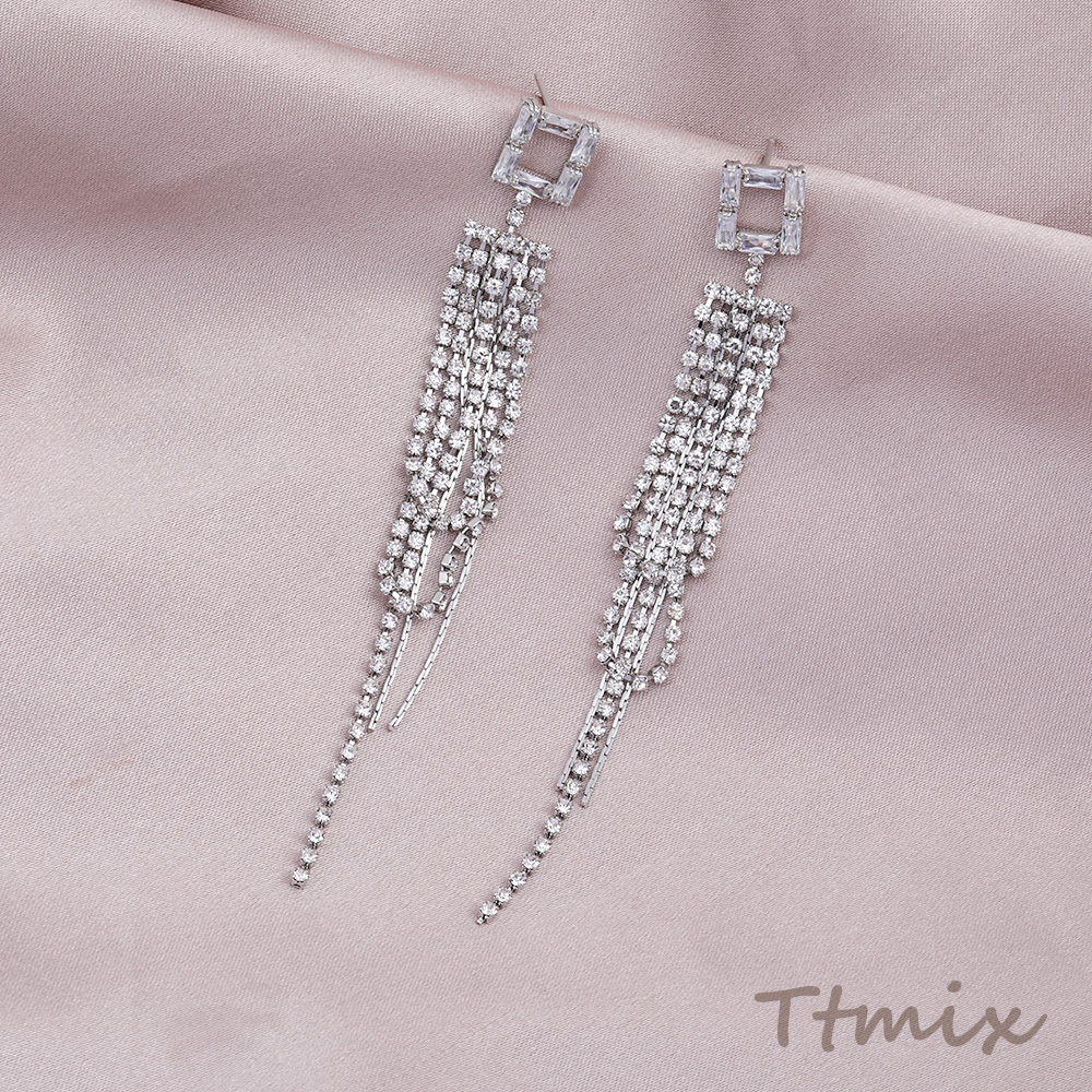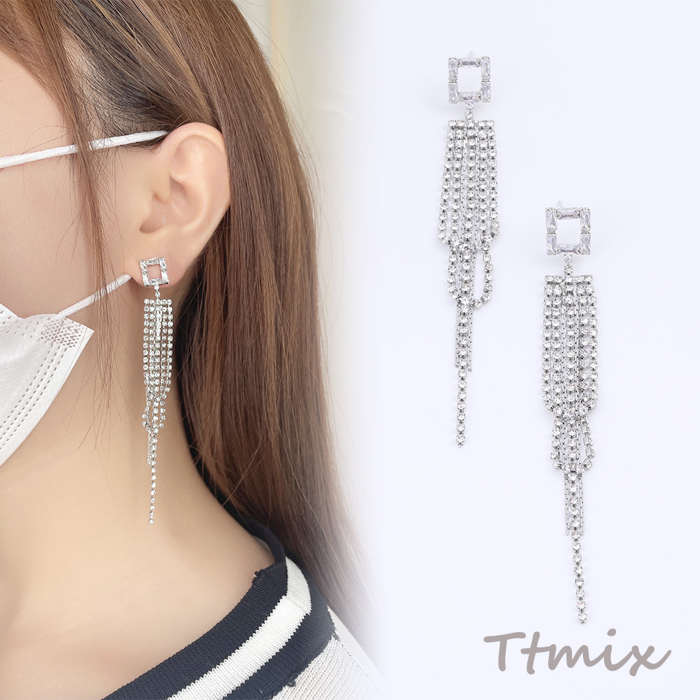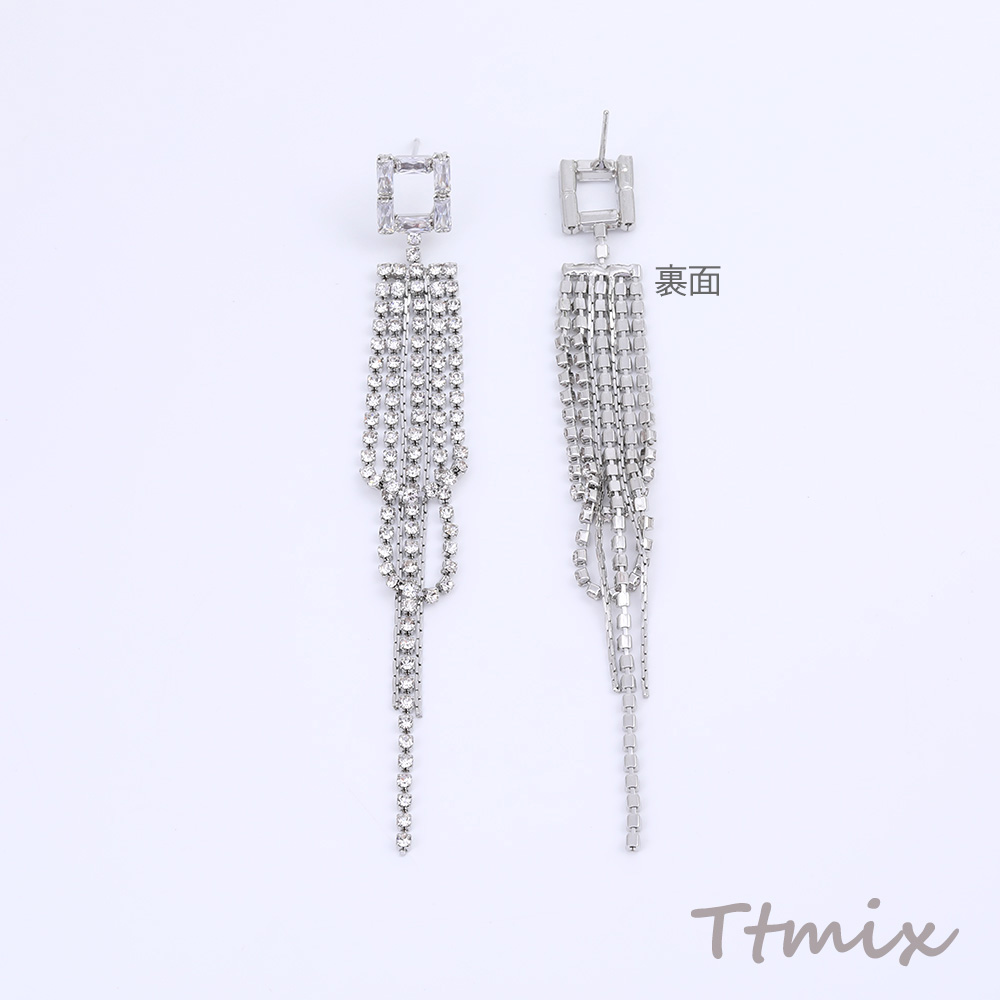 デザインピアス ラインストーン付き チェーンタッセル 9×90mm ロジウム(1ペア)