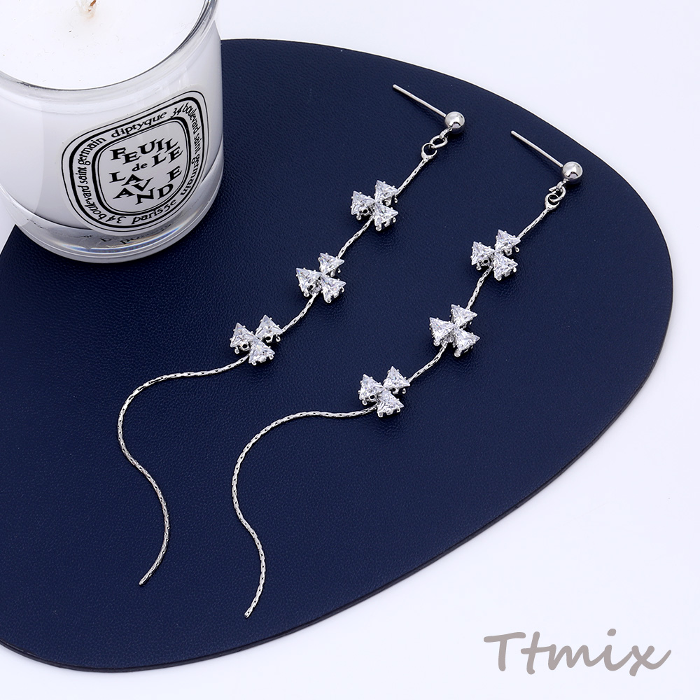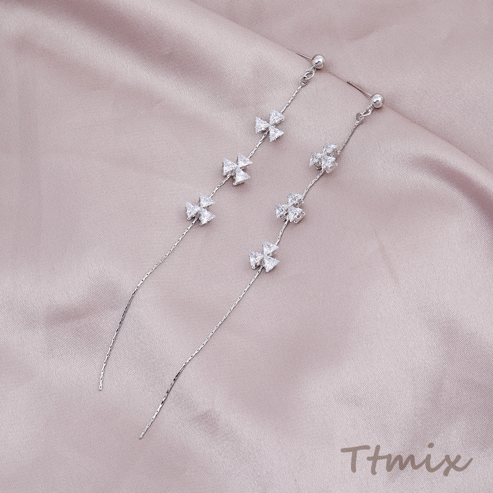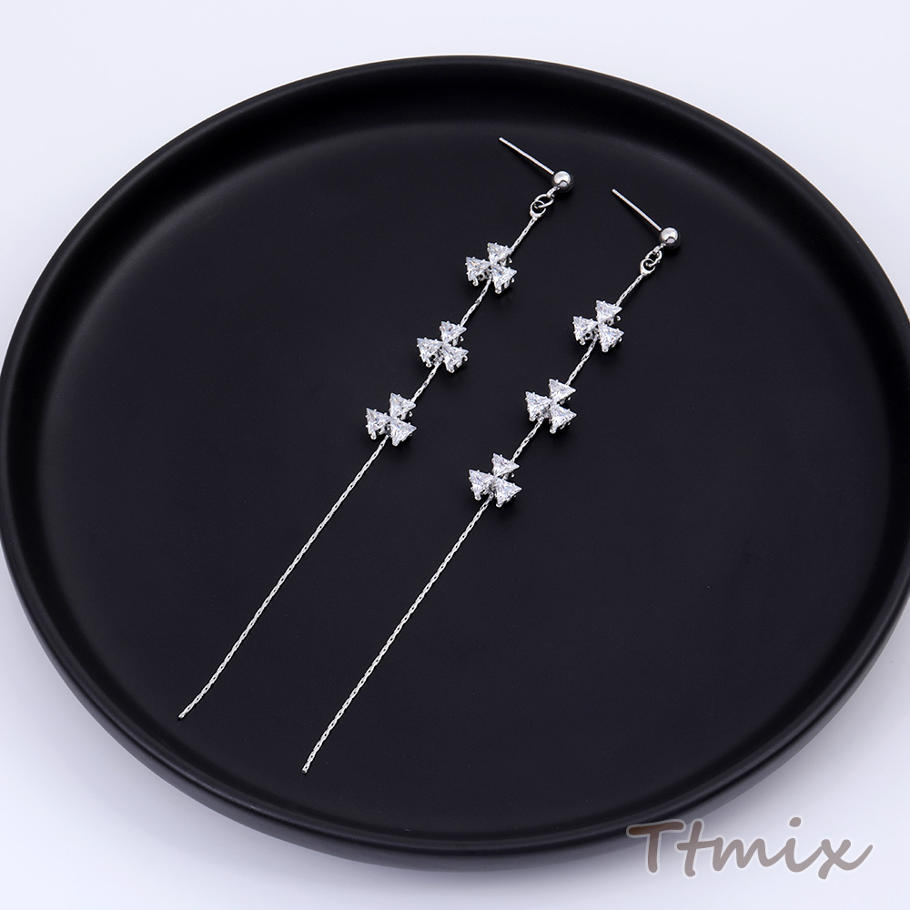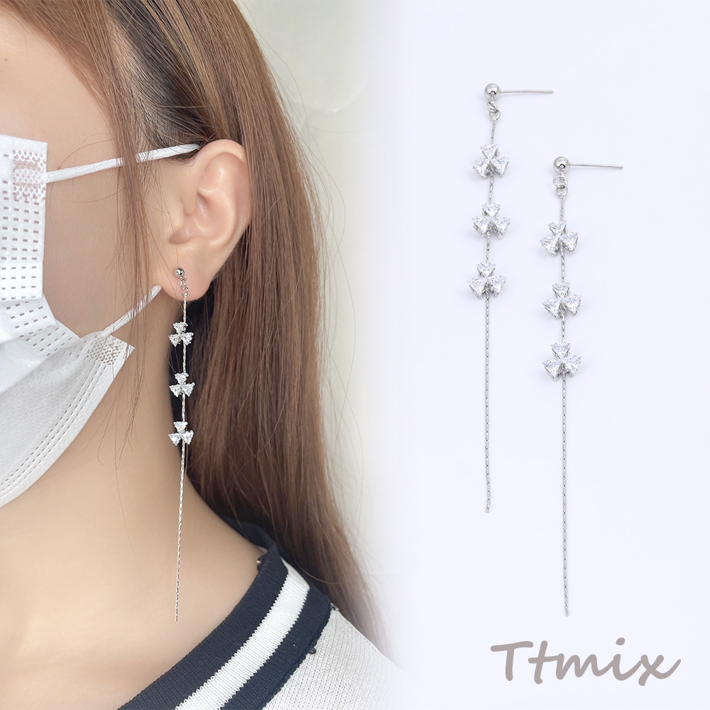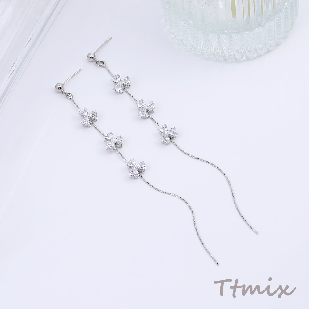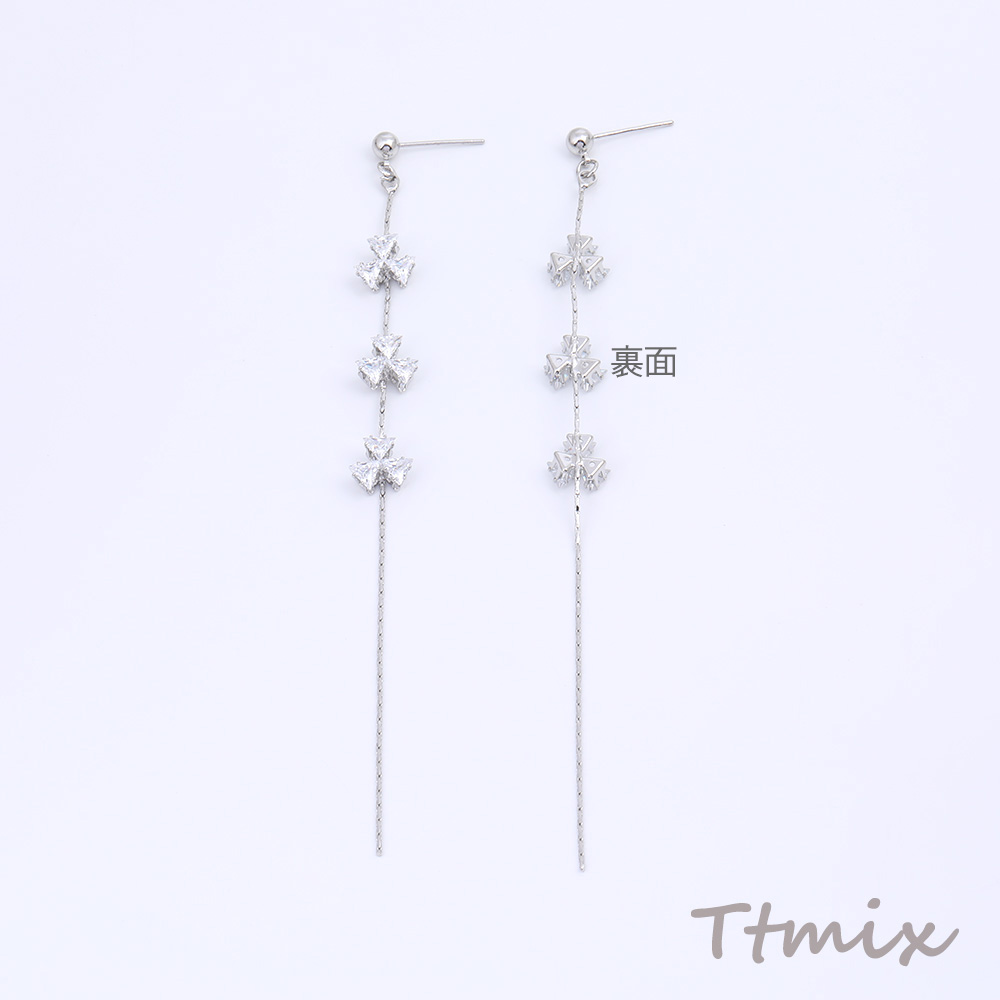 デザインピアス ジルコニア付き 三つ葉 チェーンタッセル 9×120mm ロジウム(1ペア)
