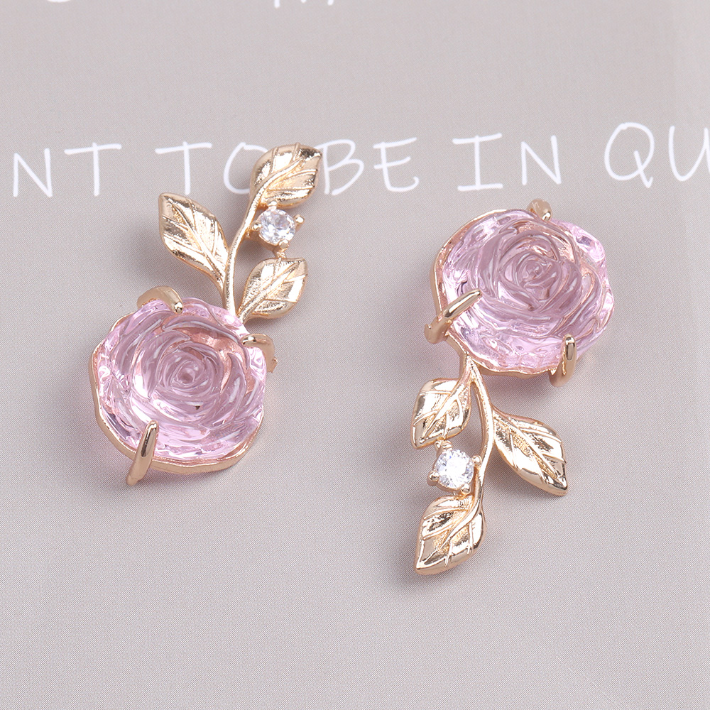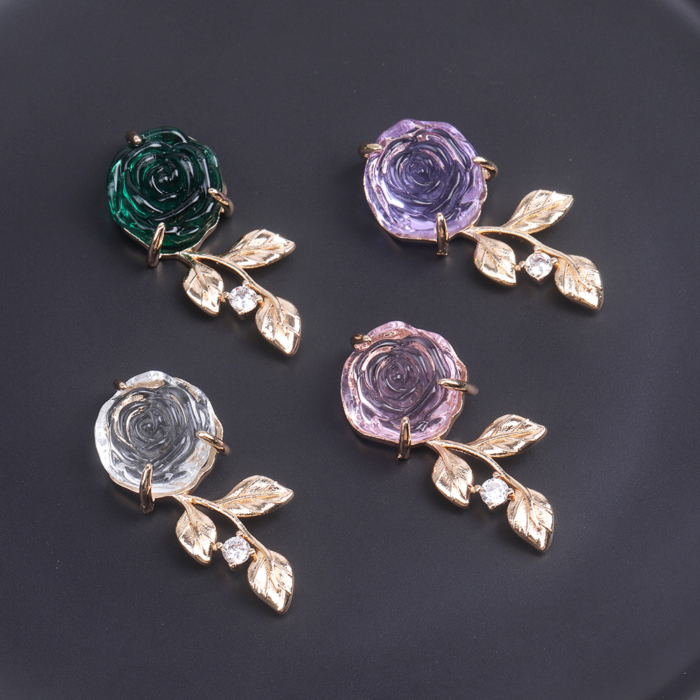 バラのガラスチャーム コネクターチャーム 2カン付き ジルコニア付き フラワー 16×40mm ゴールド(1ヶ)
