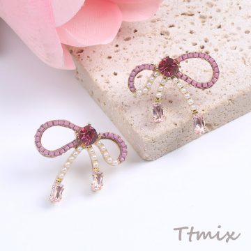 デザインピアス リボンのピアス パール&ラインストーン付き ゴールド ピンク(1ペア)