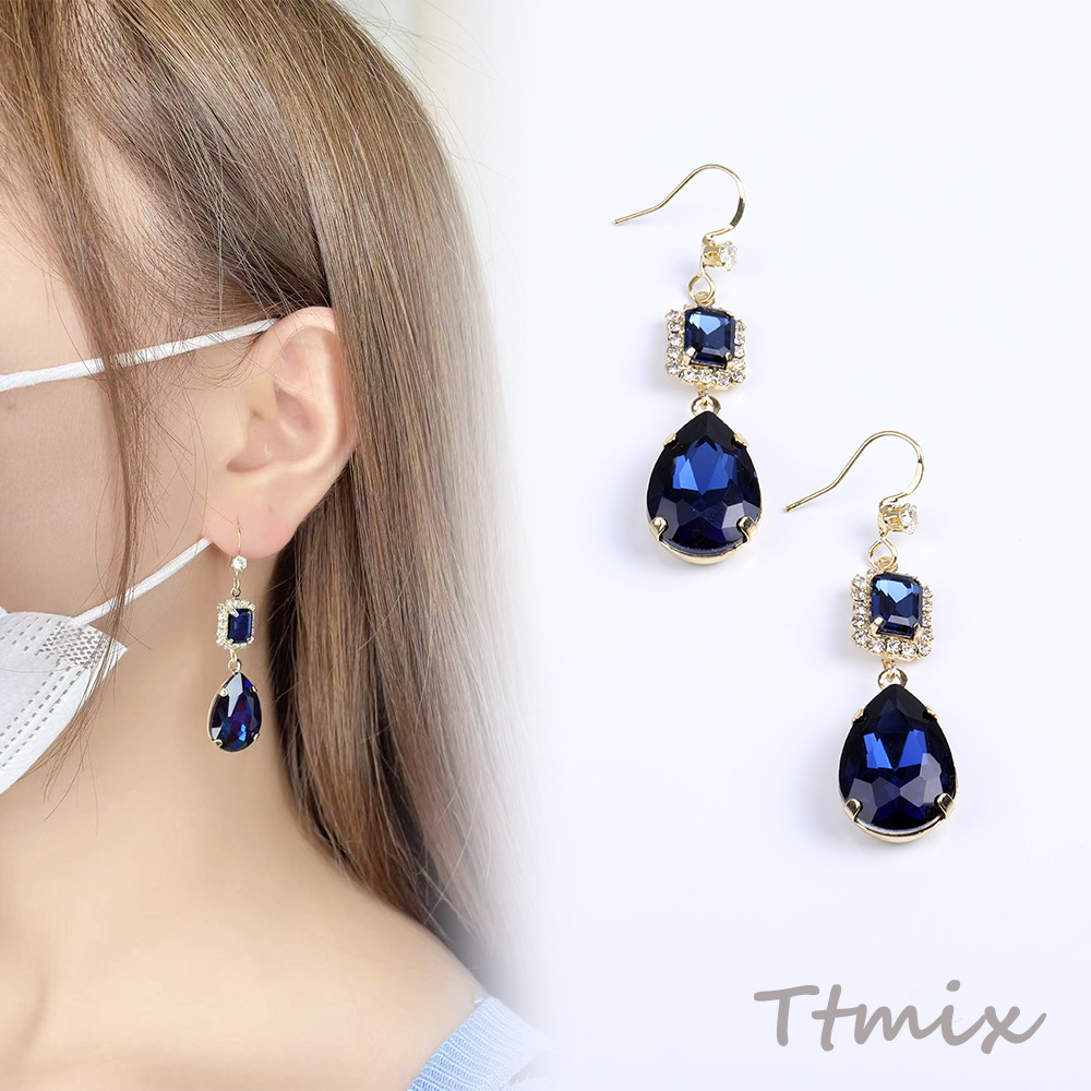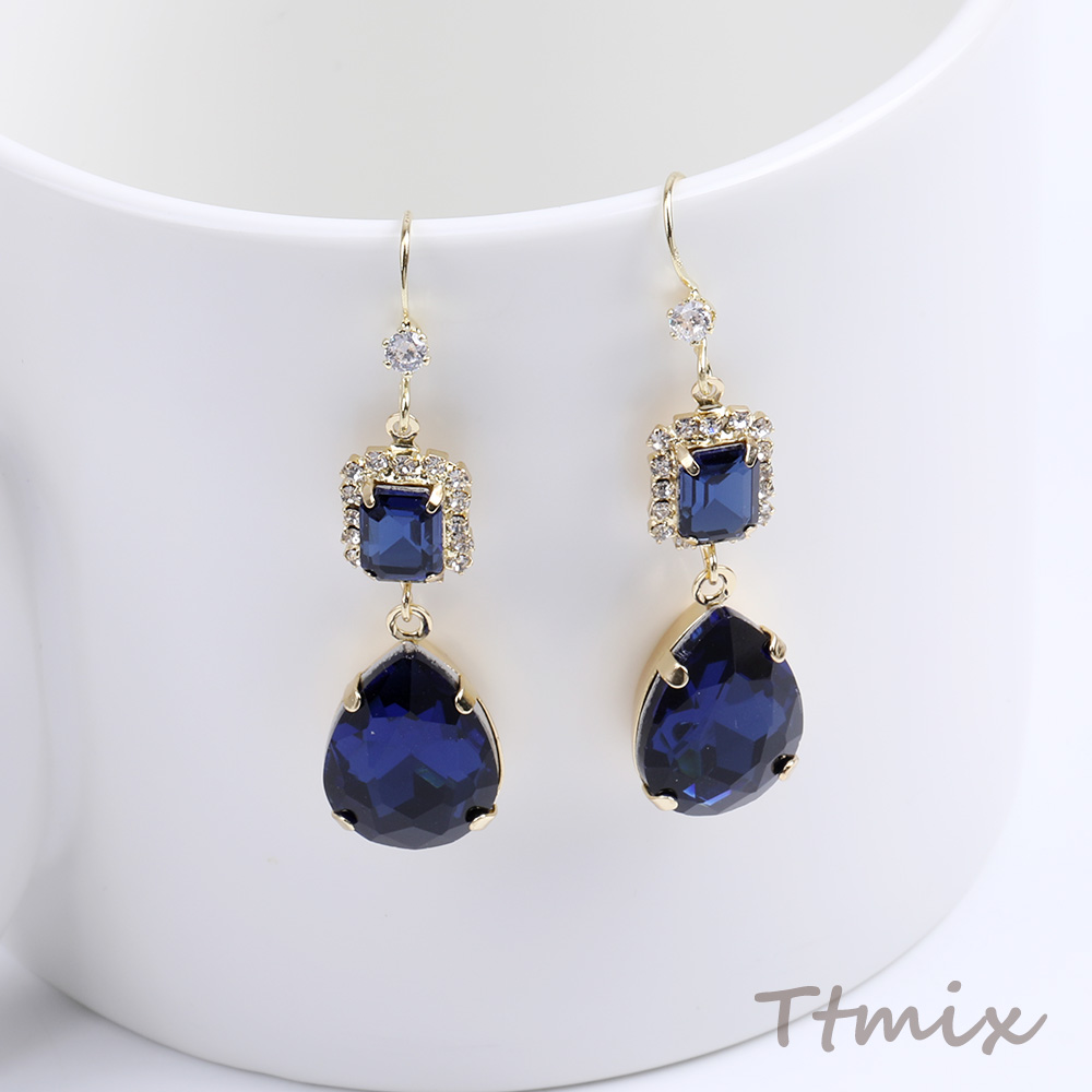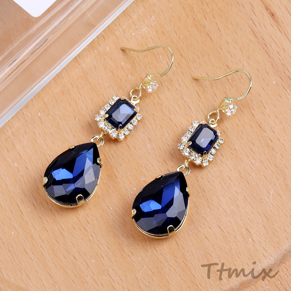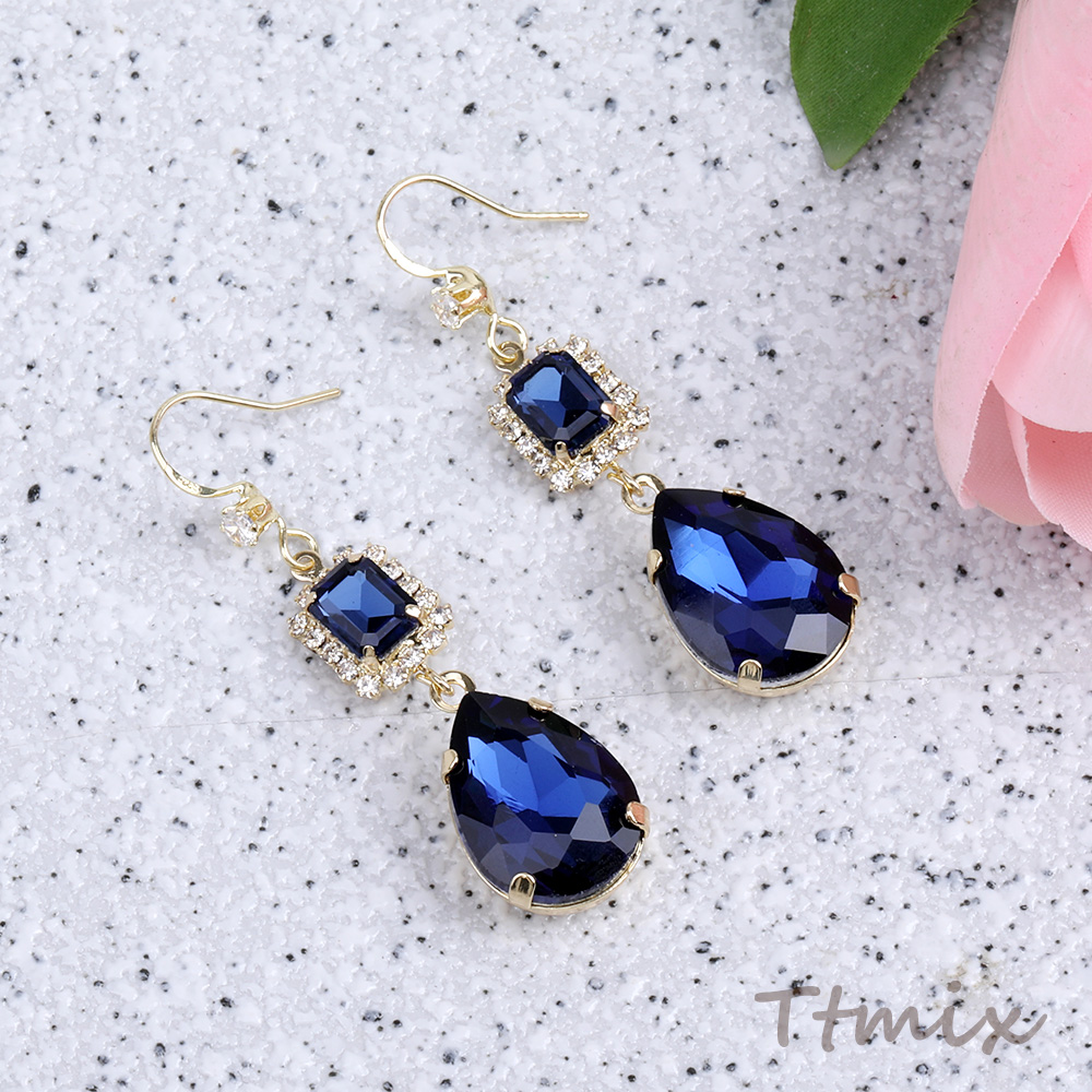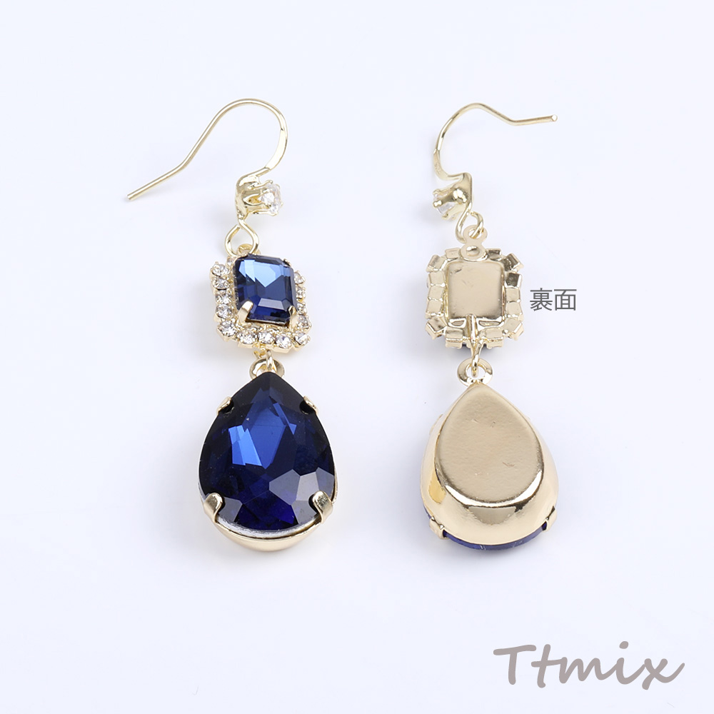 デザインフックピアス 輝くカラーストーンピアス しずく型 ゴールド ダークブルー(1ペア)