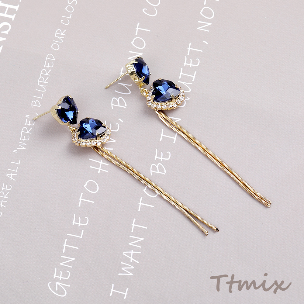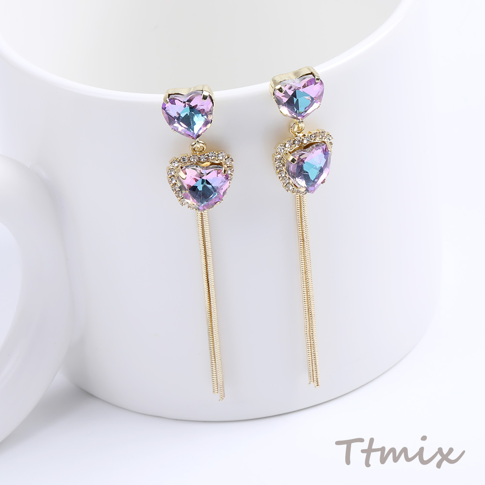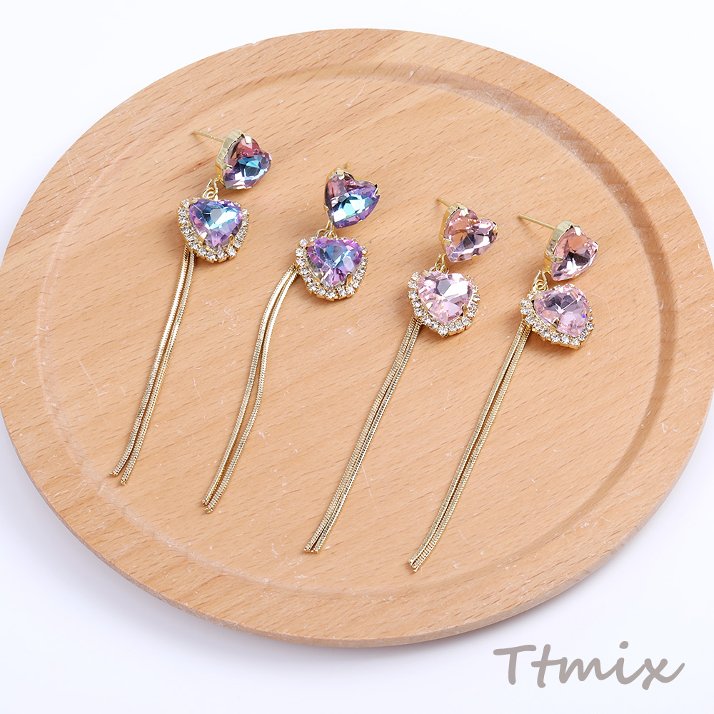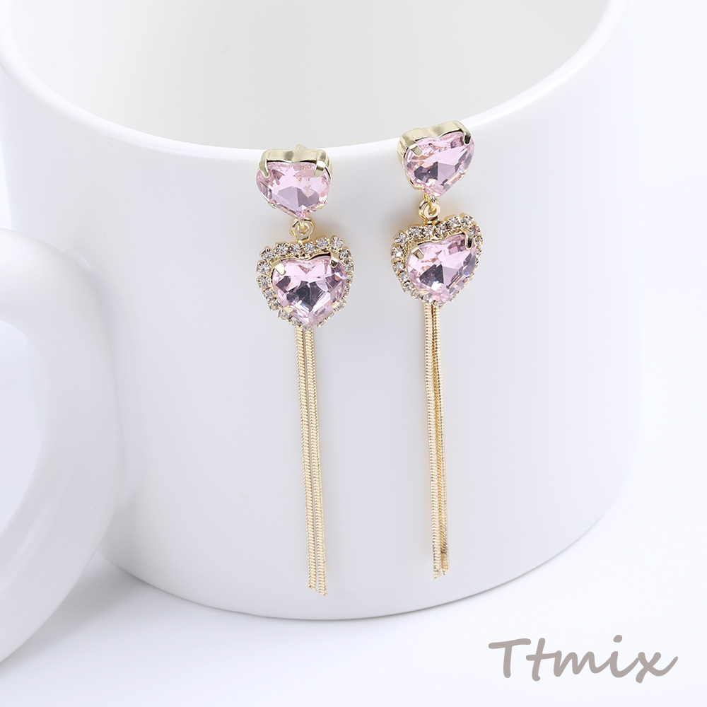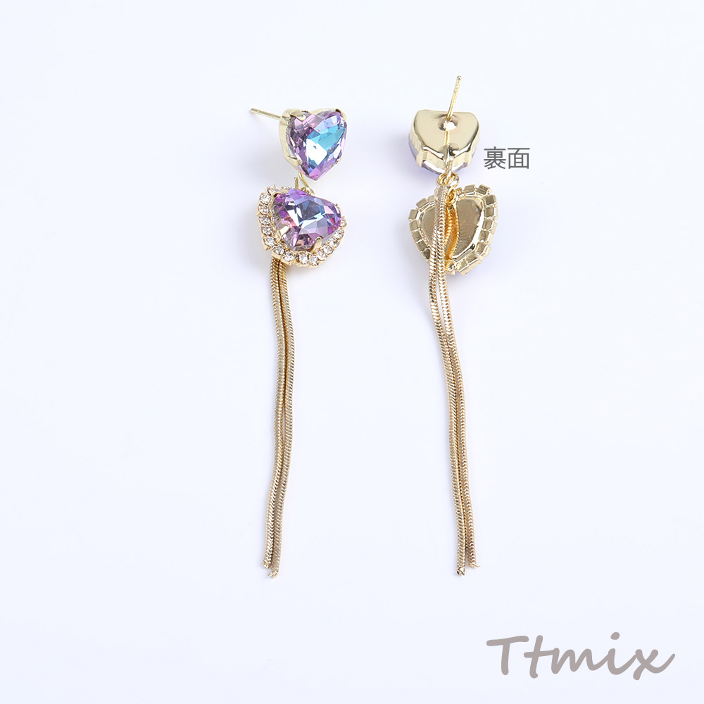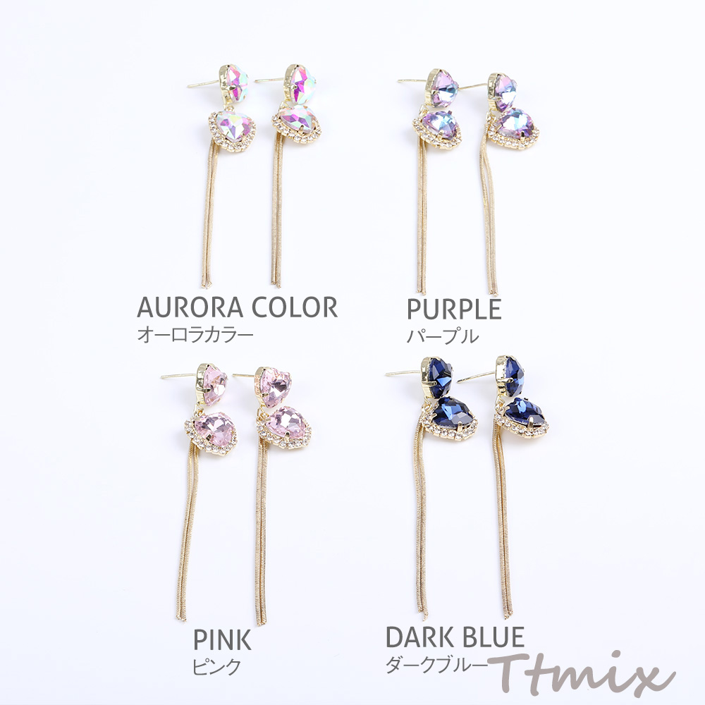 デザインポストピアス 輝くカラーストーンピアス ハート型 チェーンタッセル ゴールド(1ペア)