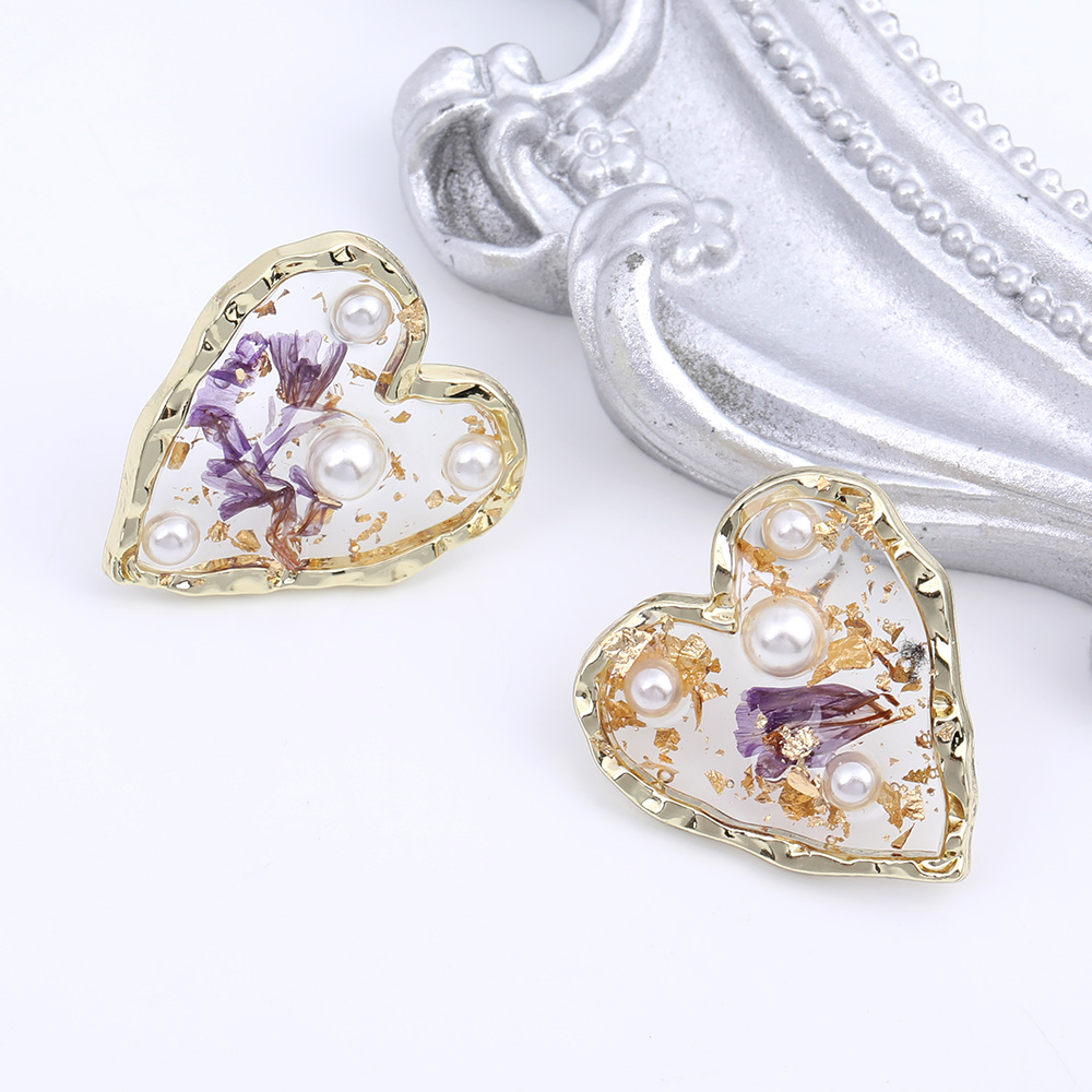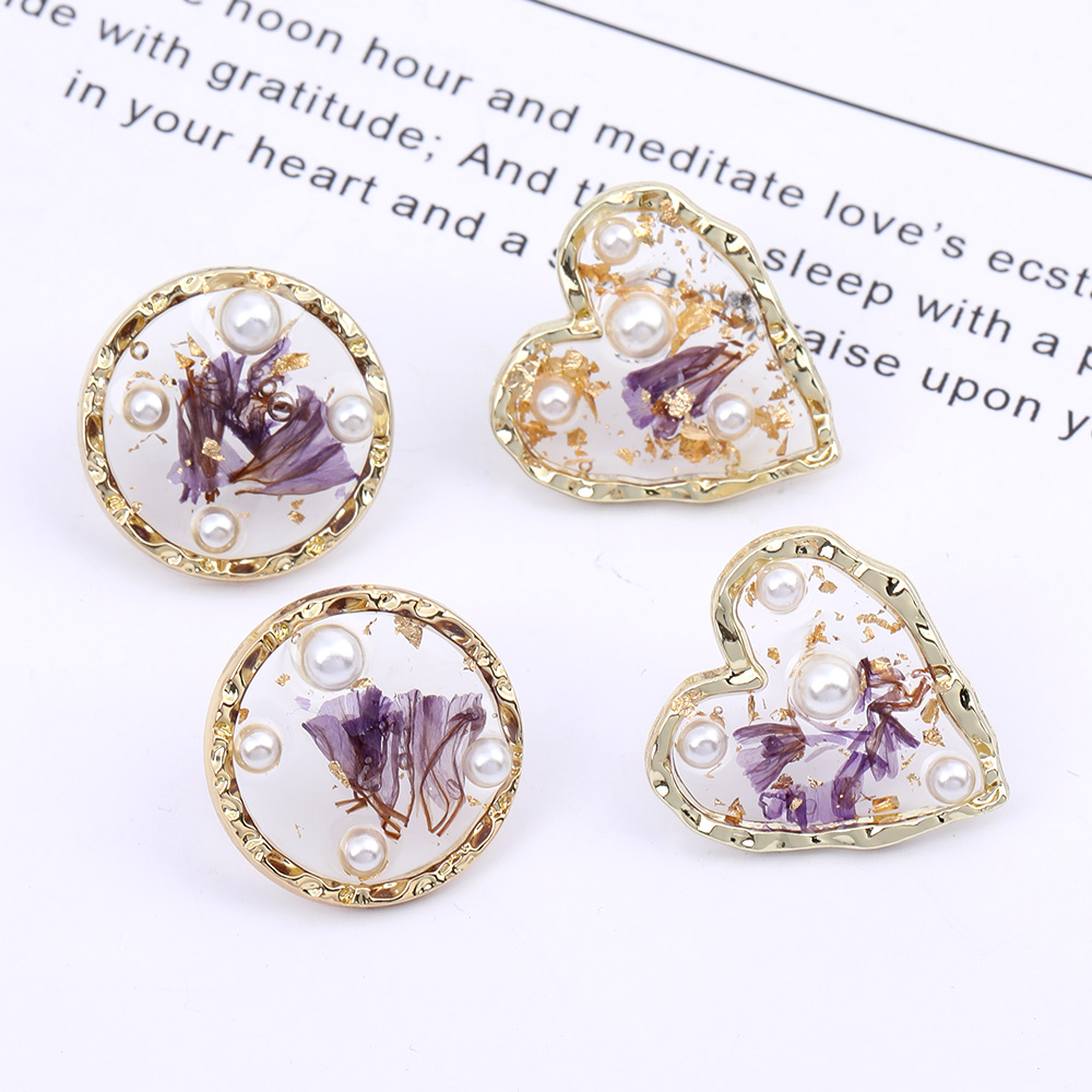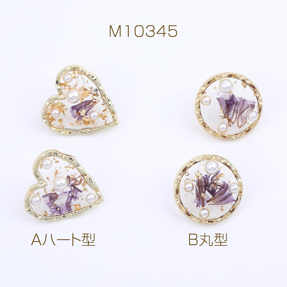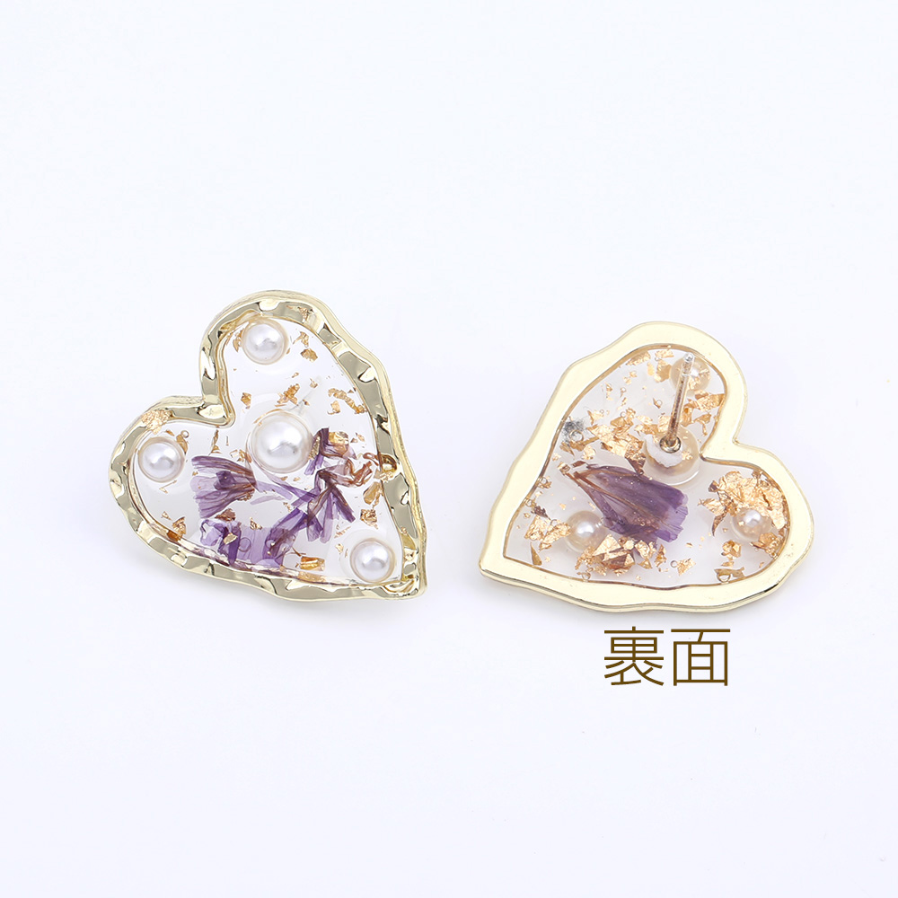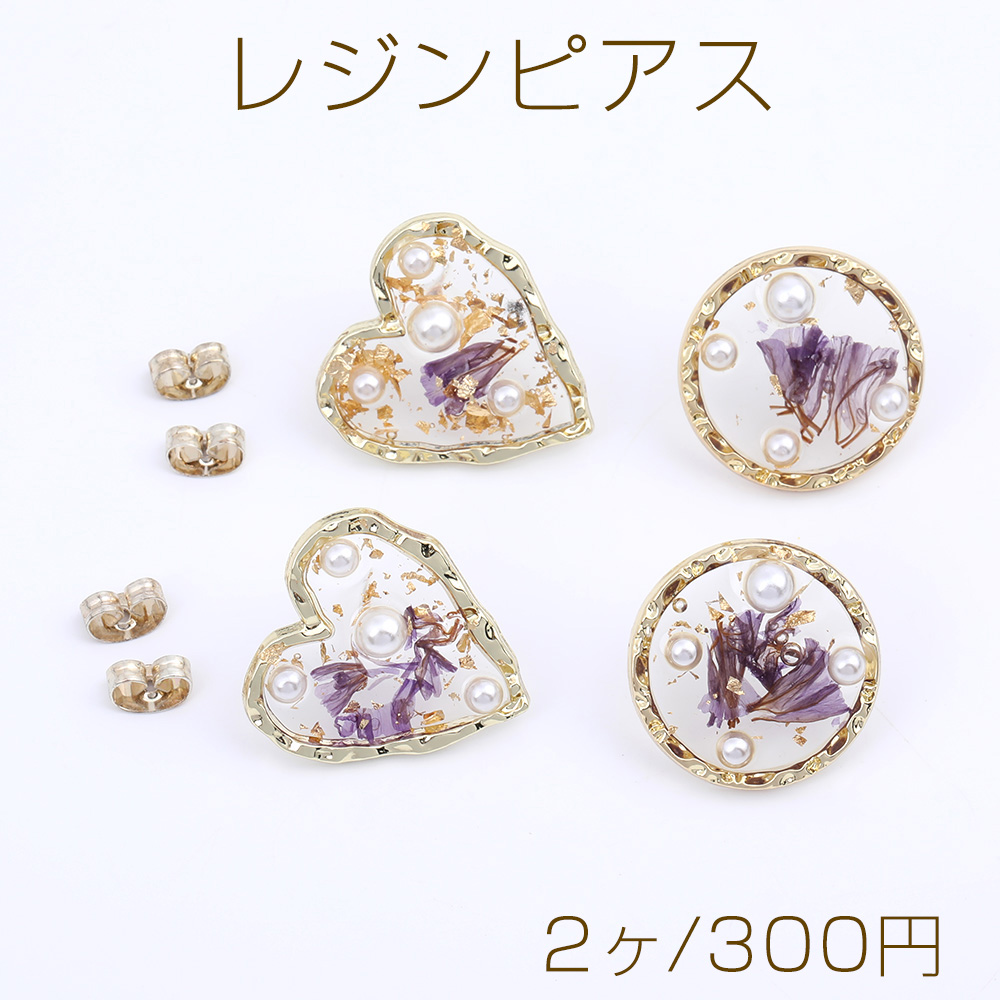 レジンピアス ハート型 丸型 金箔&パール&ドライフラワー封入 ゴールド(2ヶ)