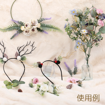 入数:1セット:枝(2種×各1ヶ)、リーフ(2種×各1ヶ)、造花(6種×各1ヶ)、布製貼付けパーツ×5ヶ