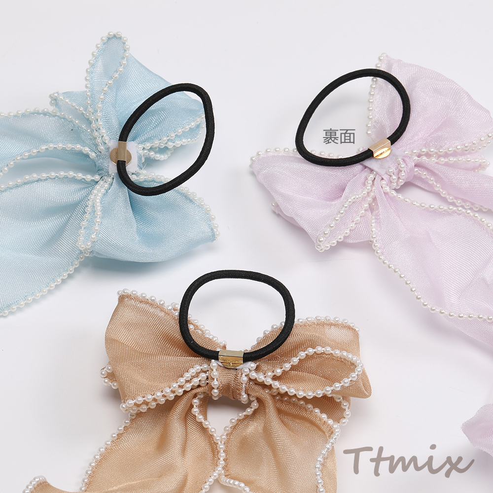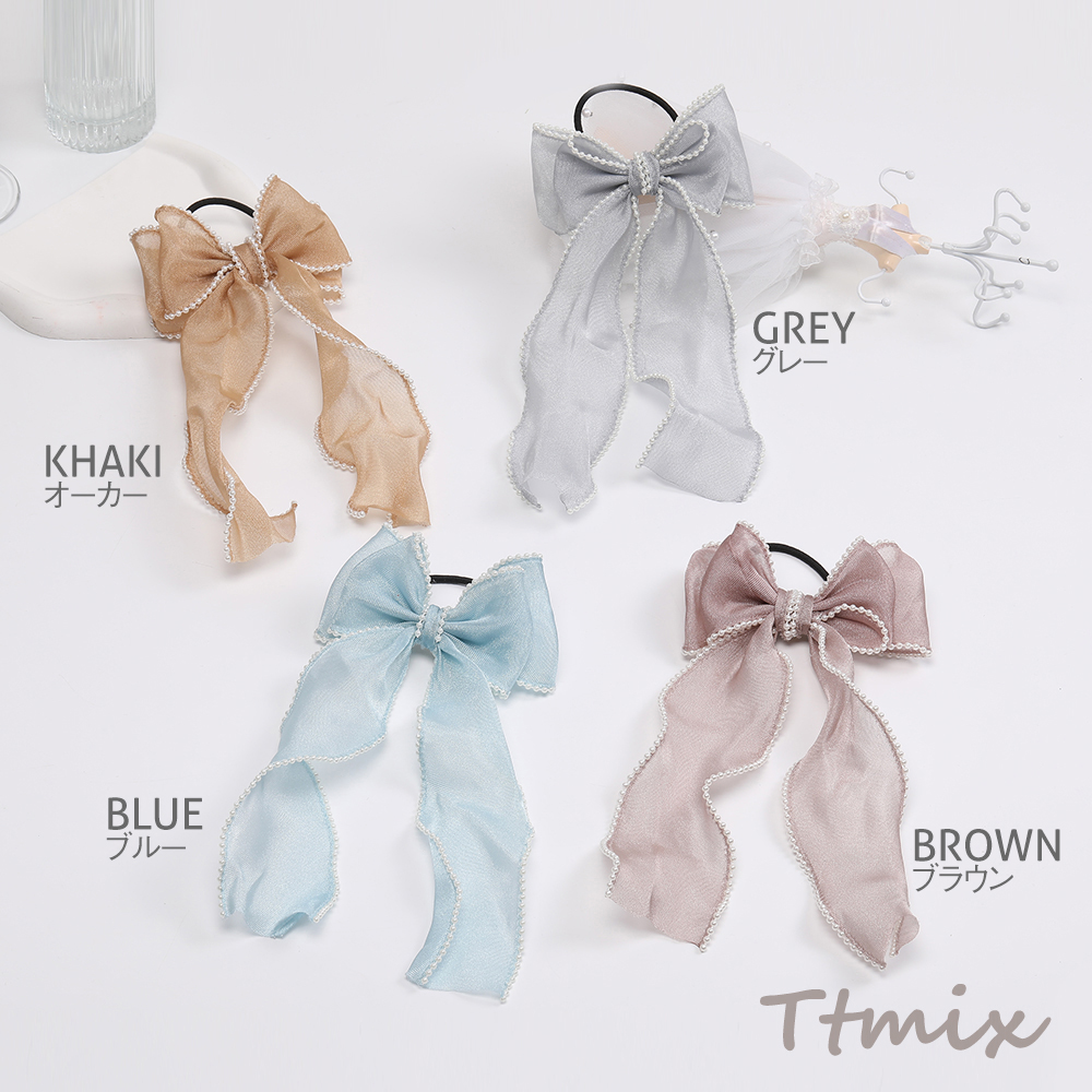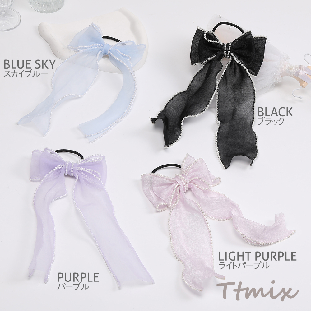 パール付きオーガンジーリボン付きヘアゴム 26cm(1ヶ)