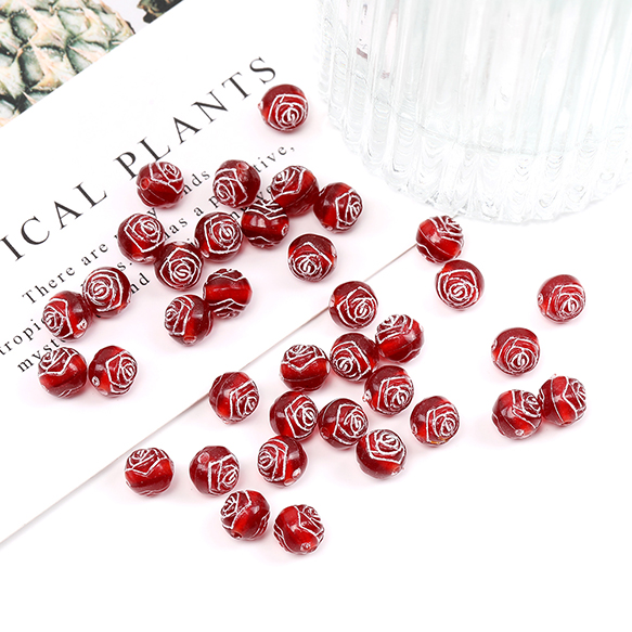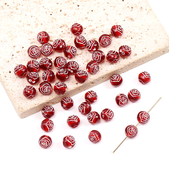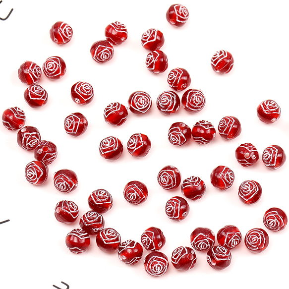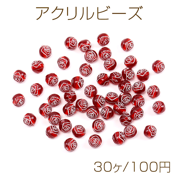 アクリルビーズ アンティーク調アクリルビーズ 丸玉 フラワー柄 7.5mm ダークレッド(30ヶ)