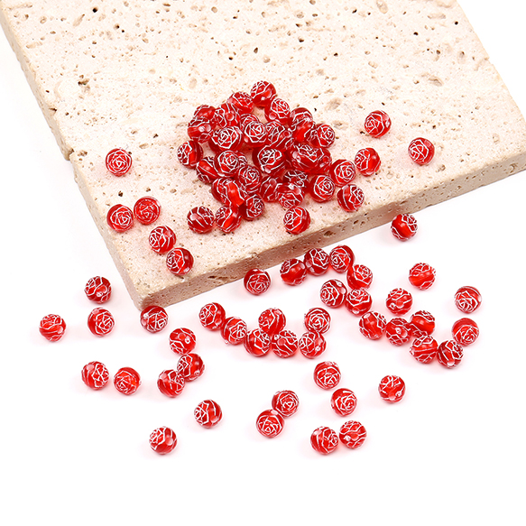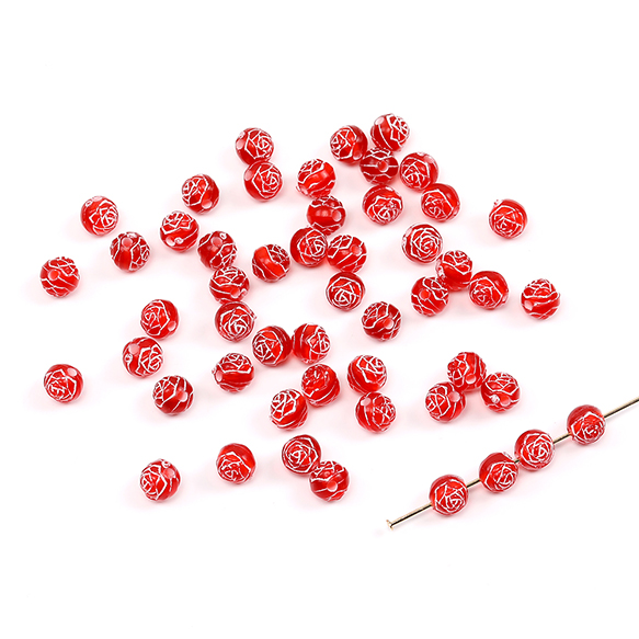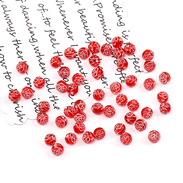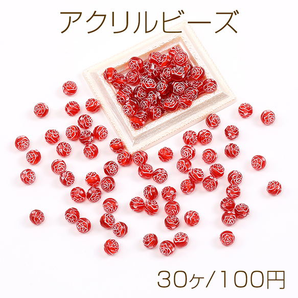アクリルビーズ アンティーク調アクリルビーズ 丸玉 フラワー柄 6mm レッド(30ヶ)