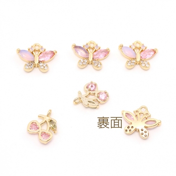 色褪せにくい14KGPゴールドメッキ 高品質フレームガラスチャーム さくらんぼ 蝶 1カン