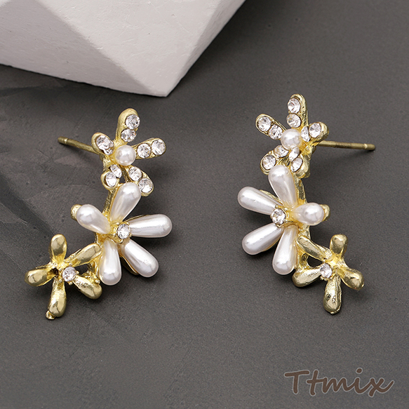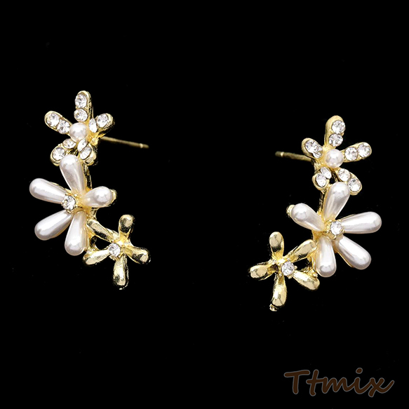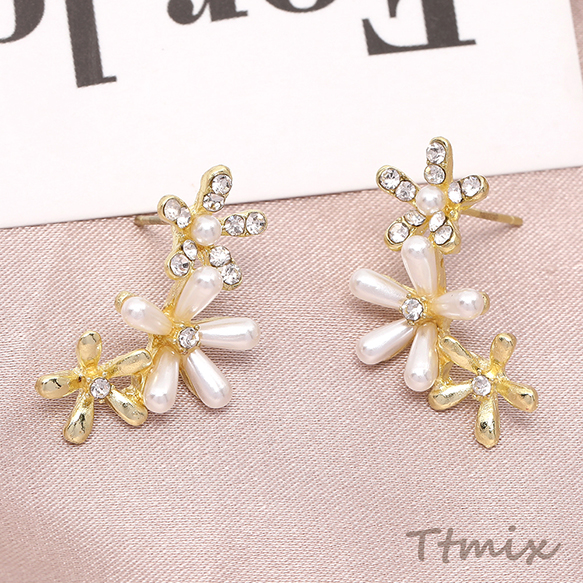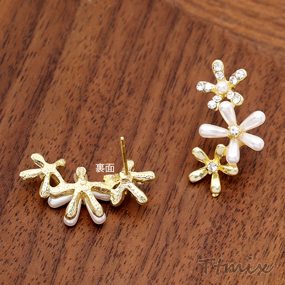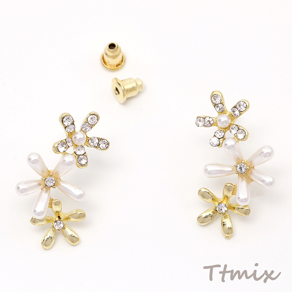デザインピアス 3連フラワーのピアス ラインストーン&パール付き 12×24mm(1ペア)
