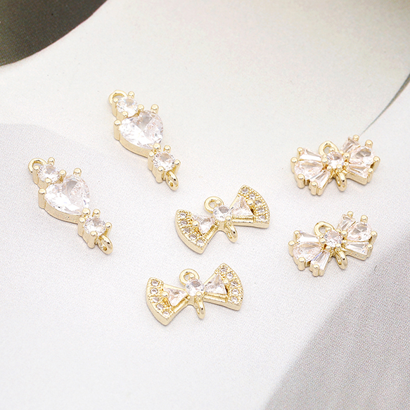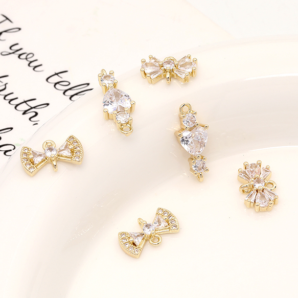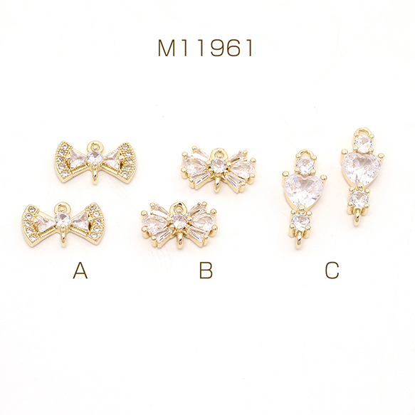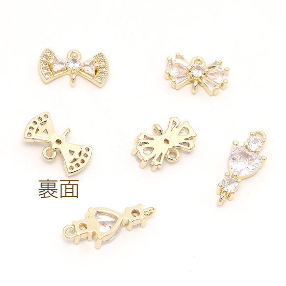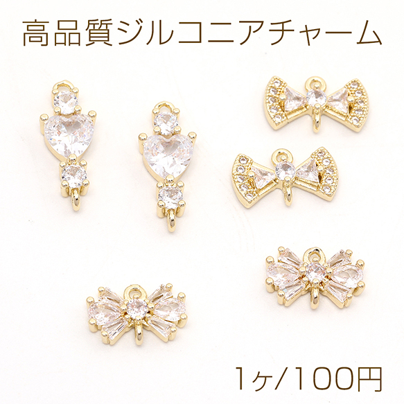 色褪せにくい14KGPゴールドメッキ 高品質ジルコニアチャーム リボン ハート型 2カン