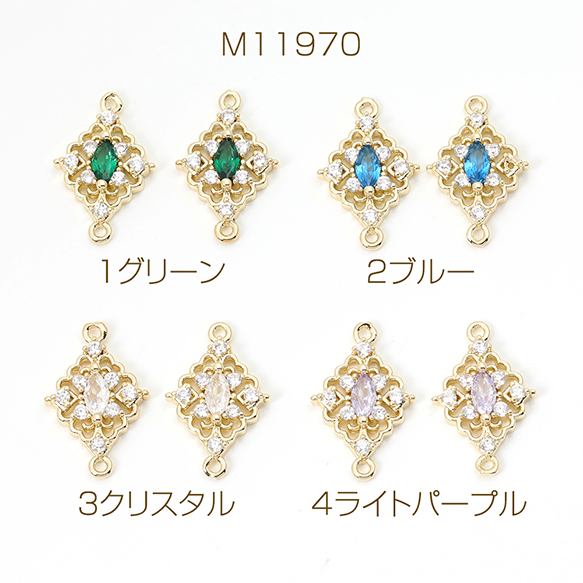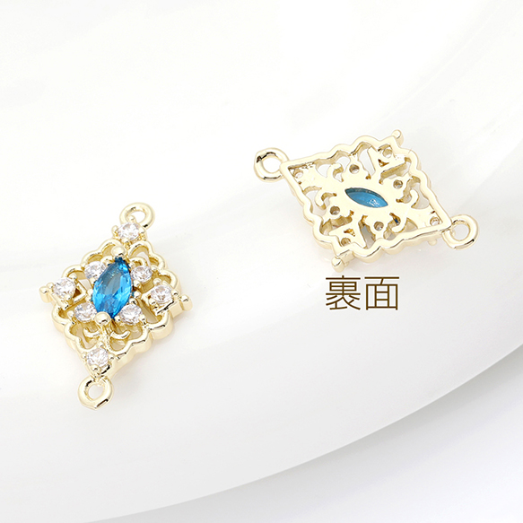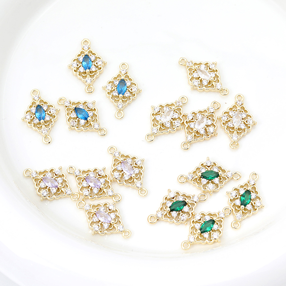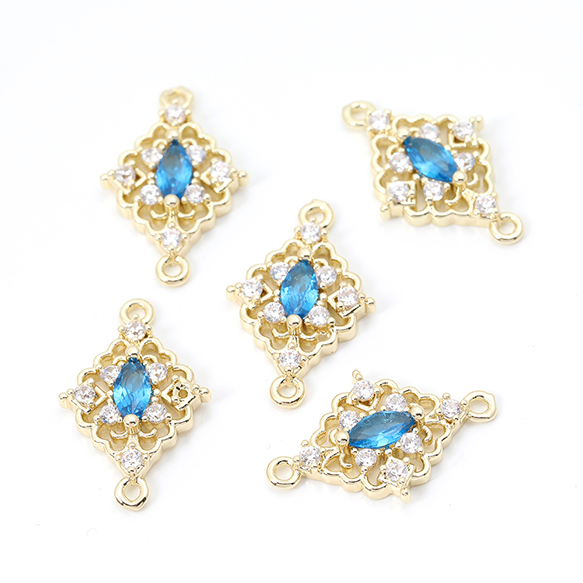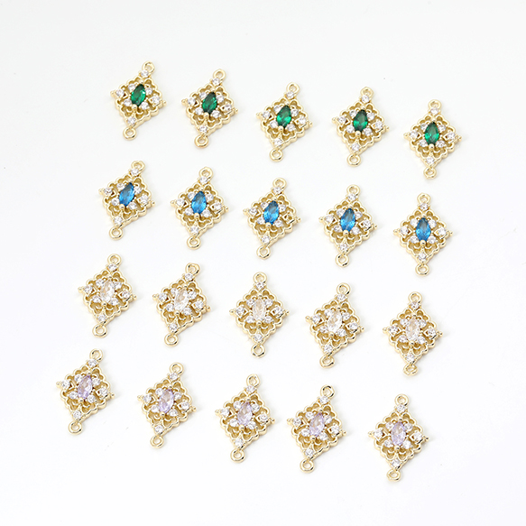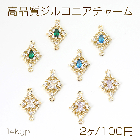 色褪せにくい14KGPゴールドメッキ 高品質ジルコニアチャーム ひし形 2カン 12.5×20mm(2ヶ)