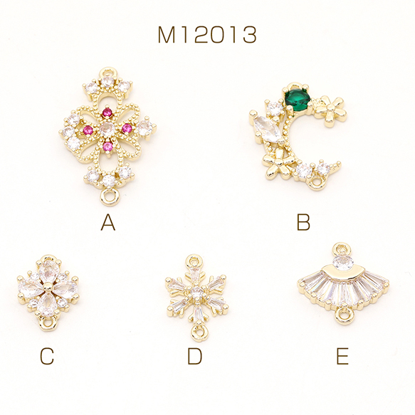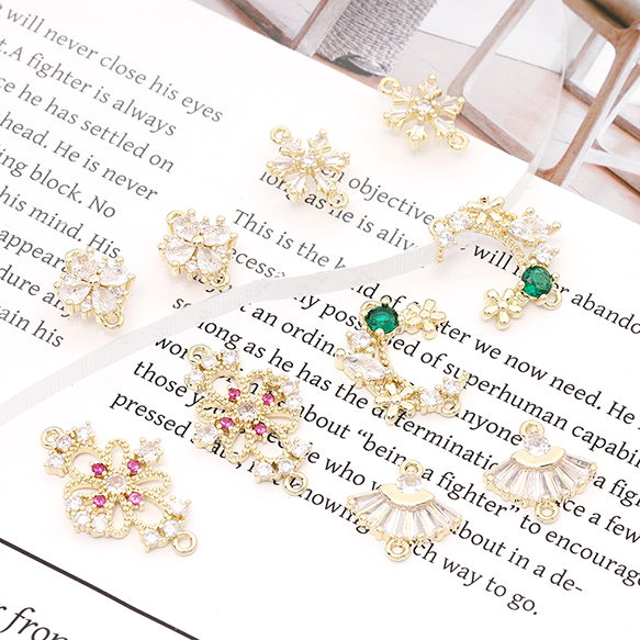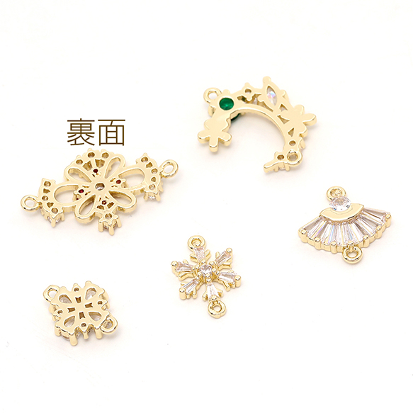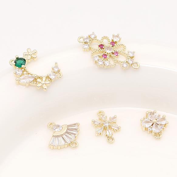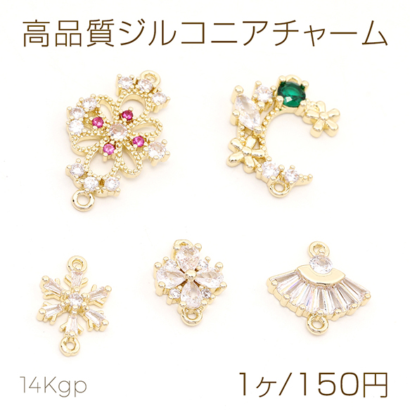 色褪せにくい14KGPゴールドメッキ 高品質ジルコニアチャーム フラワー 月型 クローバー 雪の結晶 扇型 2カン