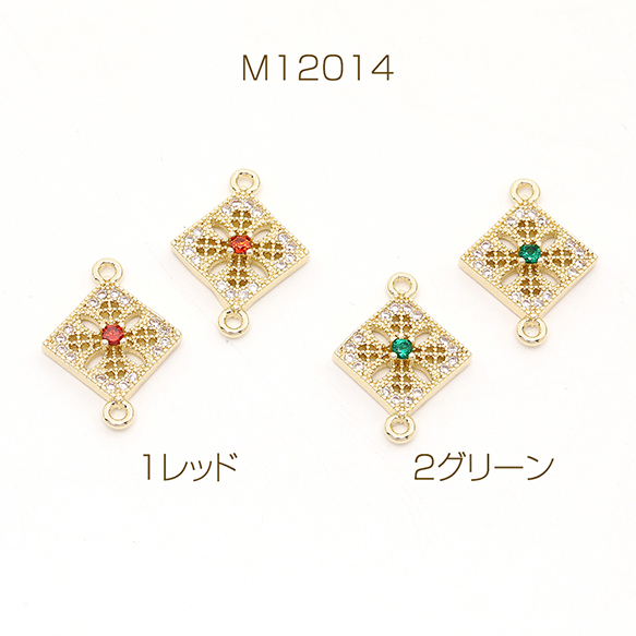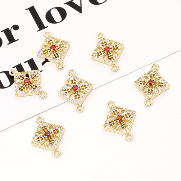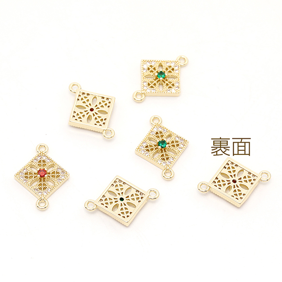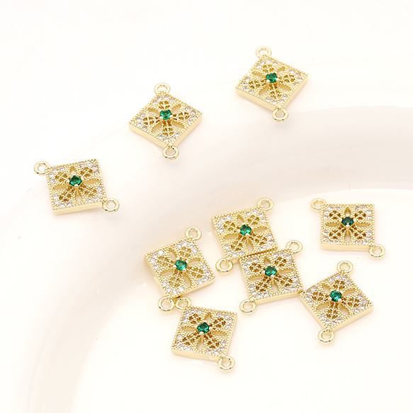 色褪せにくい14KGPゴールドメッキ 高品質ジルコニアチャーム ひし形 2カン 13×17.5mm(2ヶ)