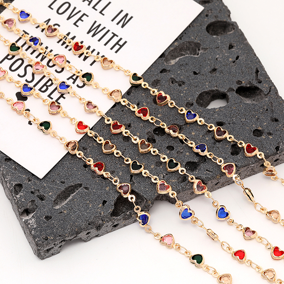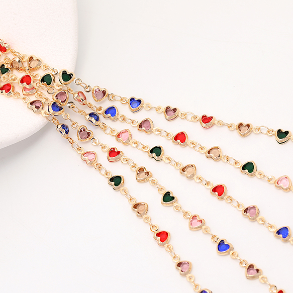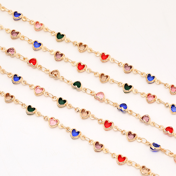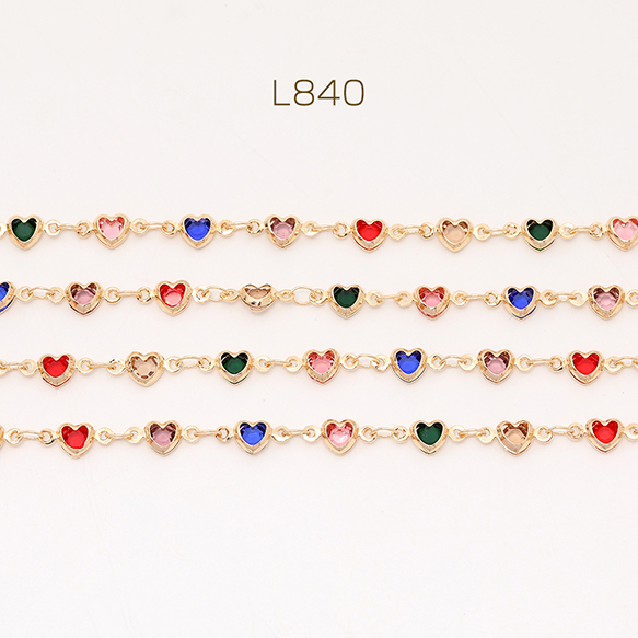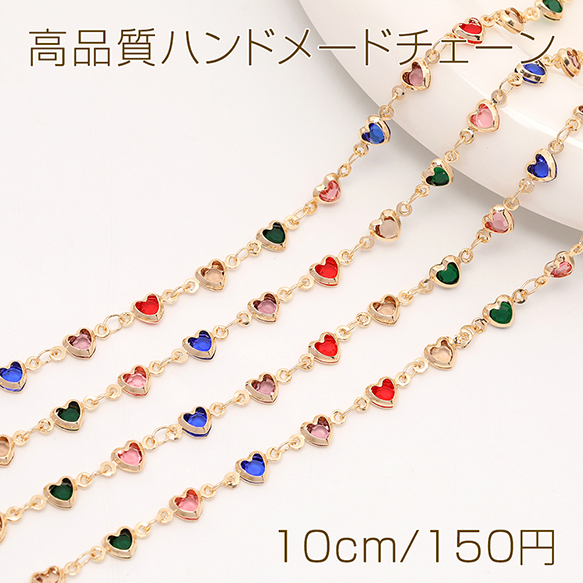 高品質ハンドメードチェーン ハート型 ガラスストーン付き ミックスカラー ゴールド 5×10mm(10cm)