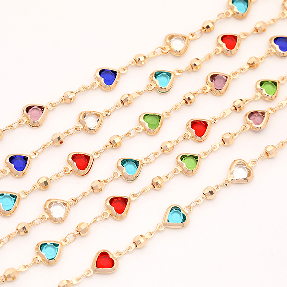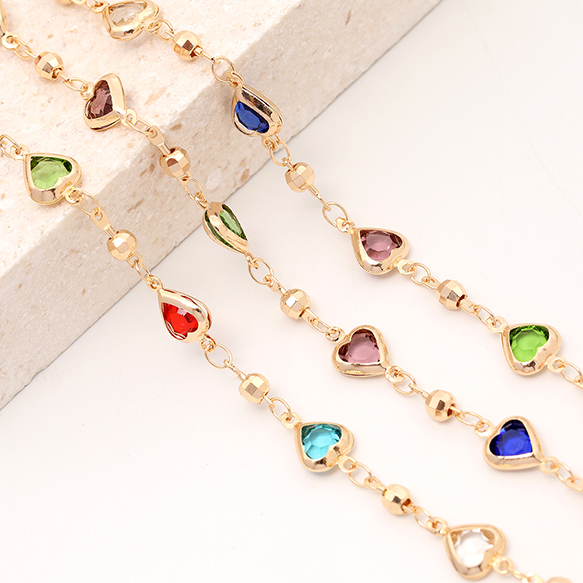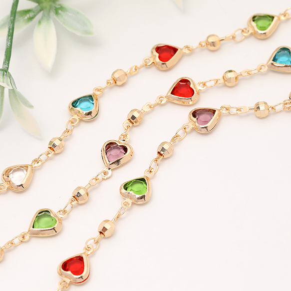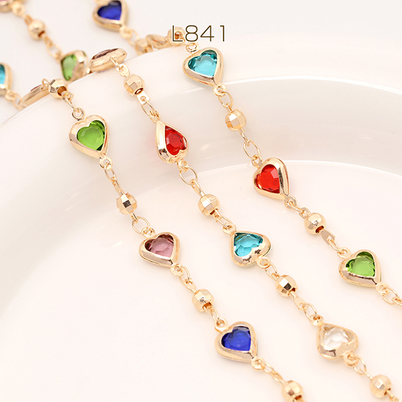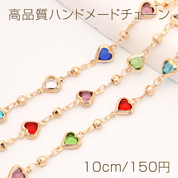 高品質ハンドメードチェーン ハート型 ガラスストーン付き ミックスカラー ゴールド 7×12.5mm(10cm)
