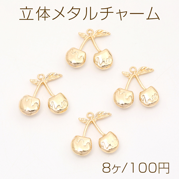 立体メタルチャーム さくらんぼモチーフ カン付き ゴールド 20×21mm(8ヶ)