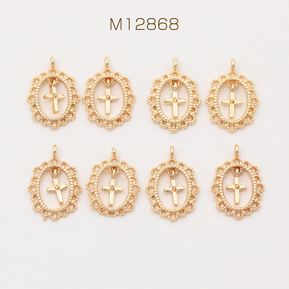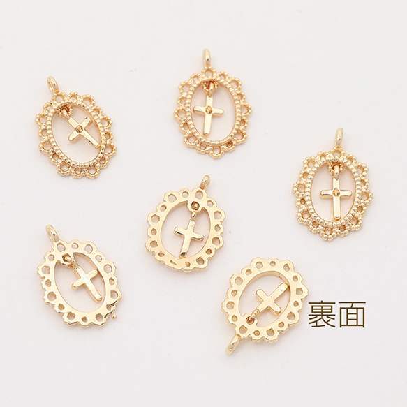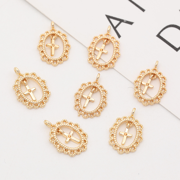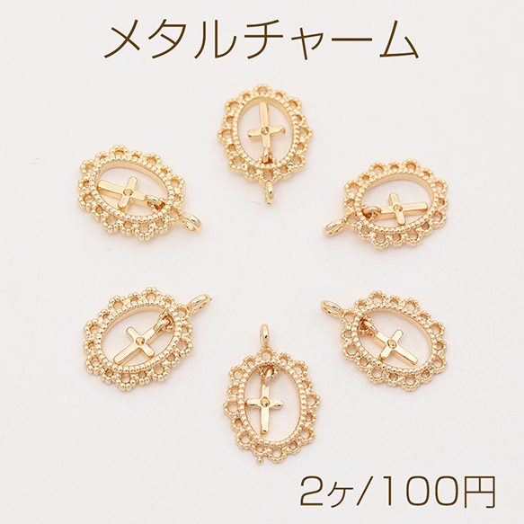 色褪せにくい14KGPゴールドメッキ メタルチャーム レースオーバル クロス付き 1カン 9×14mm(2ヶ)