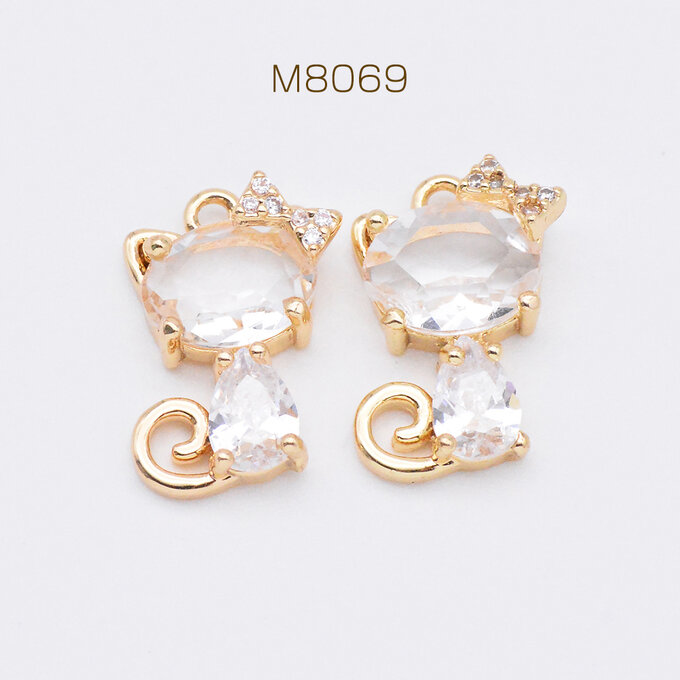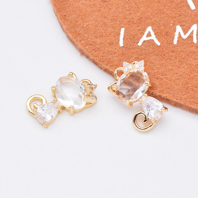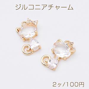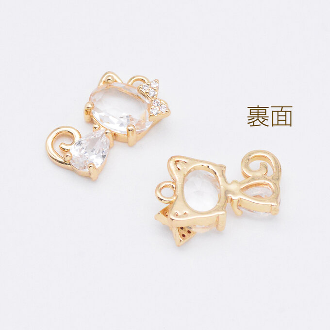 ジルコニアチャーム 猫チャーム 1カン付き 12×15mm ゴールド クリスタル(2ヶ)