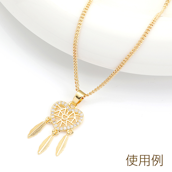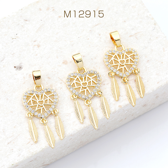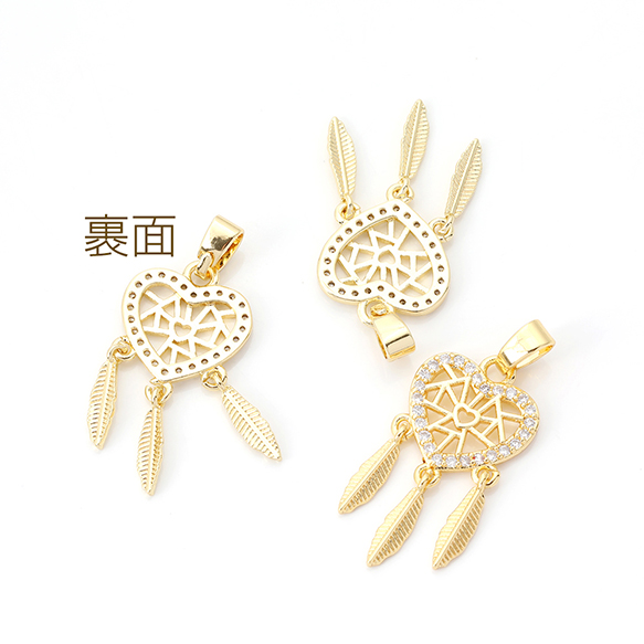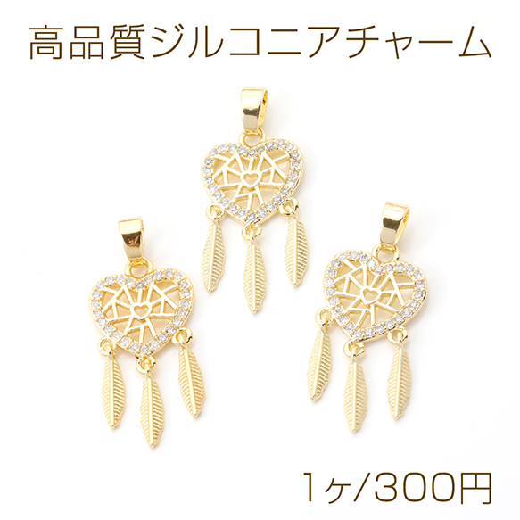 高品質ジルコニアチャーム ハート型 羽タッセル付き ゴールド 13×24mm(1ヶ)