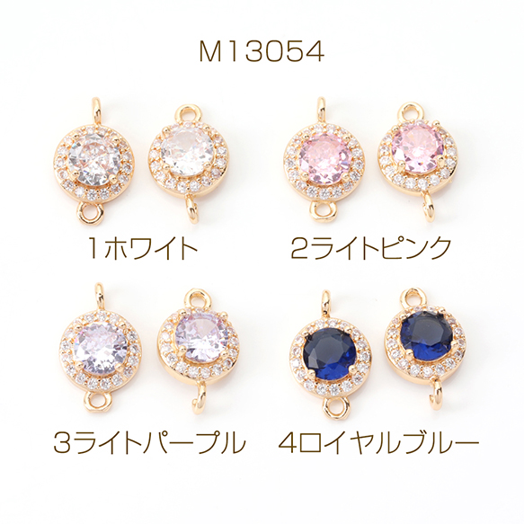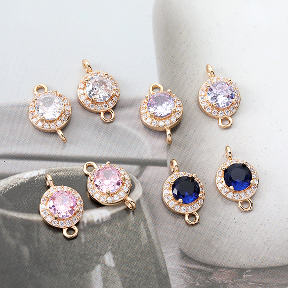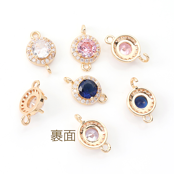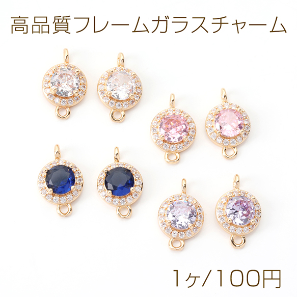 高品質フレームガラスチャーム ジルコニアストーンチャーム ガラスストーンチャーム コネクターチャーム ラウンド 円形 丸型 2カン付き ゴールド 9×15mm(1ヶ)