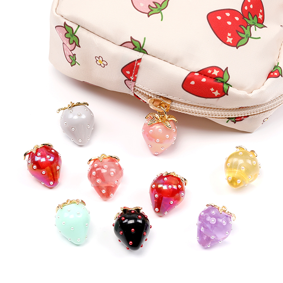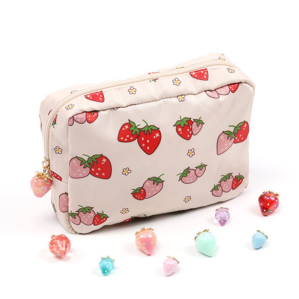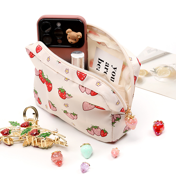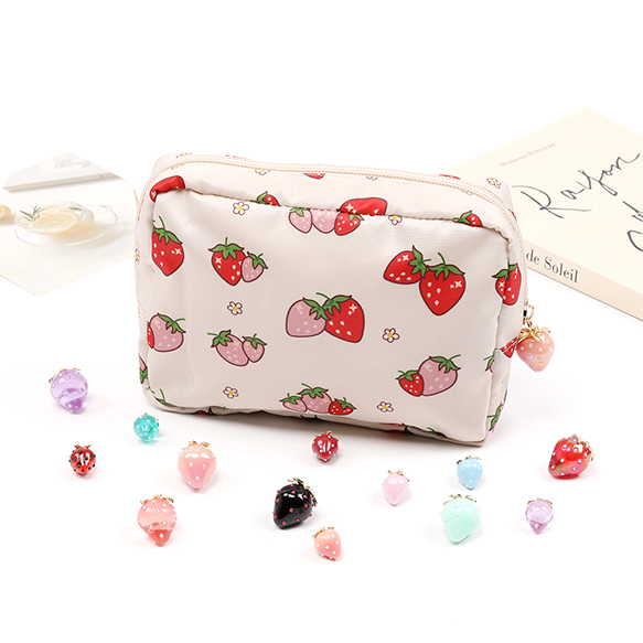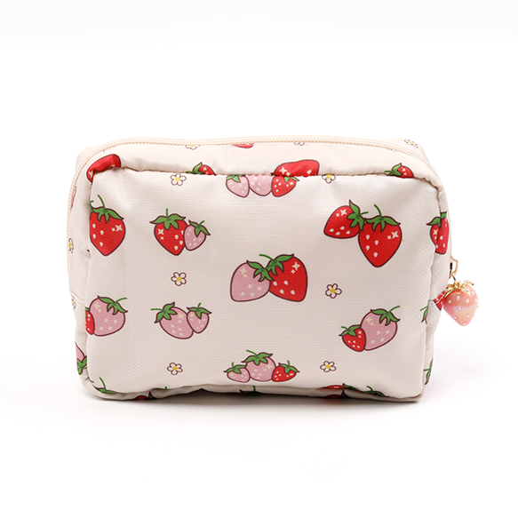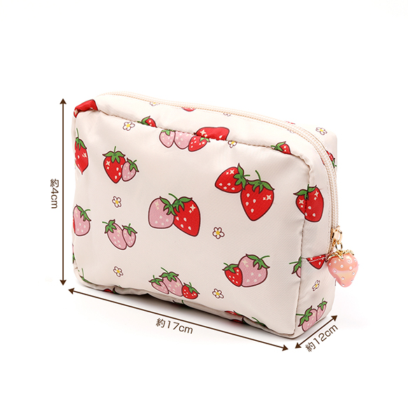 いちご柄コスメポーチ 化粧ポーチ 小物入れ ナプキン入れ いちごモチーフ 苺柄プリント いちごチャーム付き 収納バッグ