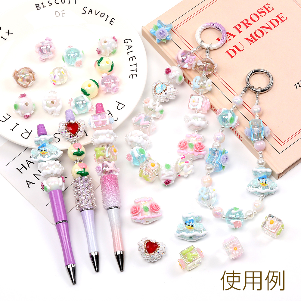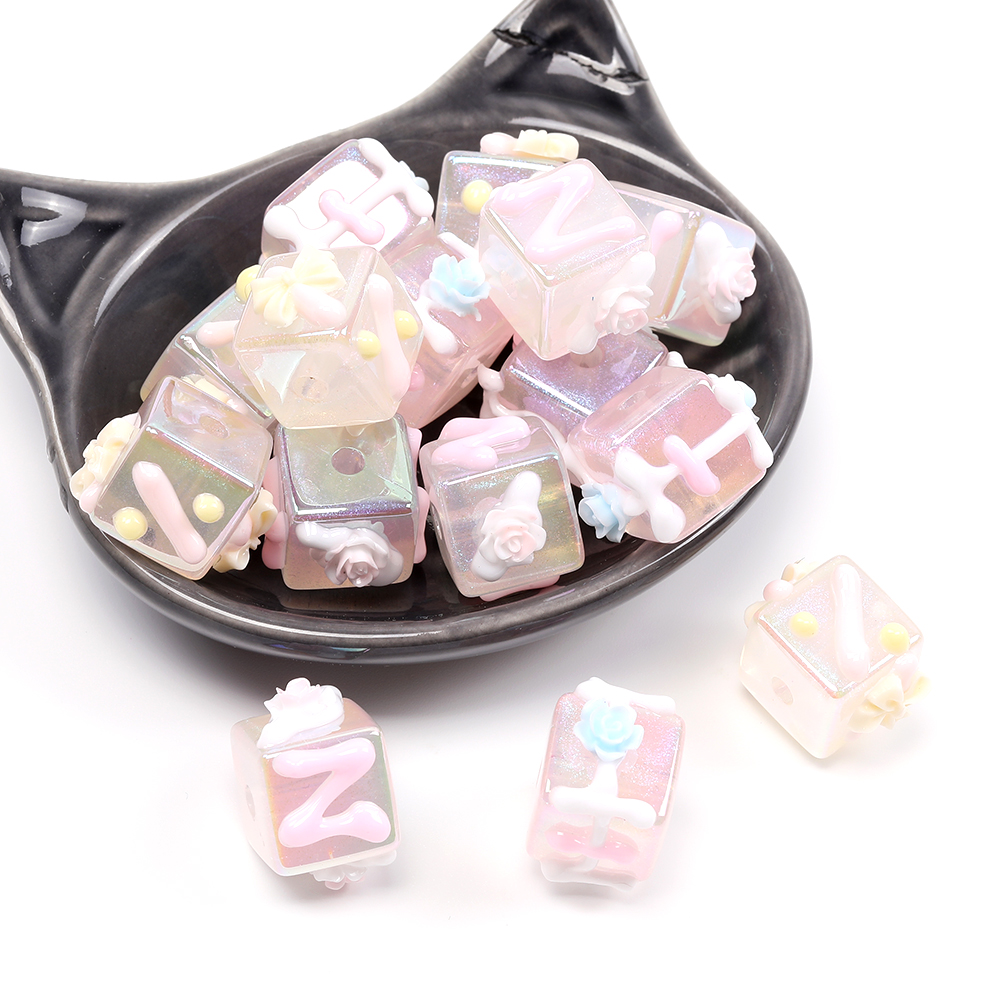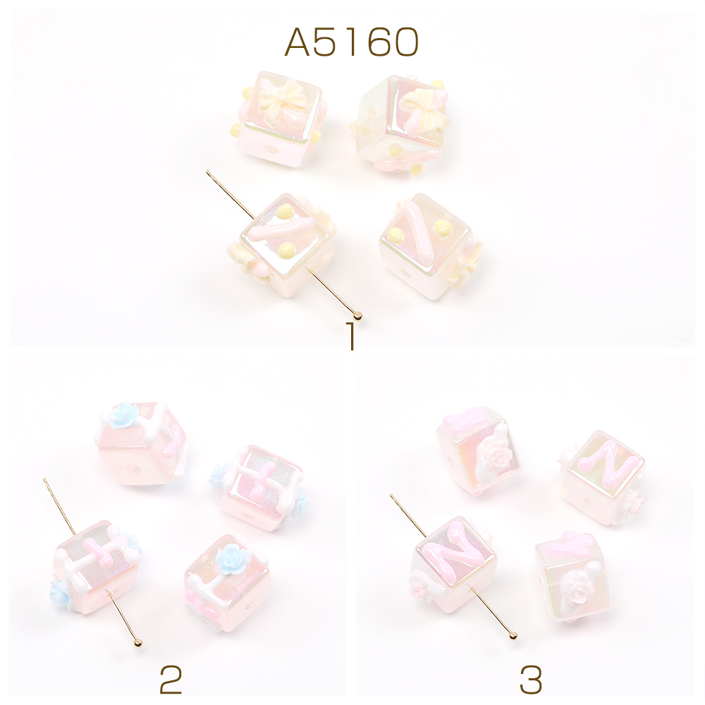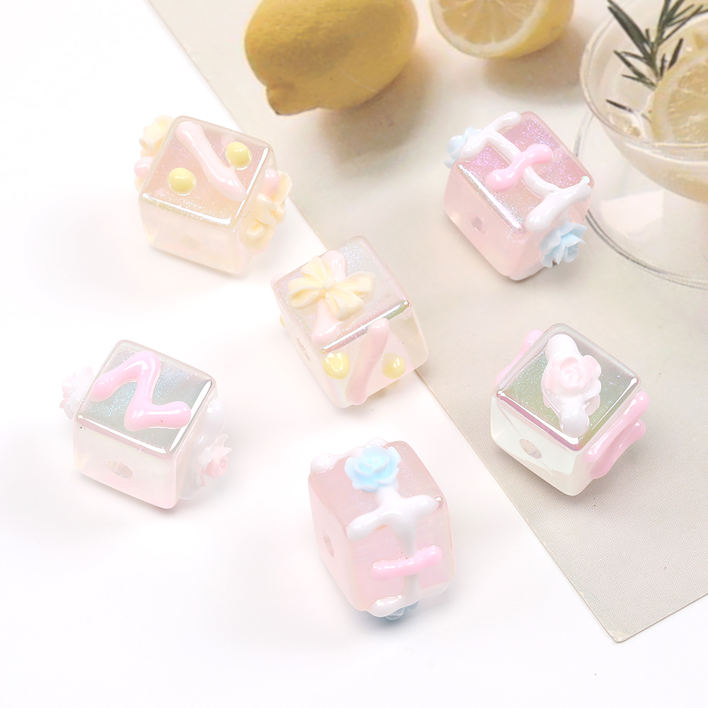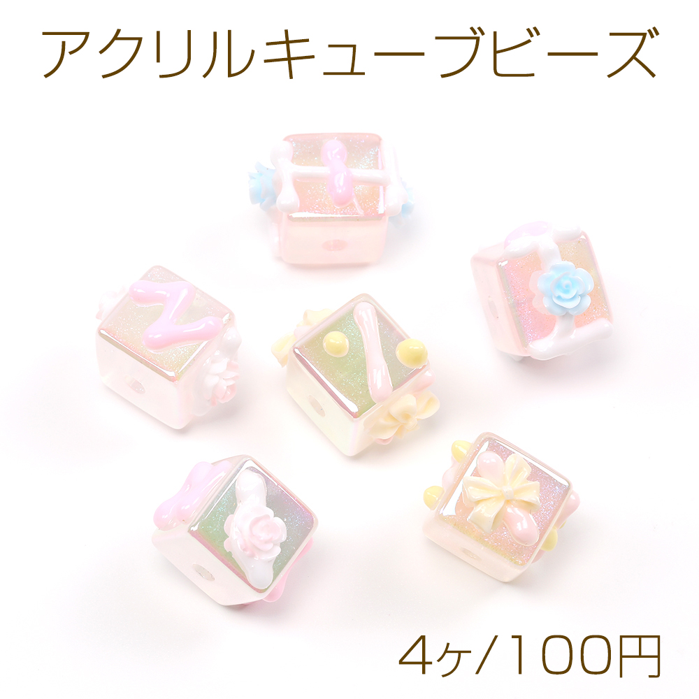 アクリルキューブビーズ 手描きアクリルビーズ キューブ型 スクエア型 通し穴あり 縦穴 リボン付き フラワー装飾 花装飾 フラワー付き 花付き 14×14mm