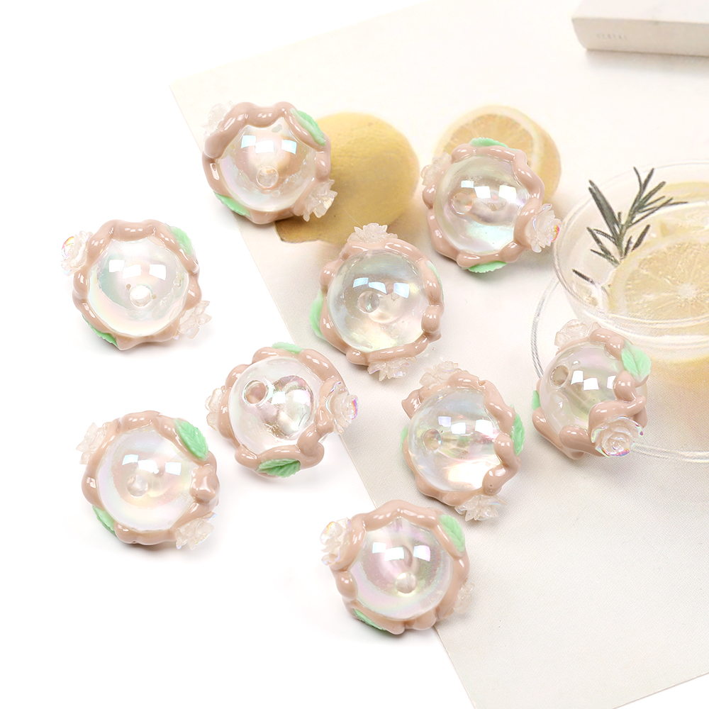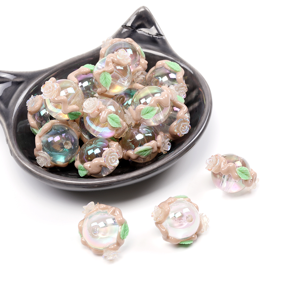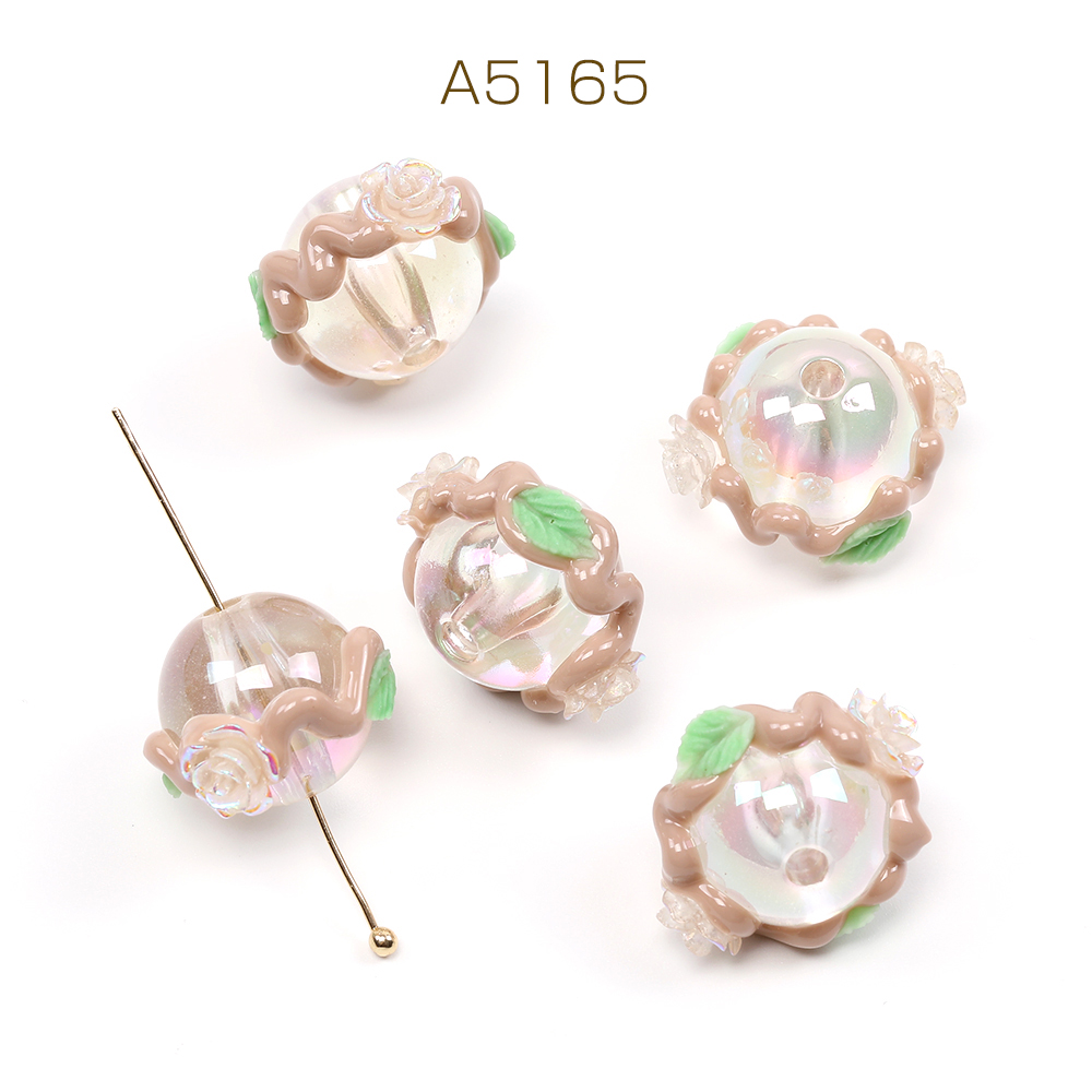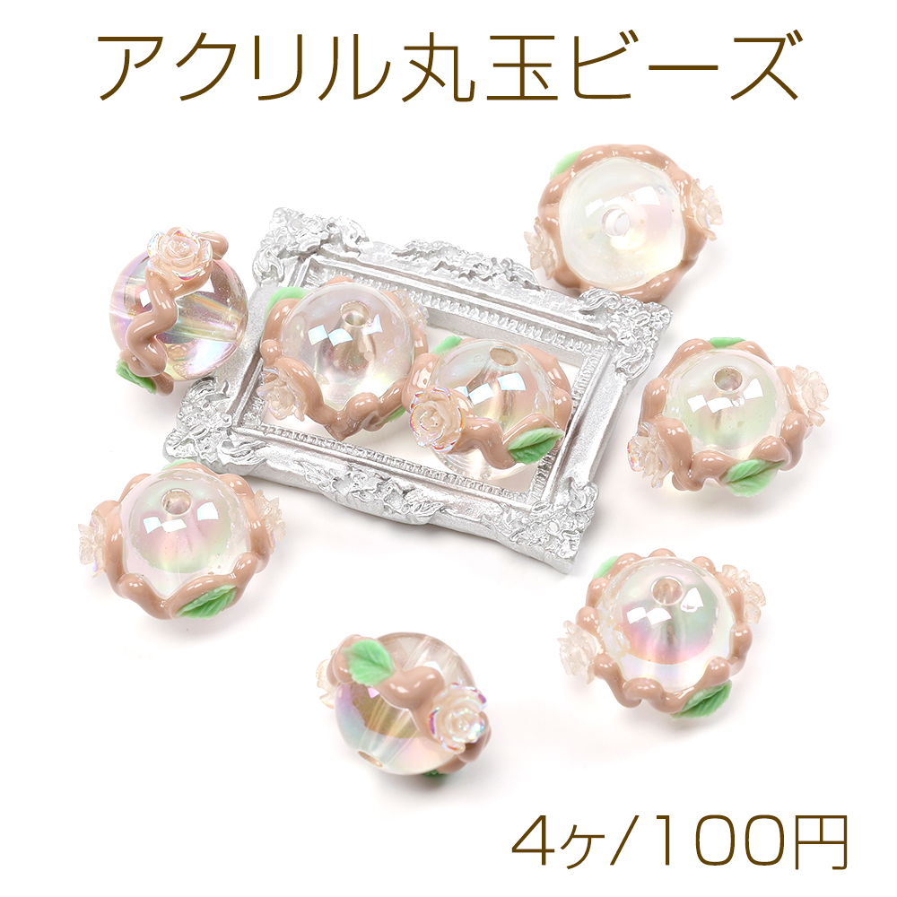 アクリル丸玉ビーズ 手描きアクリルビーズ 丸玉 ラウンド 円形 丸型 通し穴あり 縦穴 フラワー装飾 花装飾 フラワー付き 花付き 16mm(4ヶ)