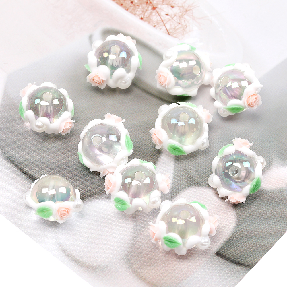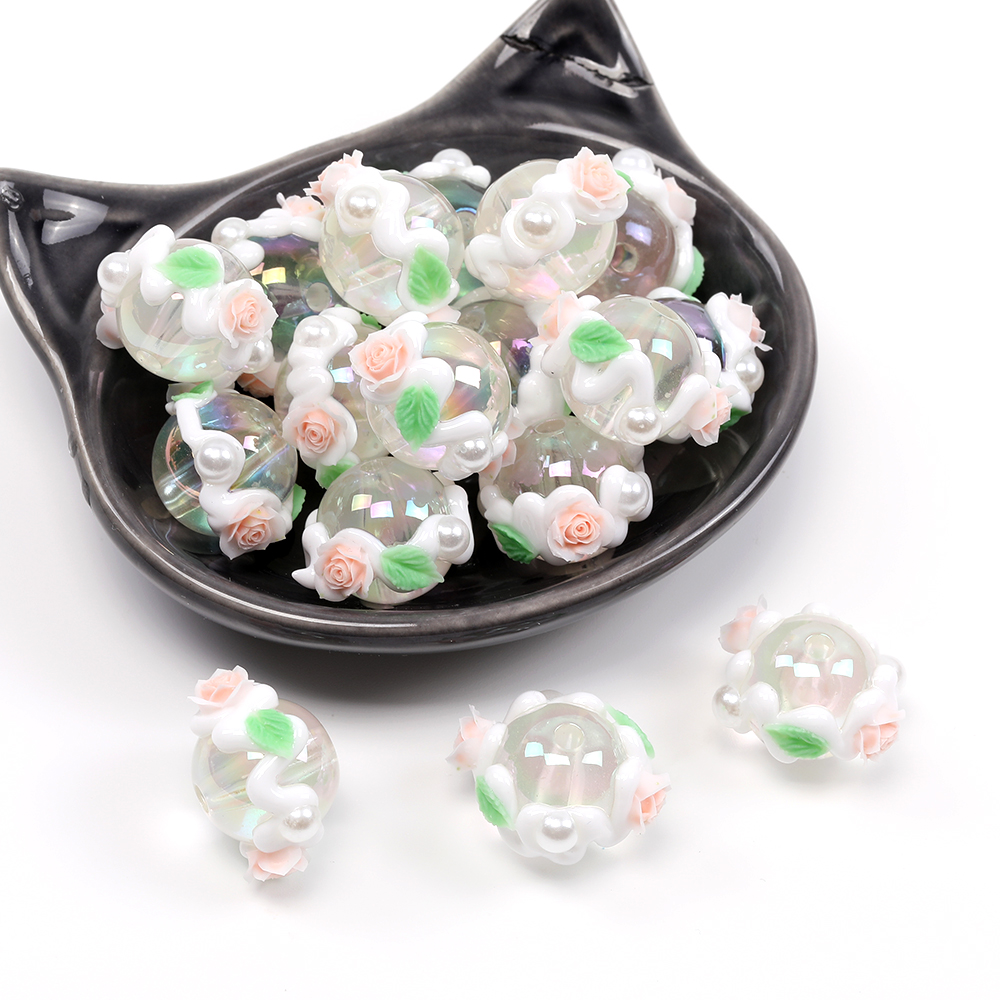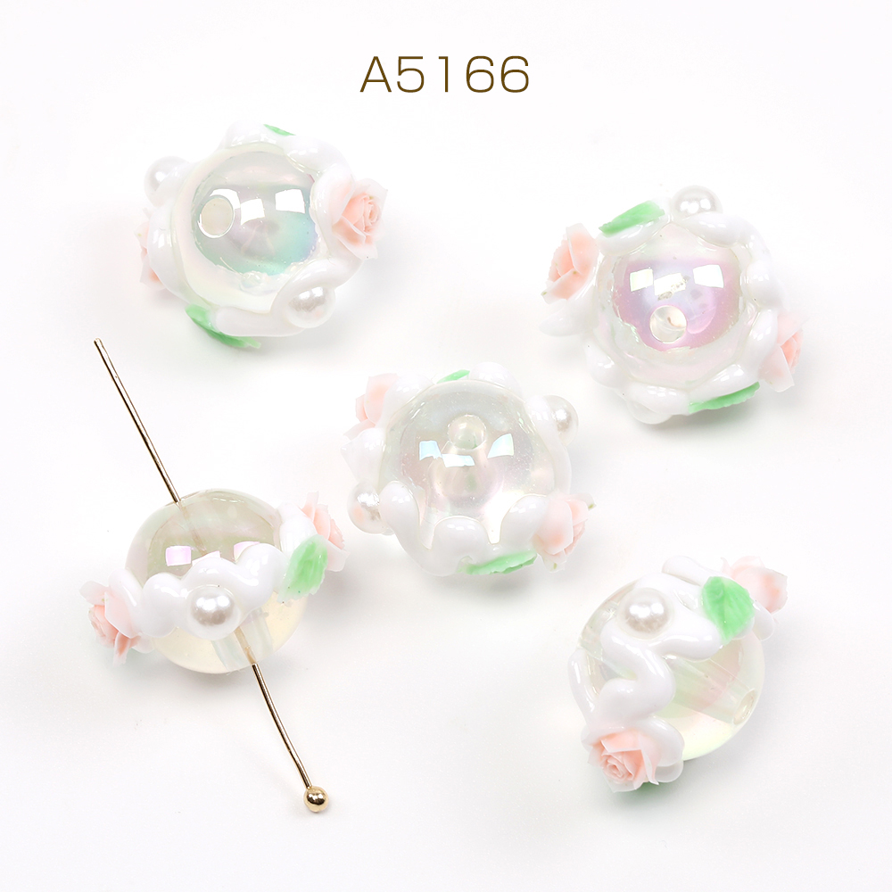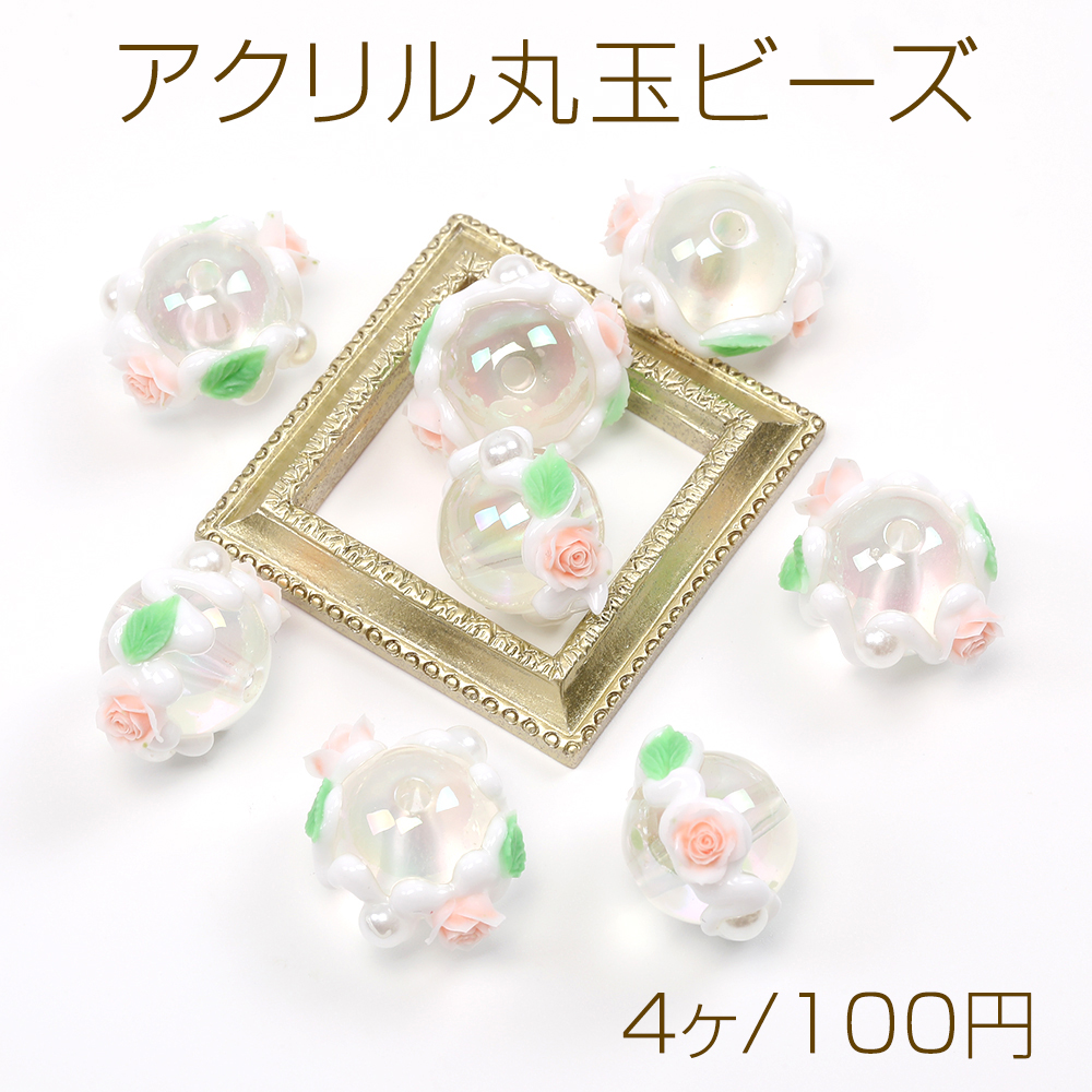 アクリル丸玉ビーズ 手描きアクリルビーズ 丸玉 ラウンド 円形 丸型 通し穴あり 縦穴 フラワー装飾 花装飾 フラワー付き 花付き 16mm(4ヶ)