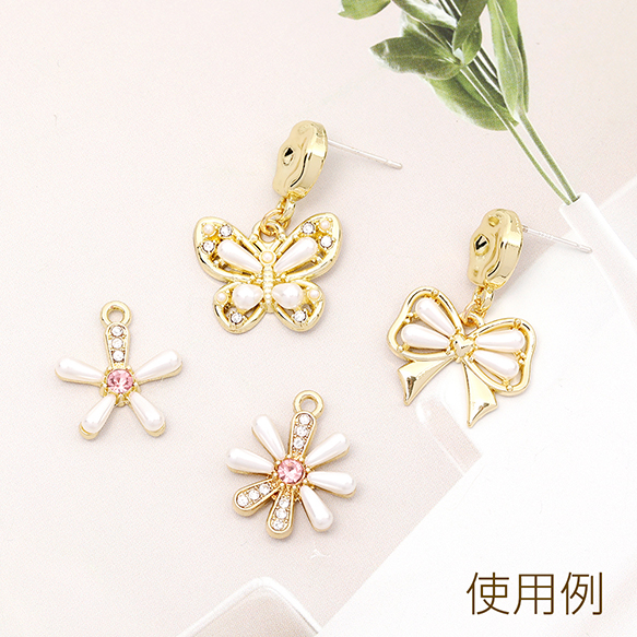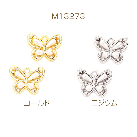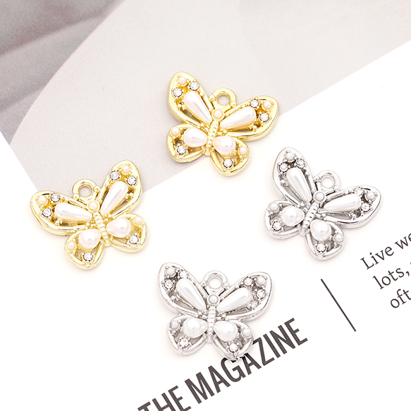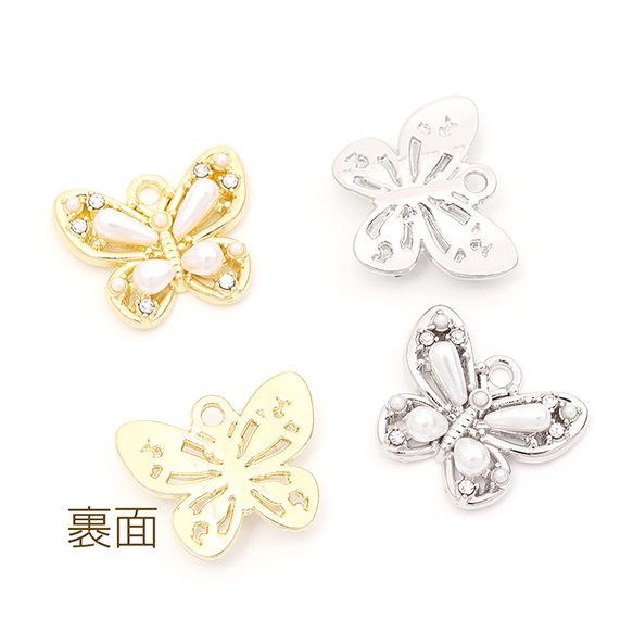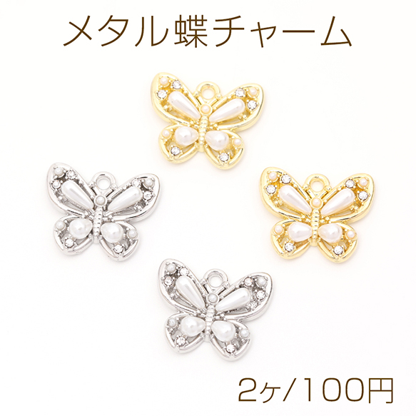 メタル蝶チャーム バタフライ 蝶モチーフ パールとラインストーン装飾 1カン付き 14×18mm(2ヶ)