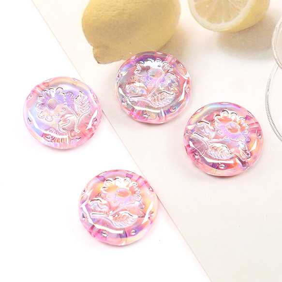 アクリルビーズ フラワー アンティーク調ビーズ 模様入り オーロラ加工 コイン型 通し穴あり 18mm(4ヶ)