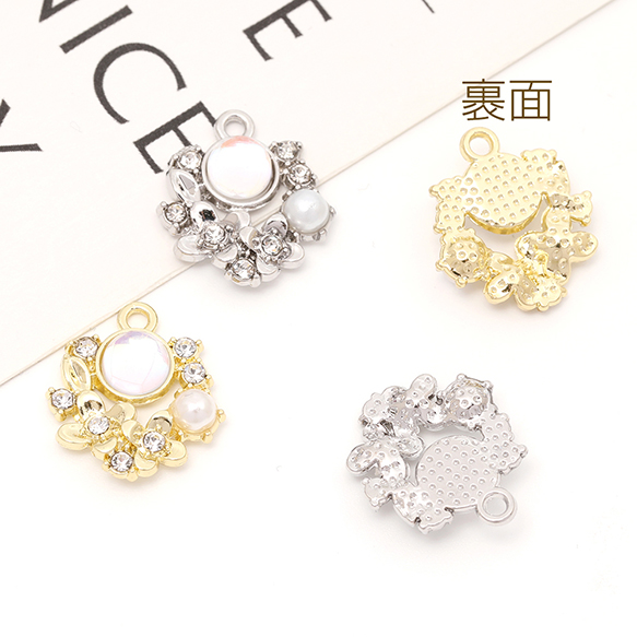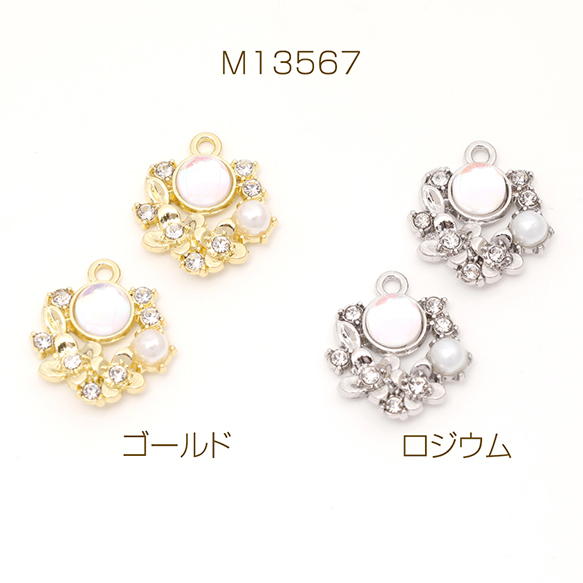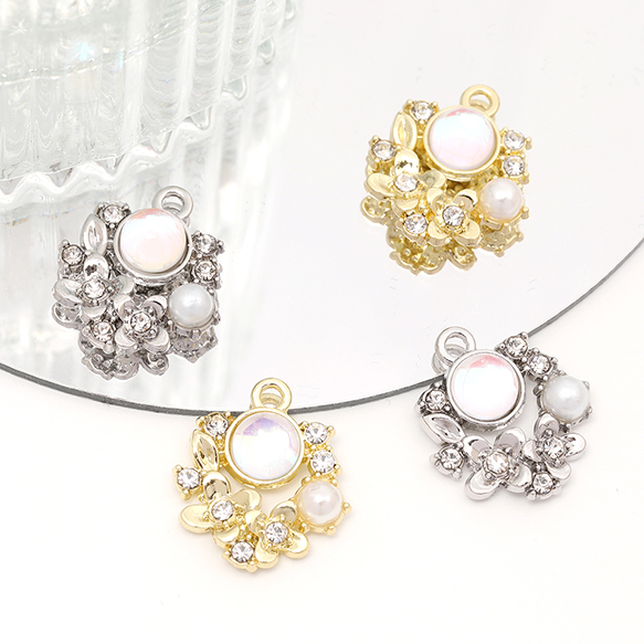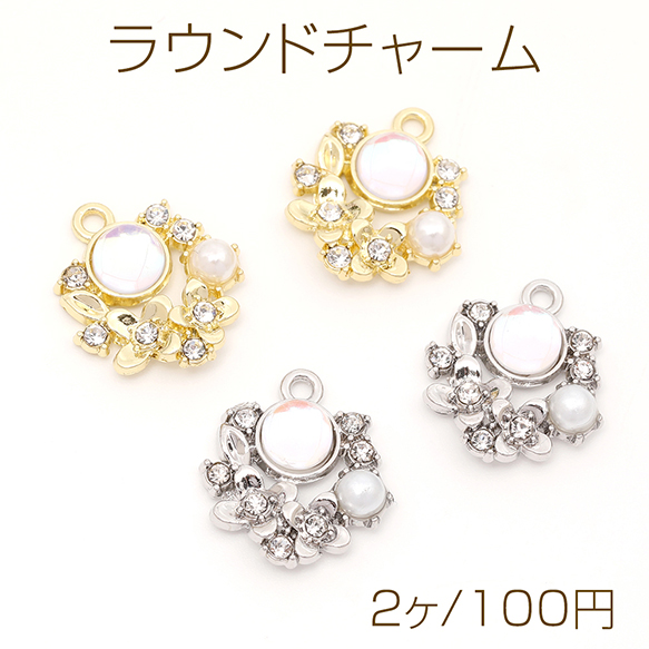ラウンドチャーム フラワー装飾 花装飾 パールとラインストーン付き 1カン付き オーロラカラー 約16×18mm(2ヶ)