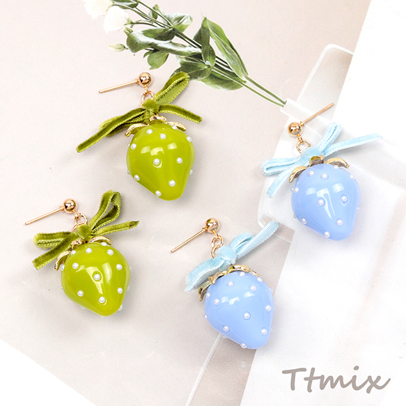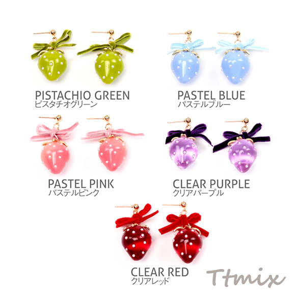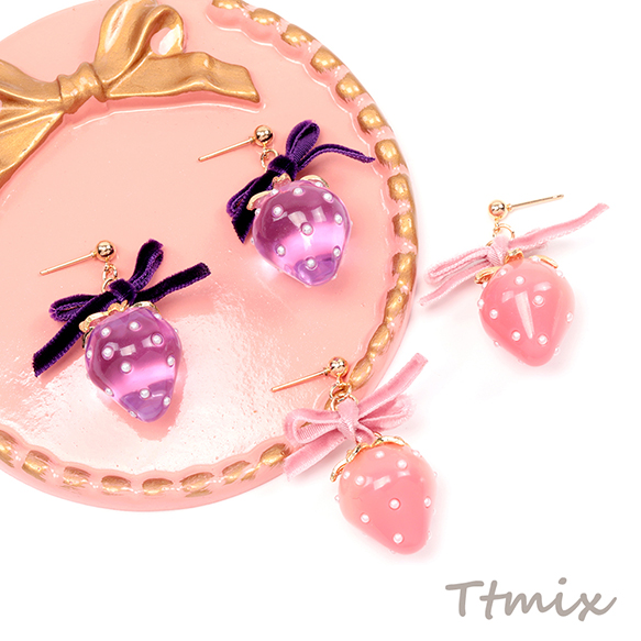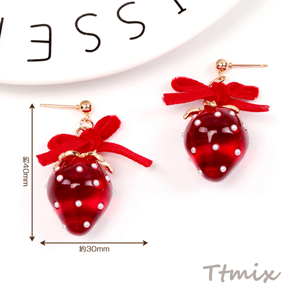 いちごのピアス 完成品 耳元に揺れるイチゴピアス いちごとリボンのピアス 約30×40mm (1ペア)